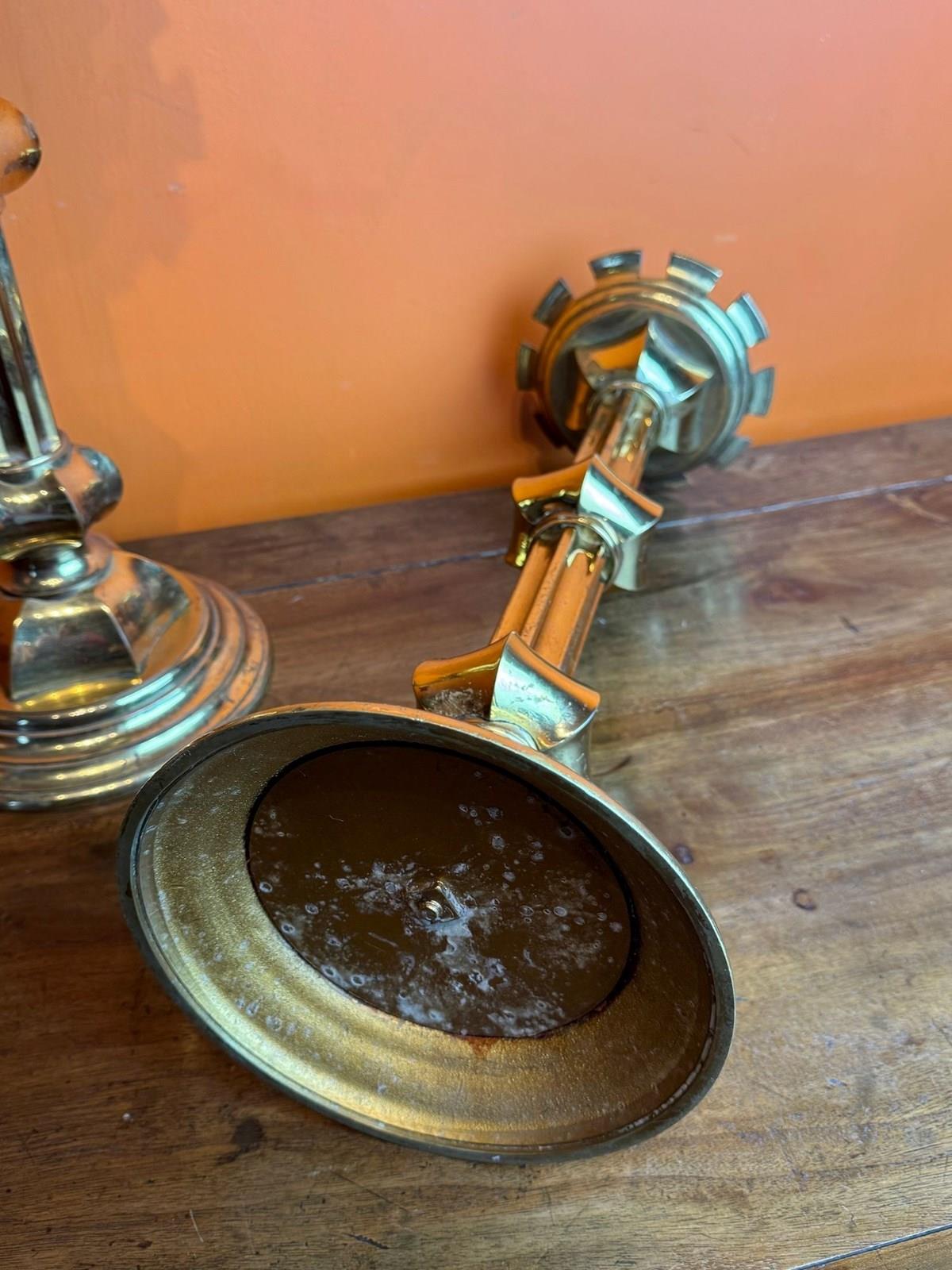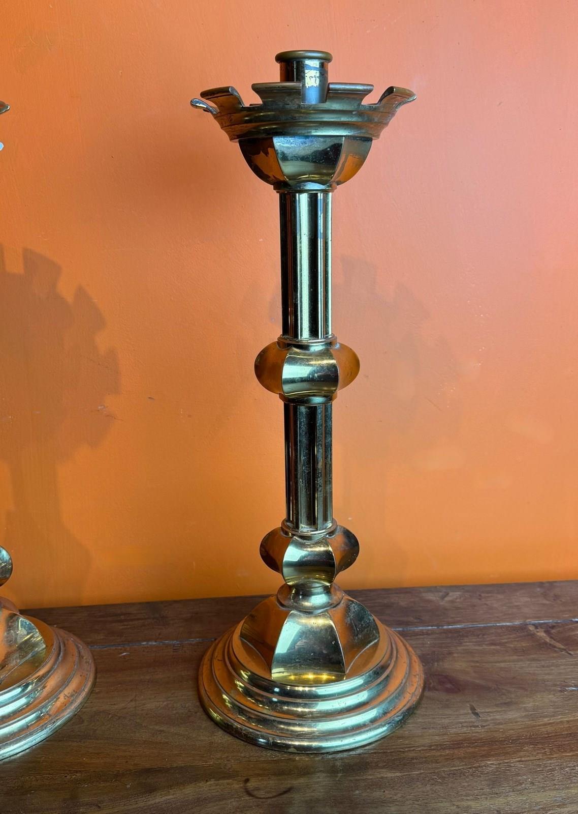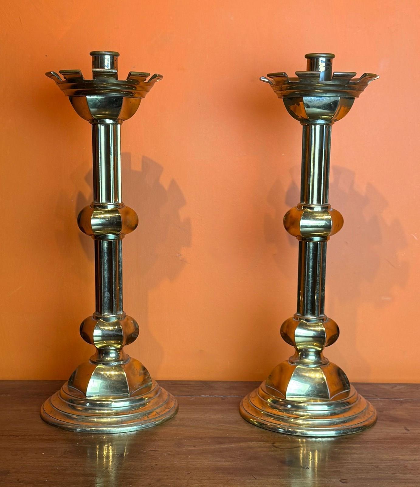 A substatial pair of gilt-brass ecclesiastical candlestics, the dished drip pans with castellated rims, upon knopped concave stems and raised on stepped circular base.