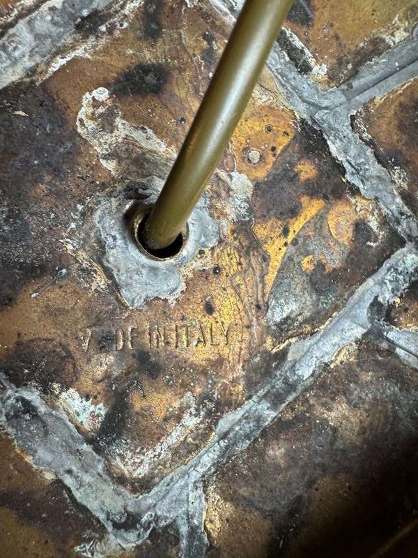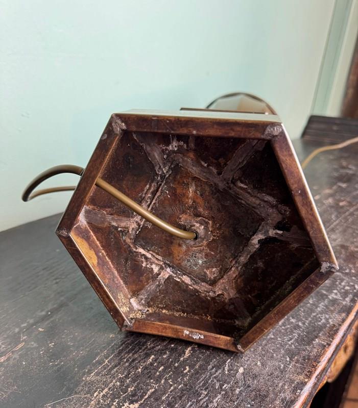A large pair of Italian patinated brass table lamps, 2nd half 20th century, of urn form upon hexagonal pedestal base.