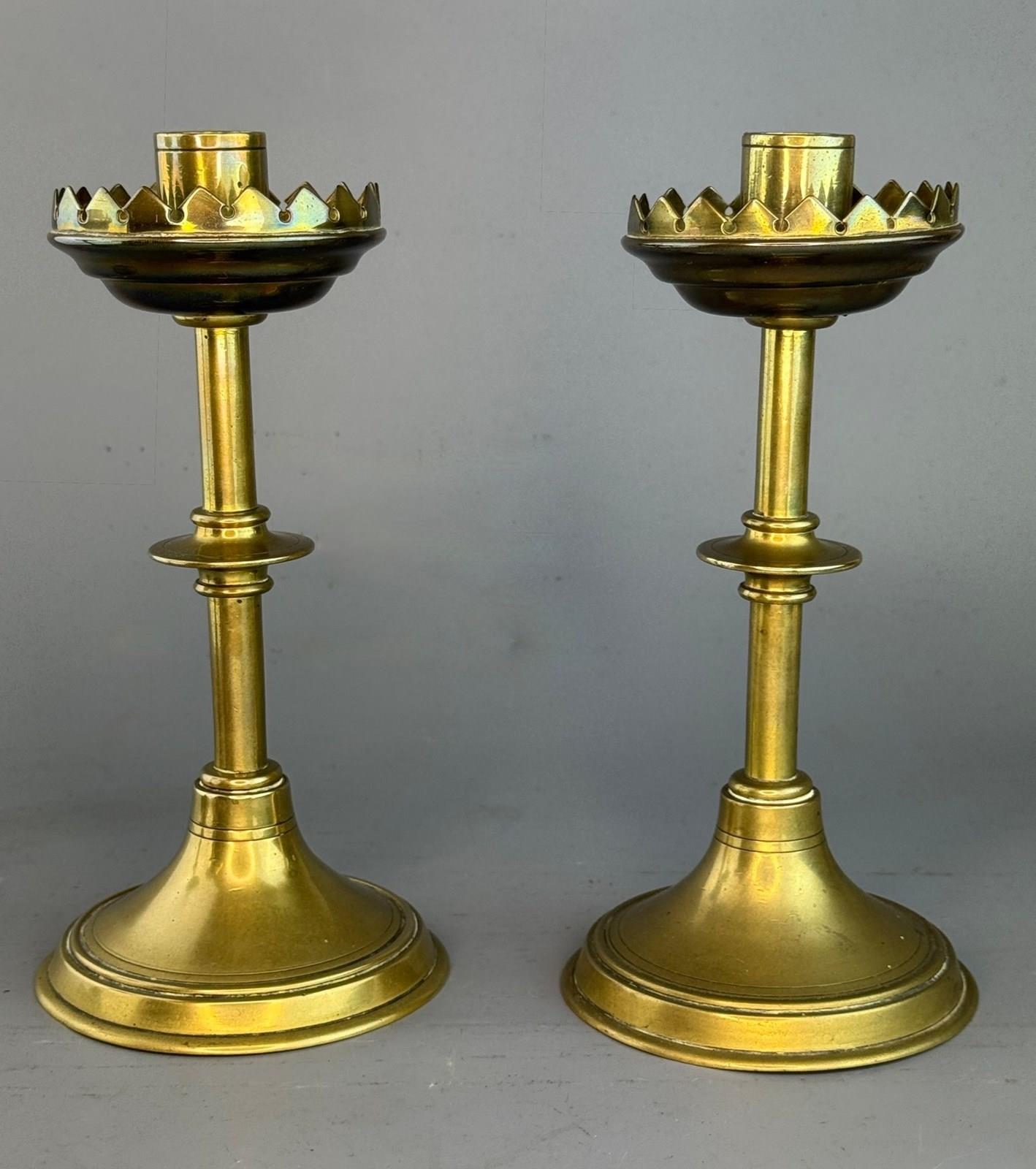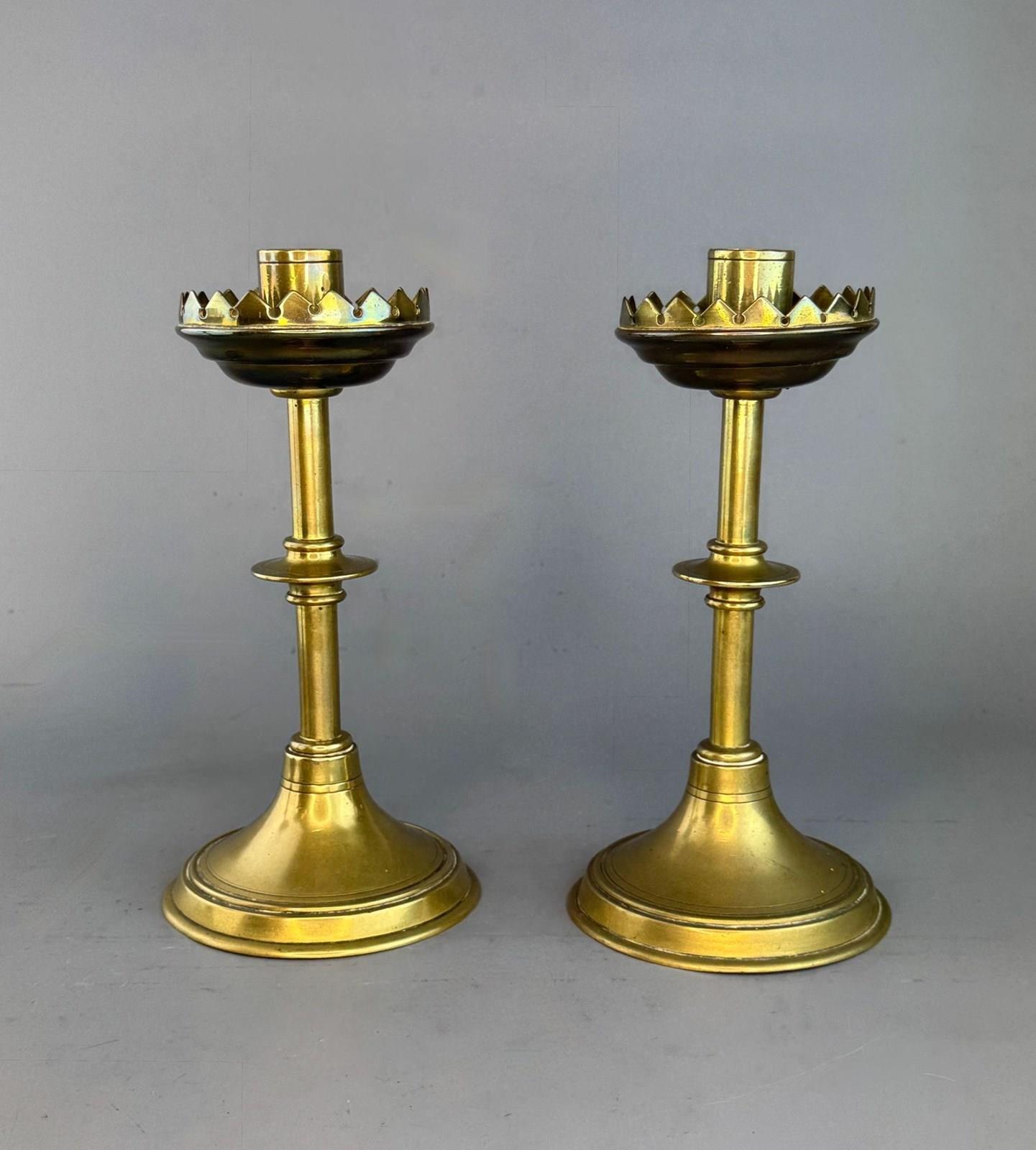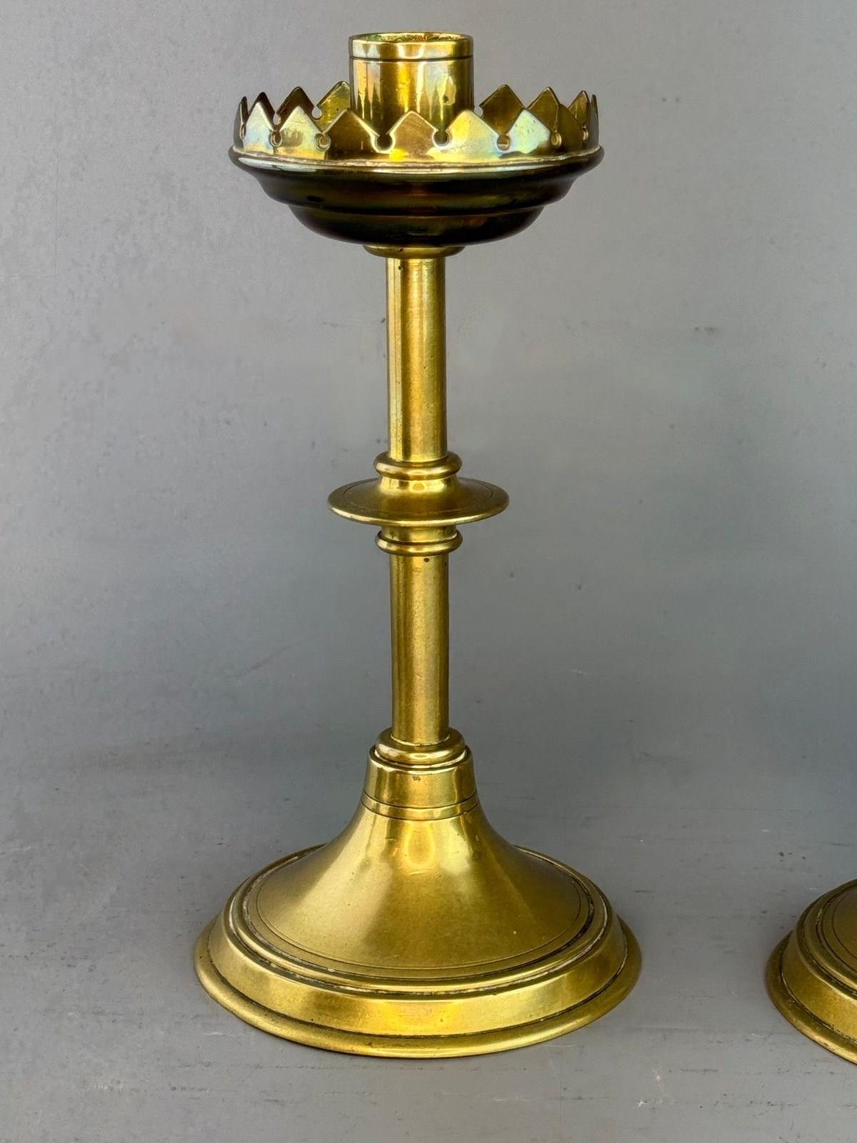 A pair of Victorian brass candlesticks circa 1880, of Gothic design, with castelated drip pans and knopped stems terminating in a spreading foot.