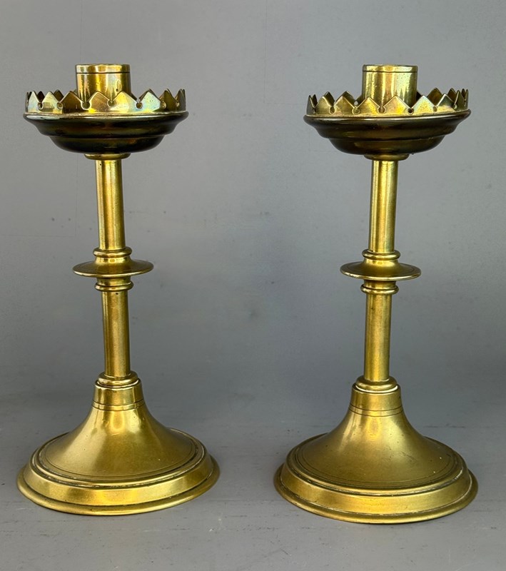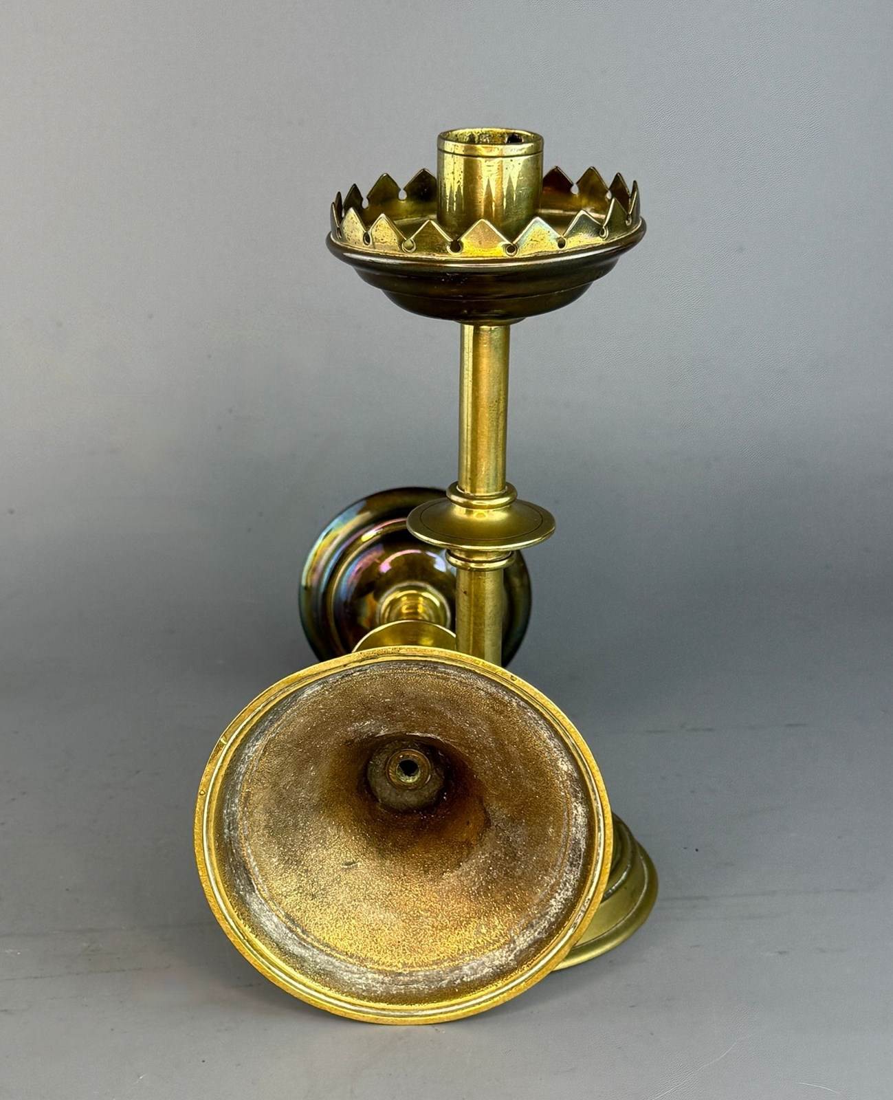 Pair Of Victorian Brass Candlesticks Of Gothic Design