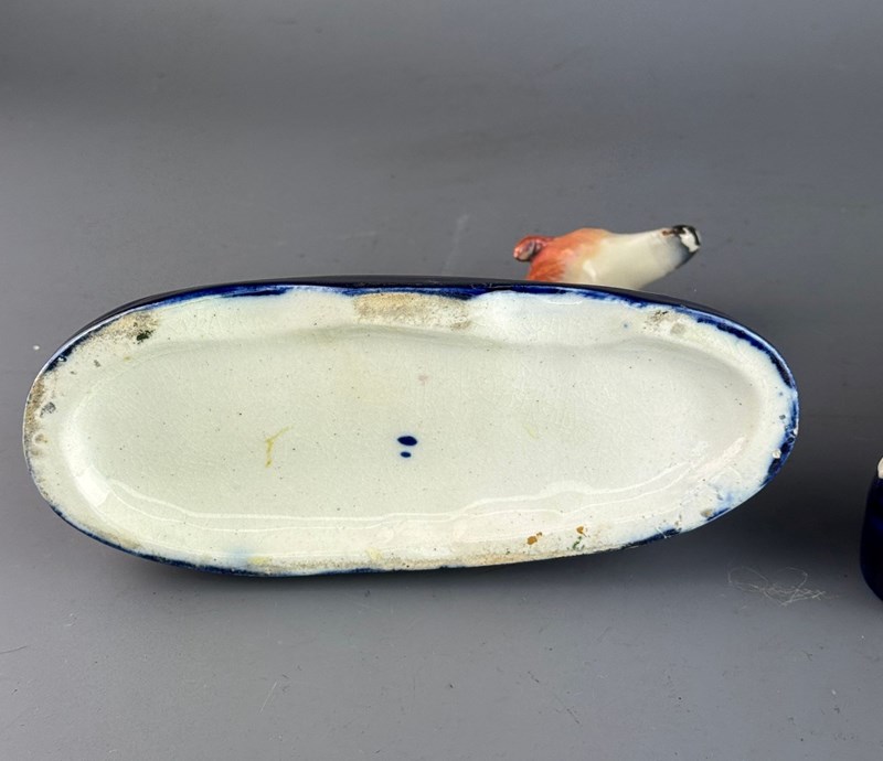 A pair of Victorian Staffordshire pottery quill holders, mid 19th Century, in the form of recembent whippets or greyhounds with crossed paws.