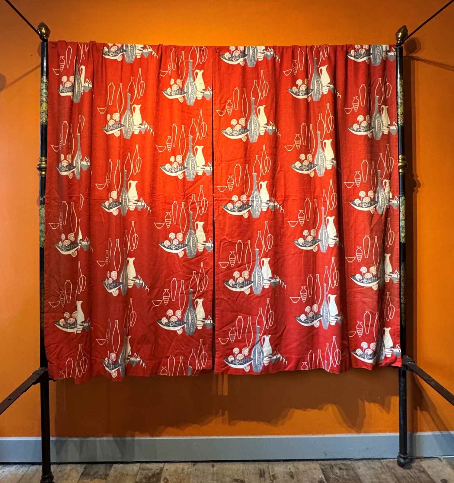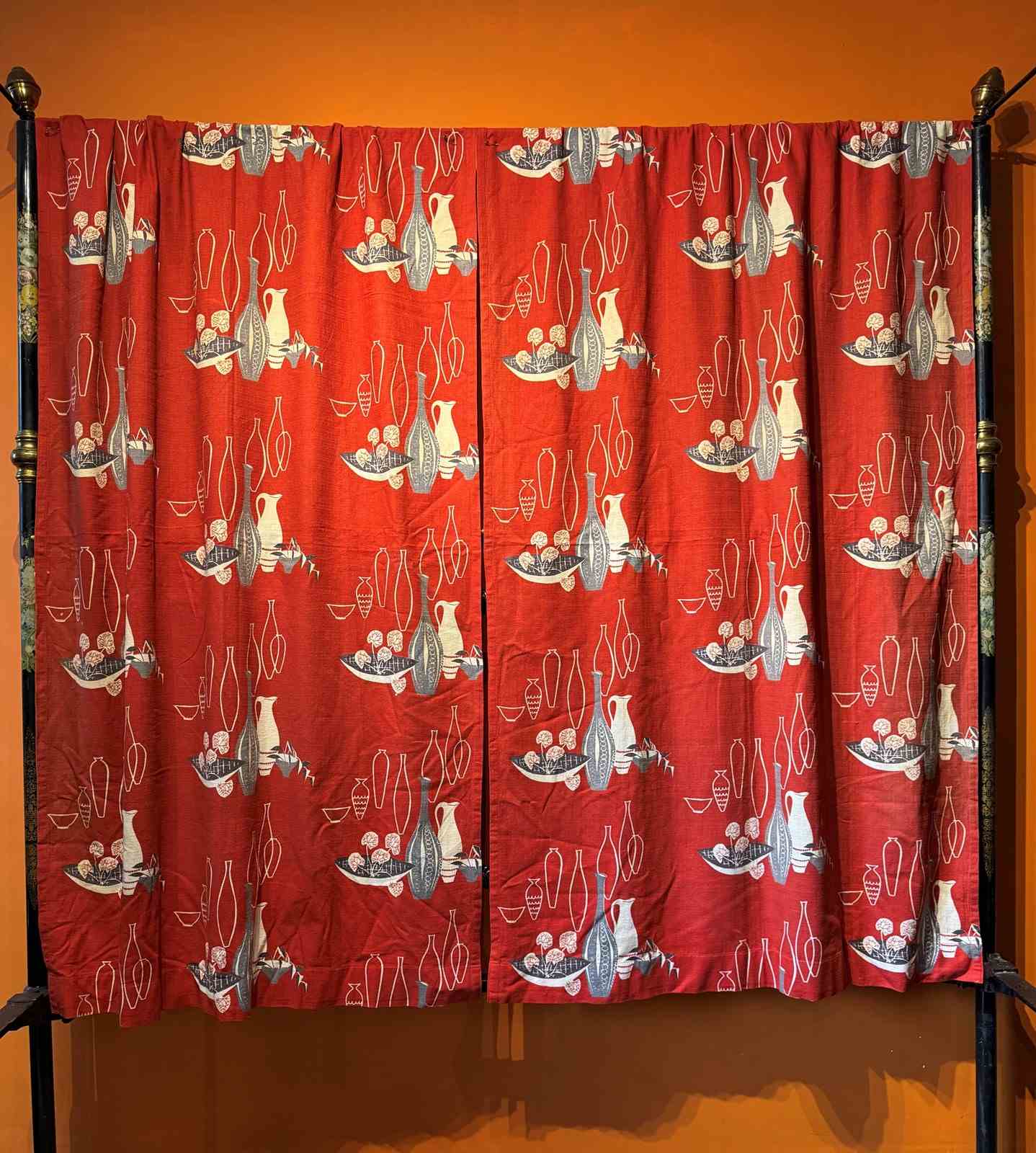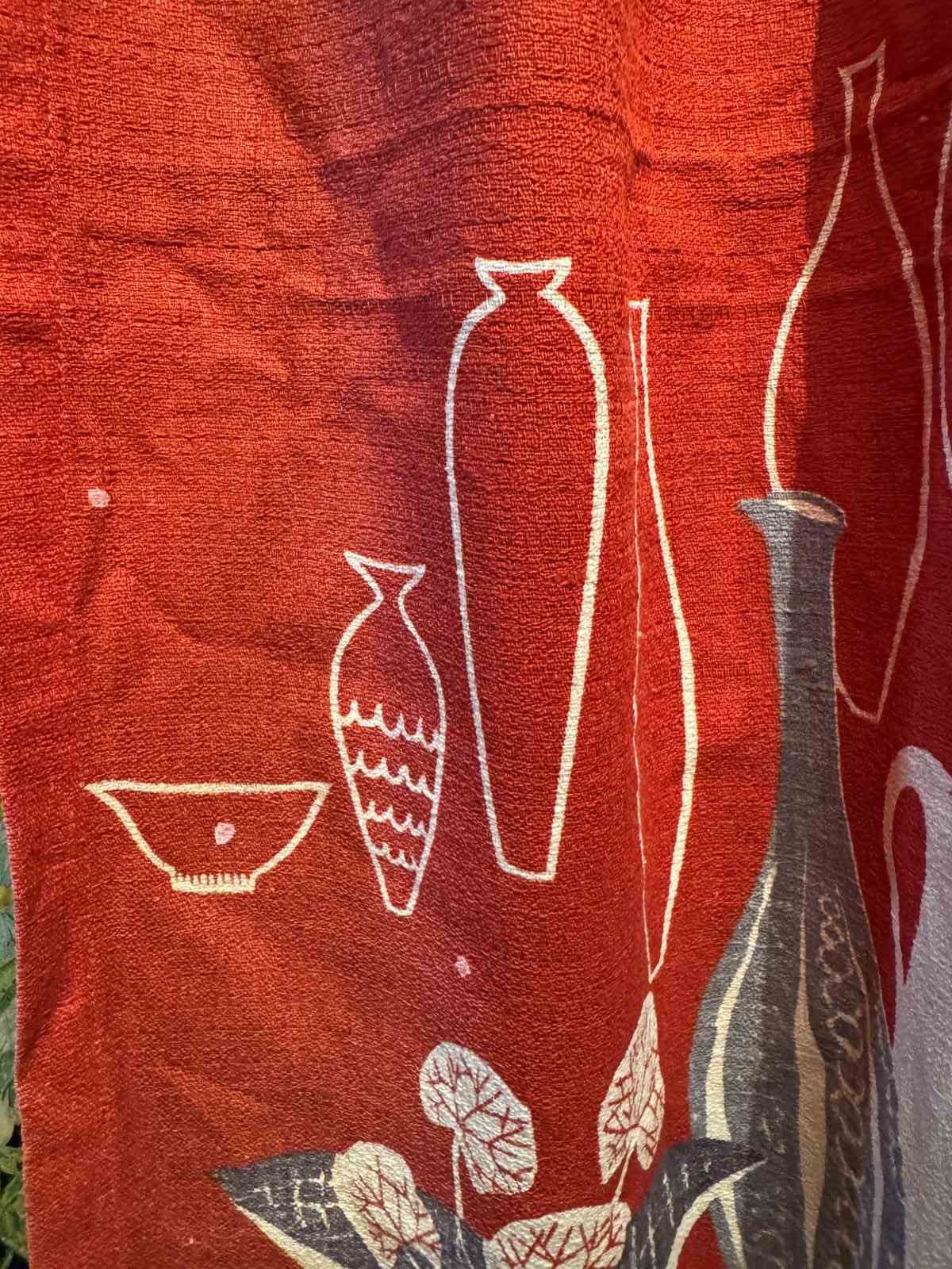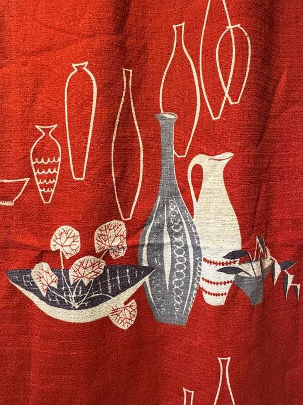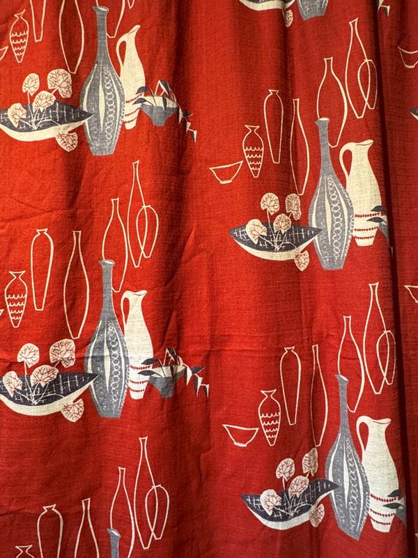 A pair of vintage 1950's barkcloth curtains, printed with jugs, vases and bowls in grey, black and white on a bright red ground.