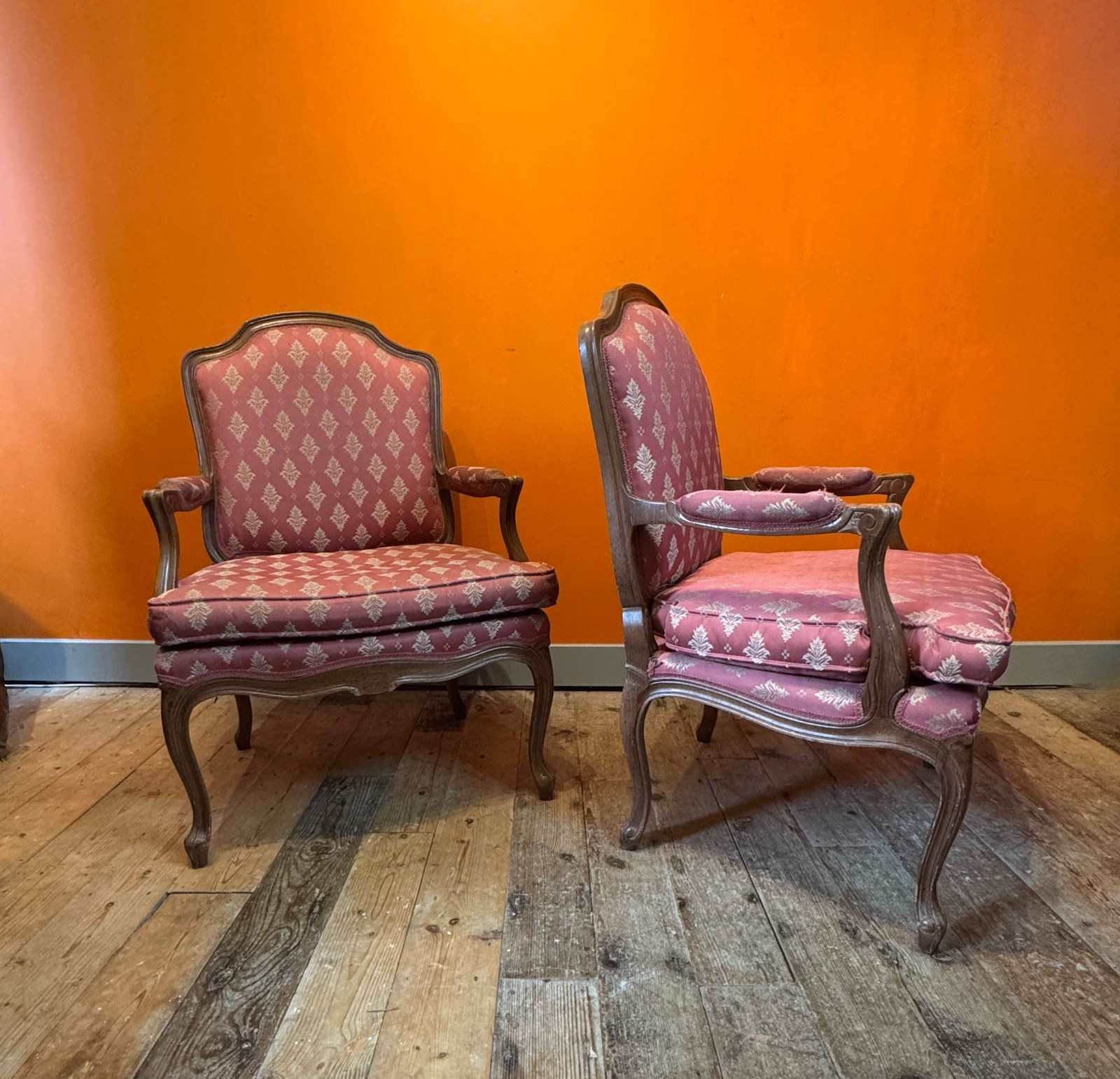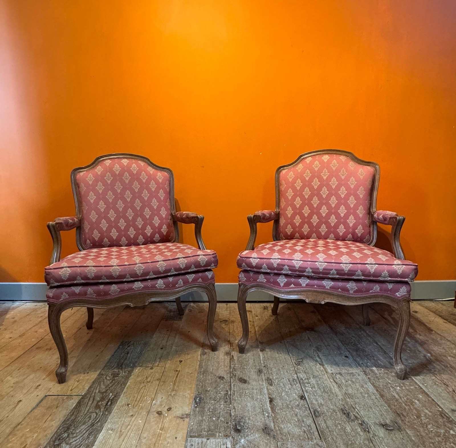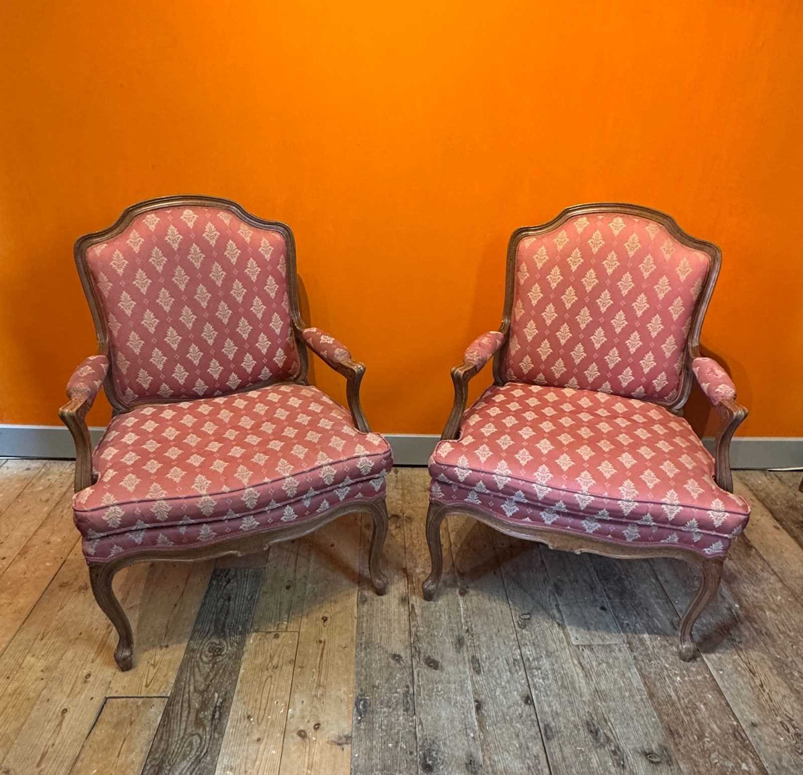 A pair of Vintage French fauteuils / open armchairs in Louis XV style, with chanel moulded walnut frames and of generous proportions, tablet backs and loose seat cushions.