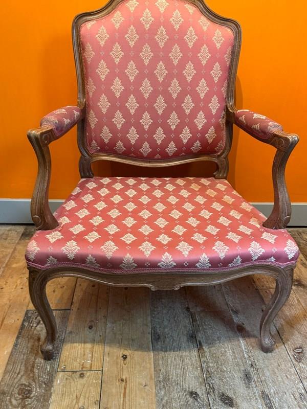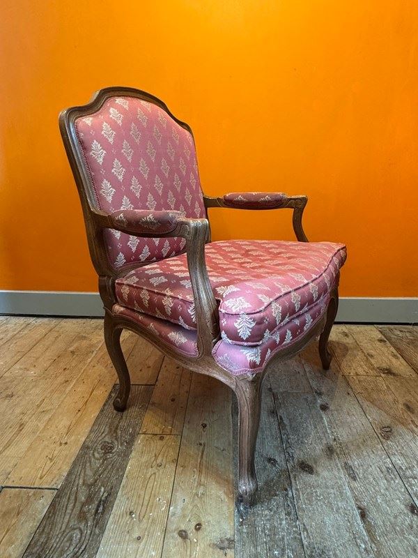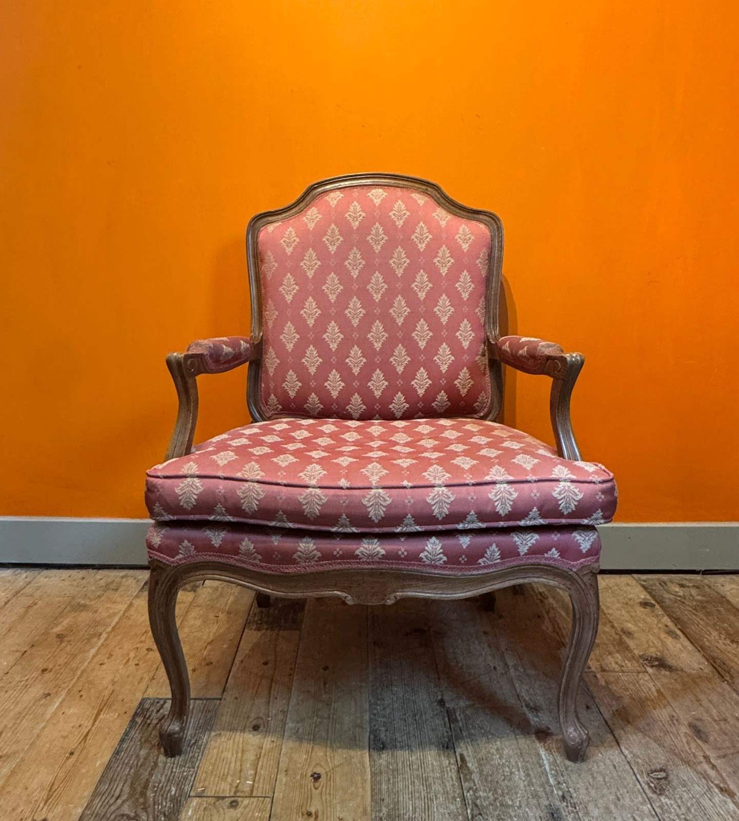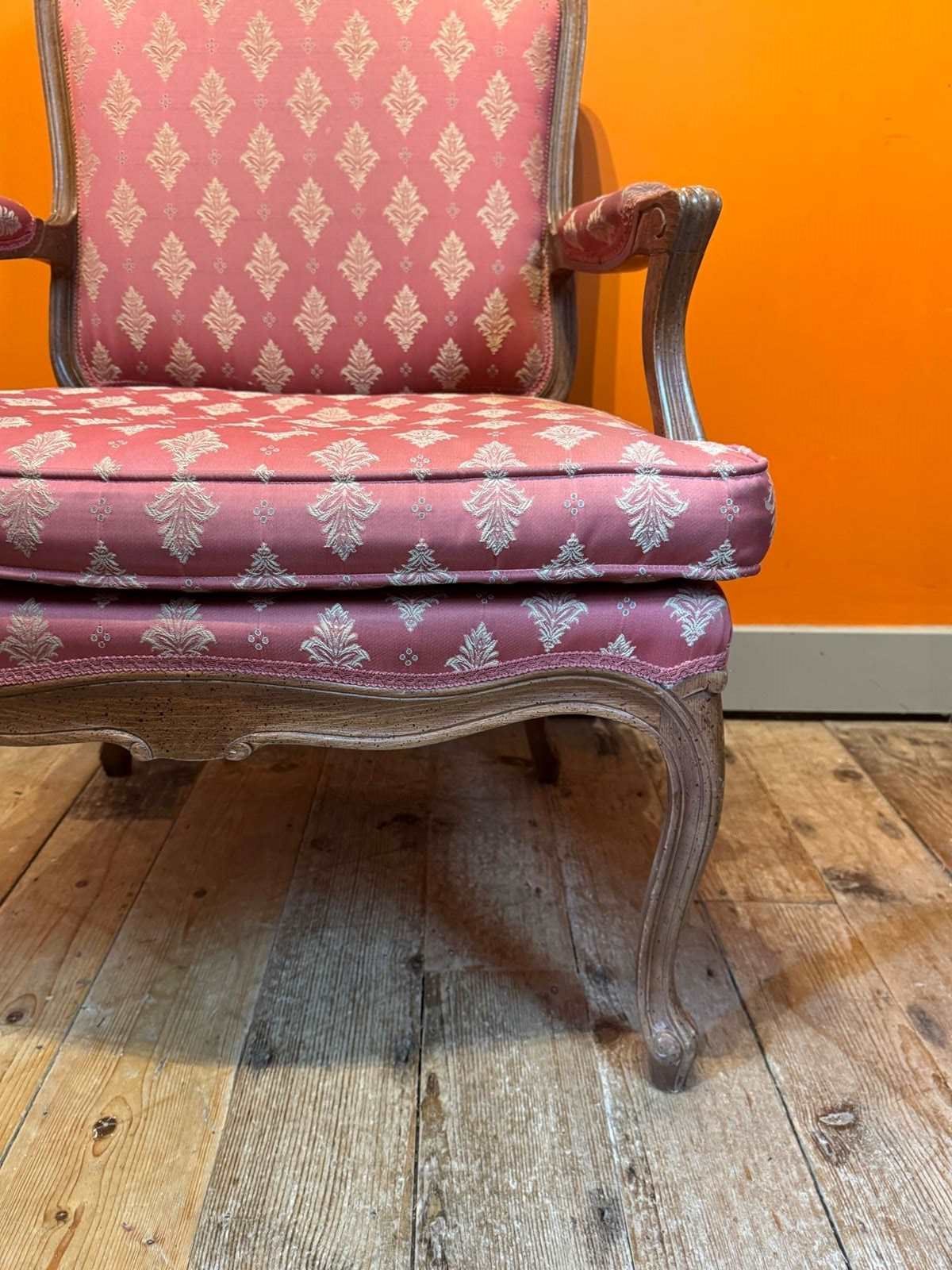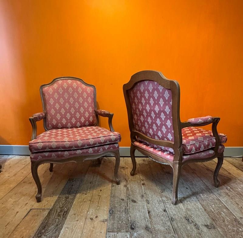A pair of Vintage French fauteuils / open armchairs in Louis XV style, with chanel moulded walnut frames and of generous proportions, tablet backs and loose seat cushions.