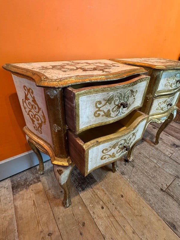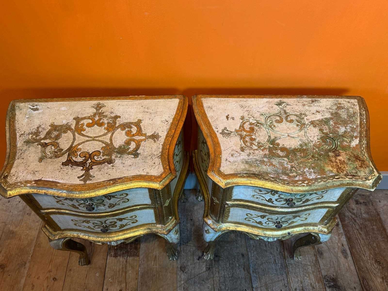 A pair of Vintage Italian Florentine bedside chests, circa 1950, of serpentine outline with moulded edge, each fitted with two drawers with brass knob handles, over a shaped apron and raised on cabriole supports.