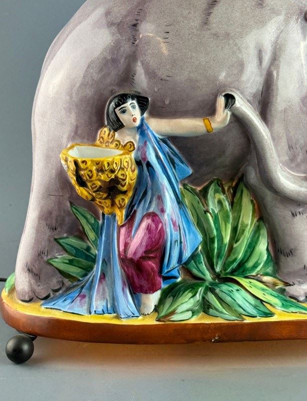 A rare French Art Deco porcelain perfume lamp attriuted to Argilot, Paris, circa 1925, the 'Elephant Tamer', in the form of an elepant with a dancer at its side holding a bowl for the perfume, painted in coloured enamels and upon a brass base raised on ball feet.
