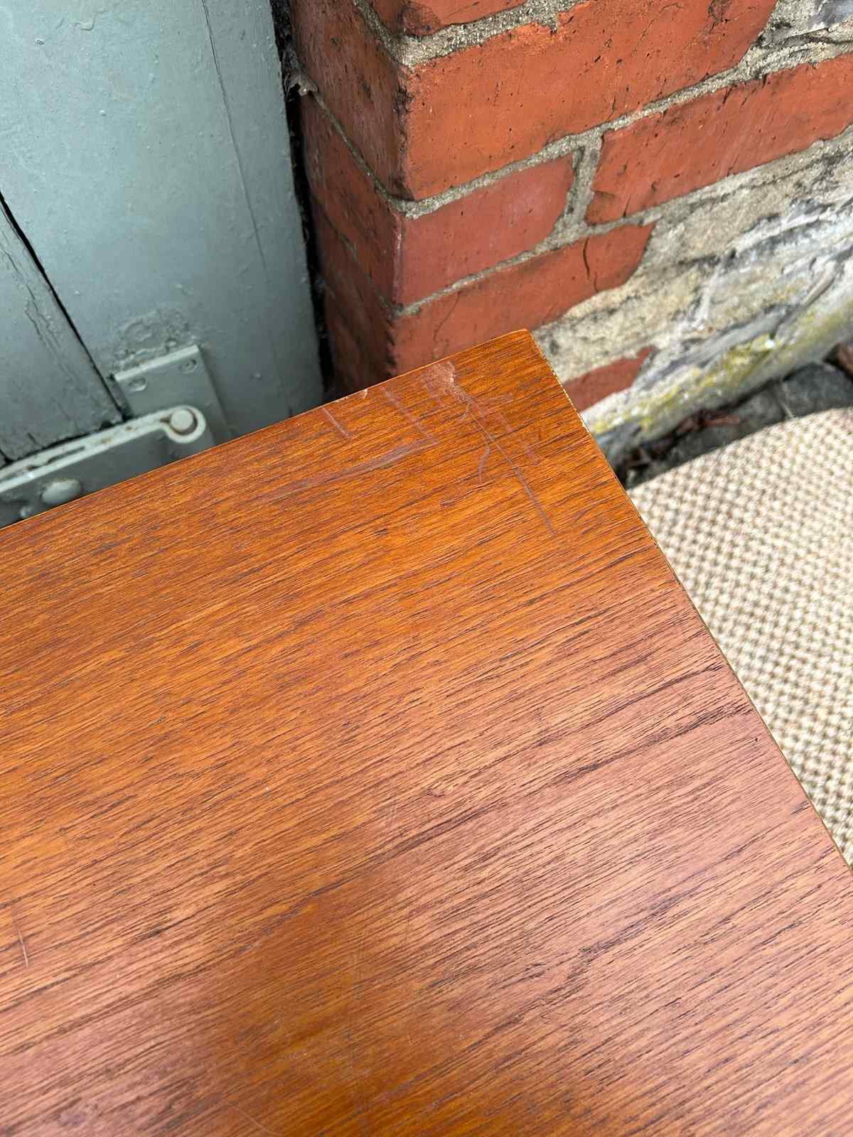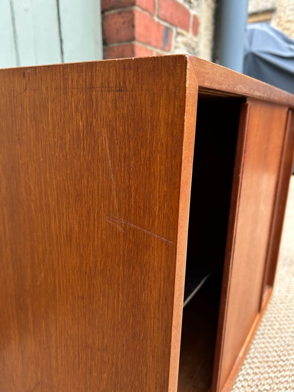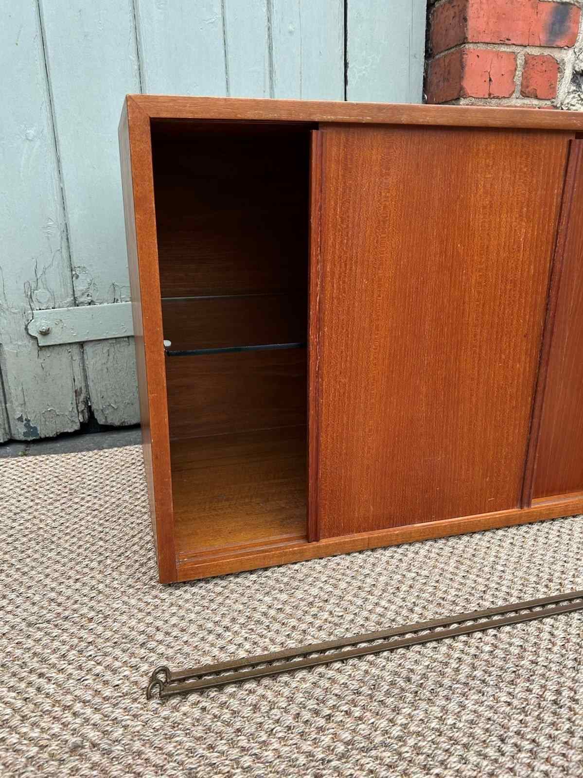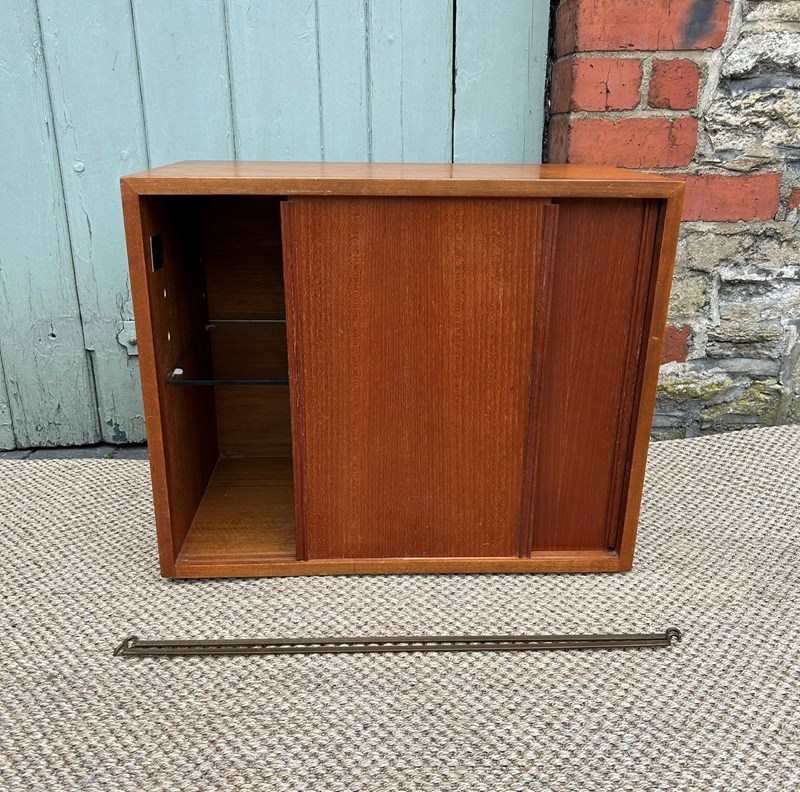 In good condition overall, some cosmetic scratching to the top of the cabinet which is not noticeable once hung on the supports. The sliding doors are a little stiff as it's been in storage for some time but they do operate.
