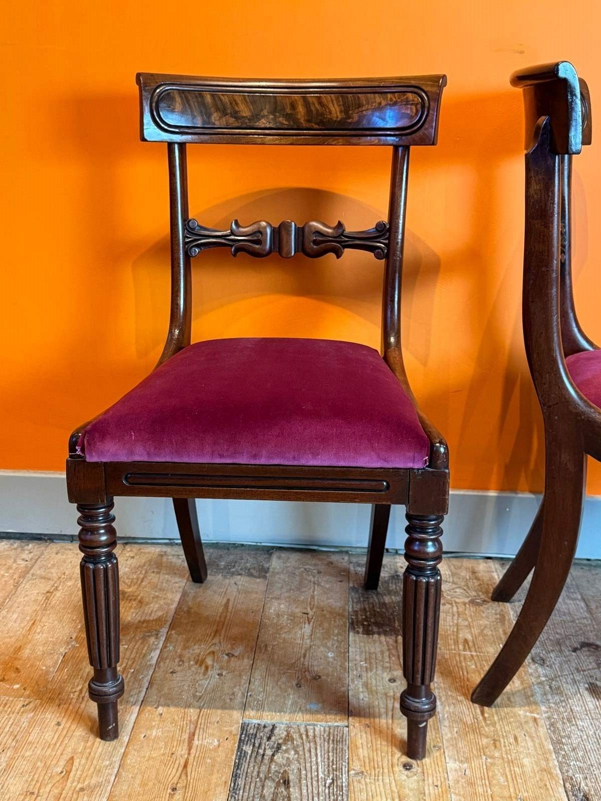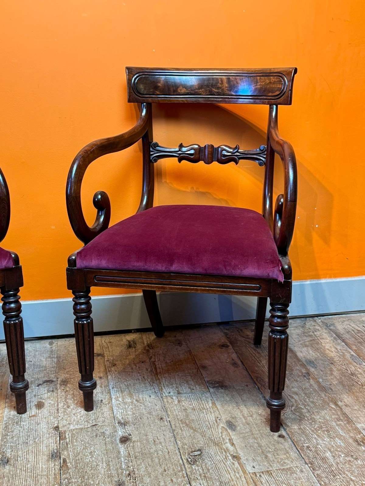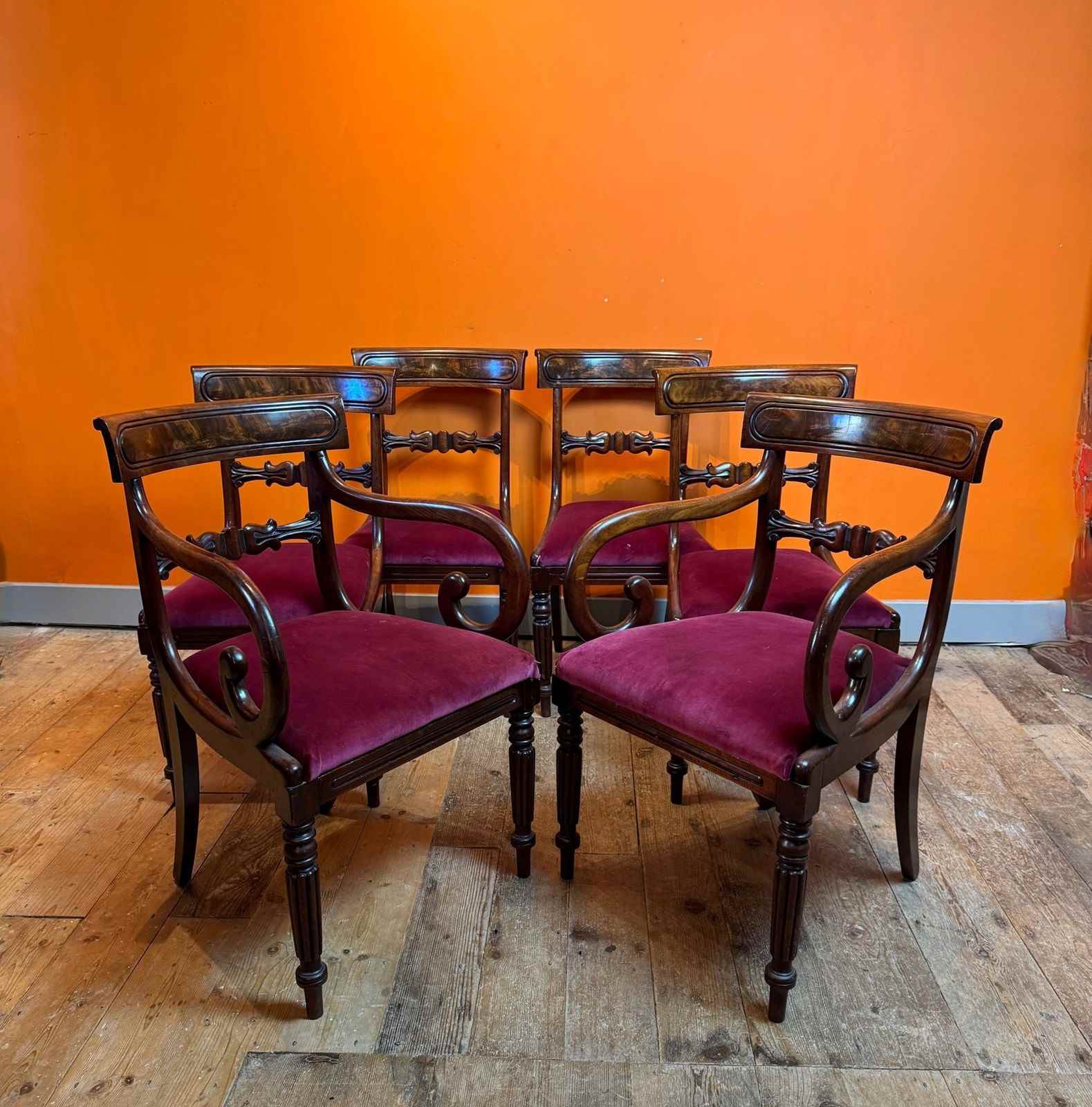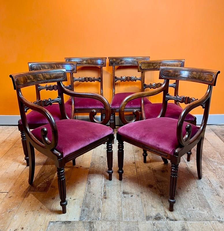 A set of six Regency mahogany dining chairs circa 1820-1830, comprising four chairs and a pair of carvers, with curved backrails and acanthus carved stretchers, the drop in seats upon ring turned and moulded front supports, the back legs of sabre form.