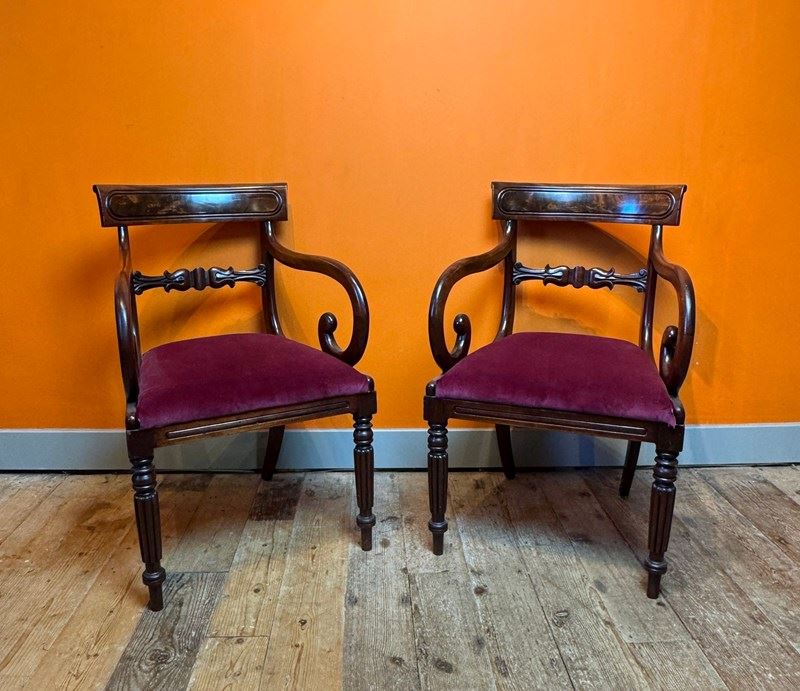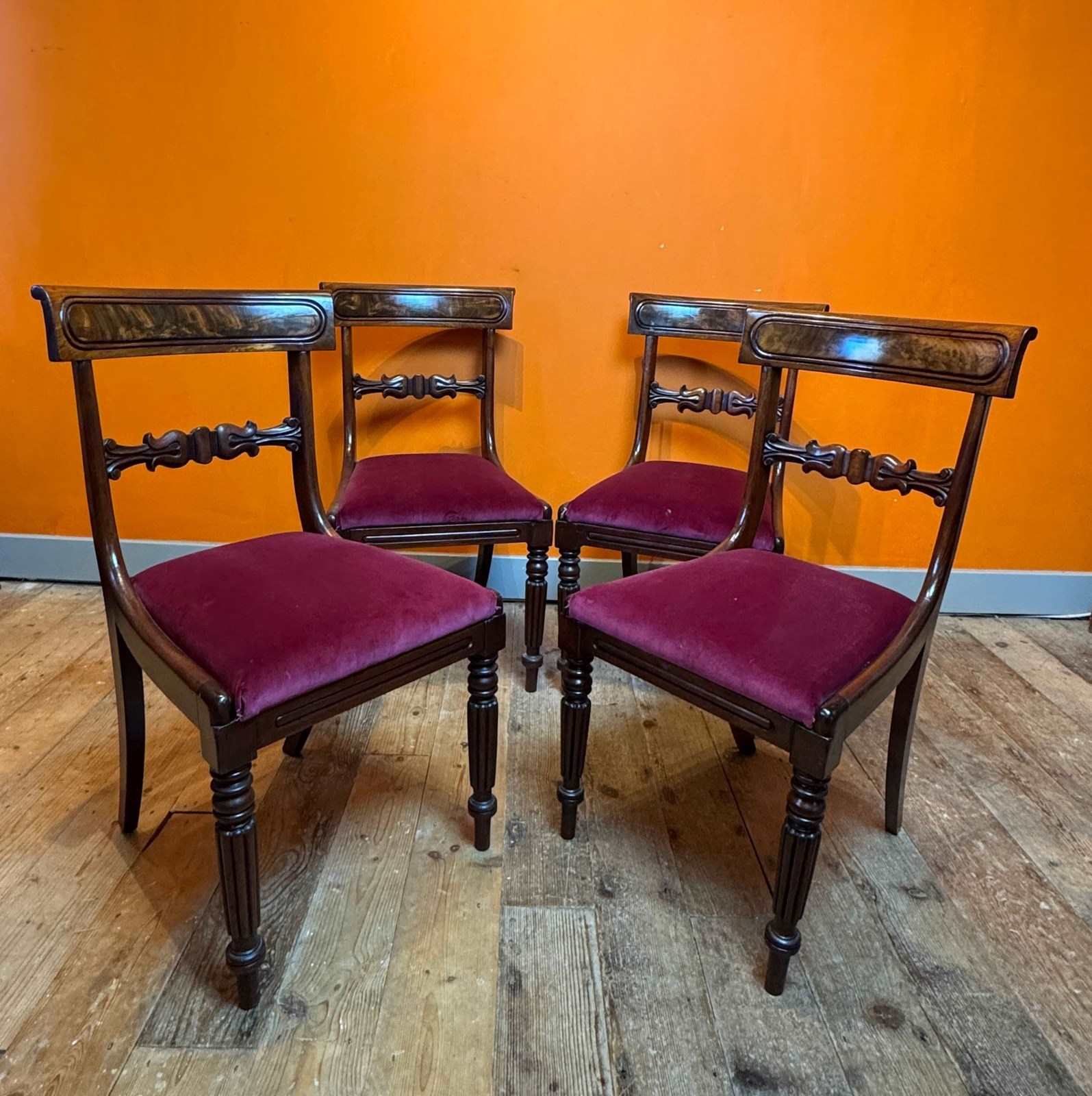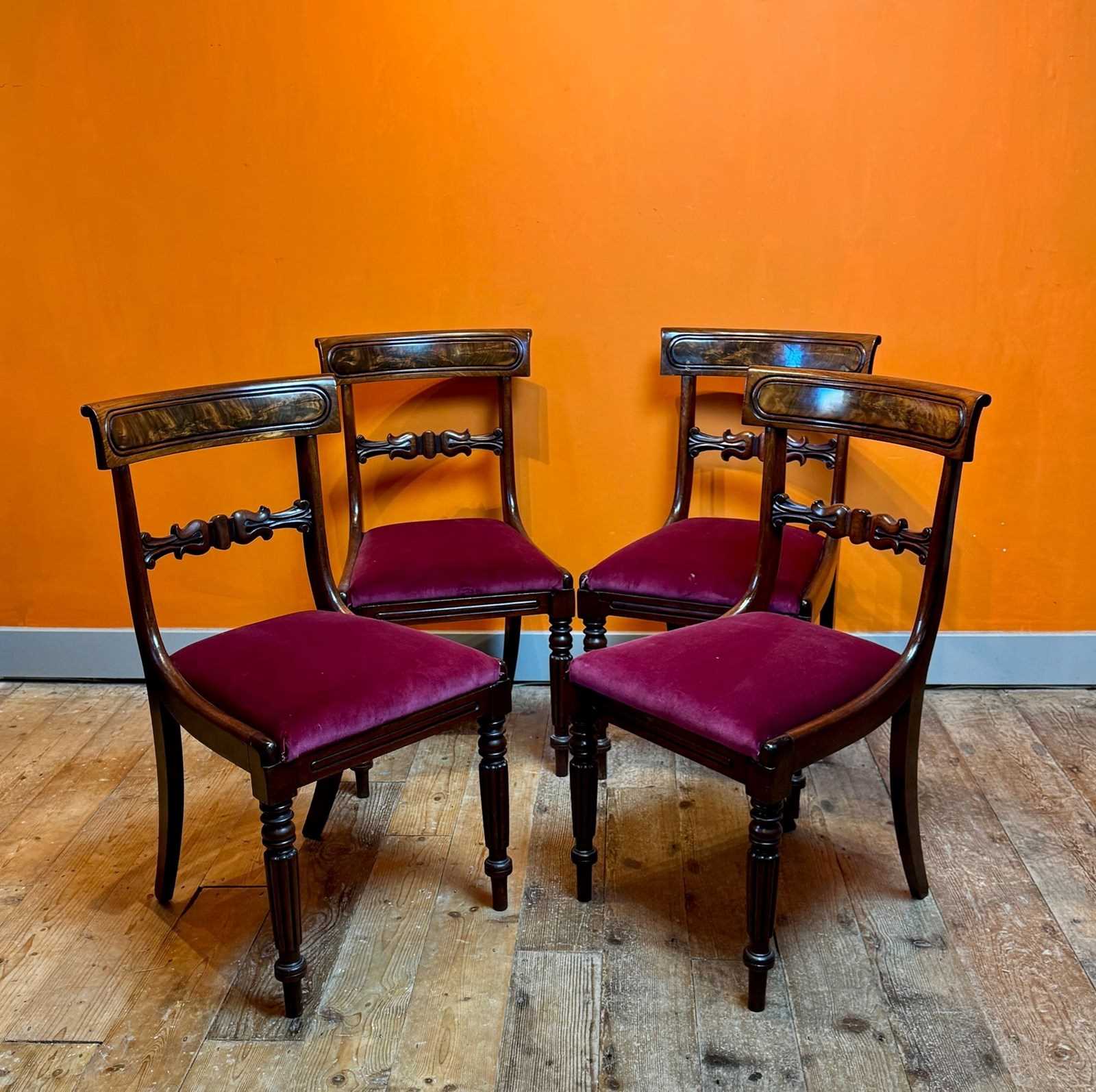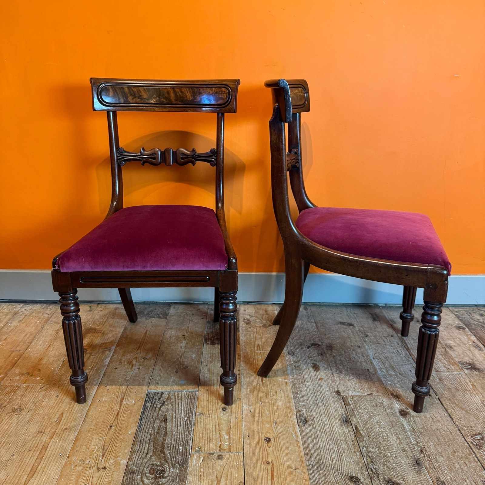 A set of six Regency mahogany dining chairs circa 1820-1830, comprising four chairs and a pair of carvers, with curved backrails and acanthus carved stretchers, the drop in seats upon ring turned and moulded front supports, the back legs of sabre form.