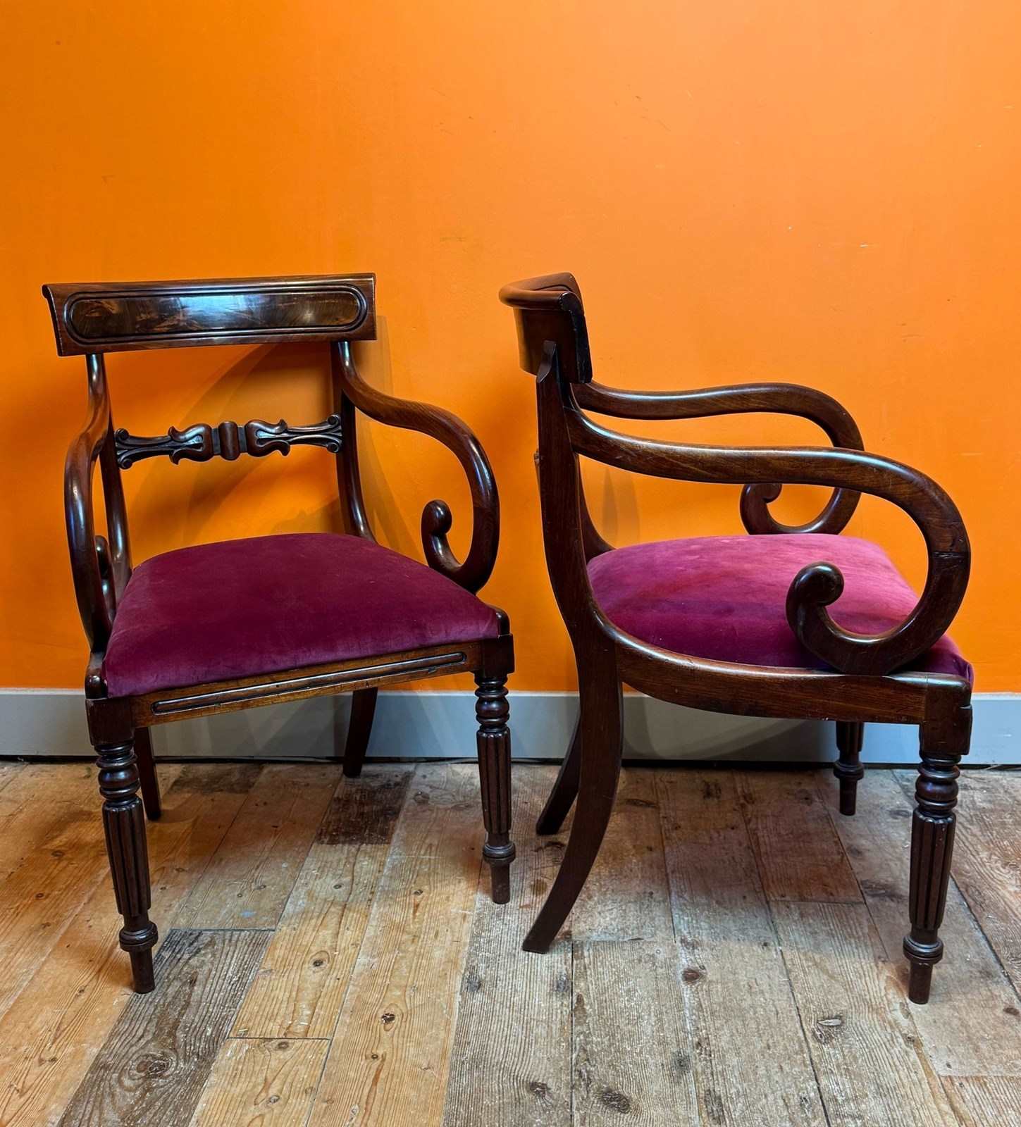 In good condition overall, the drop in seats all fit well. One of the single chairs has old repairs to the back rail and the red velvet upholstery has a few marks but coud be improved. I can arrange re-covering and supply fabric if required - please get in touch for further details.