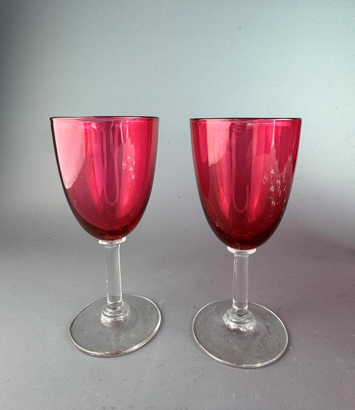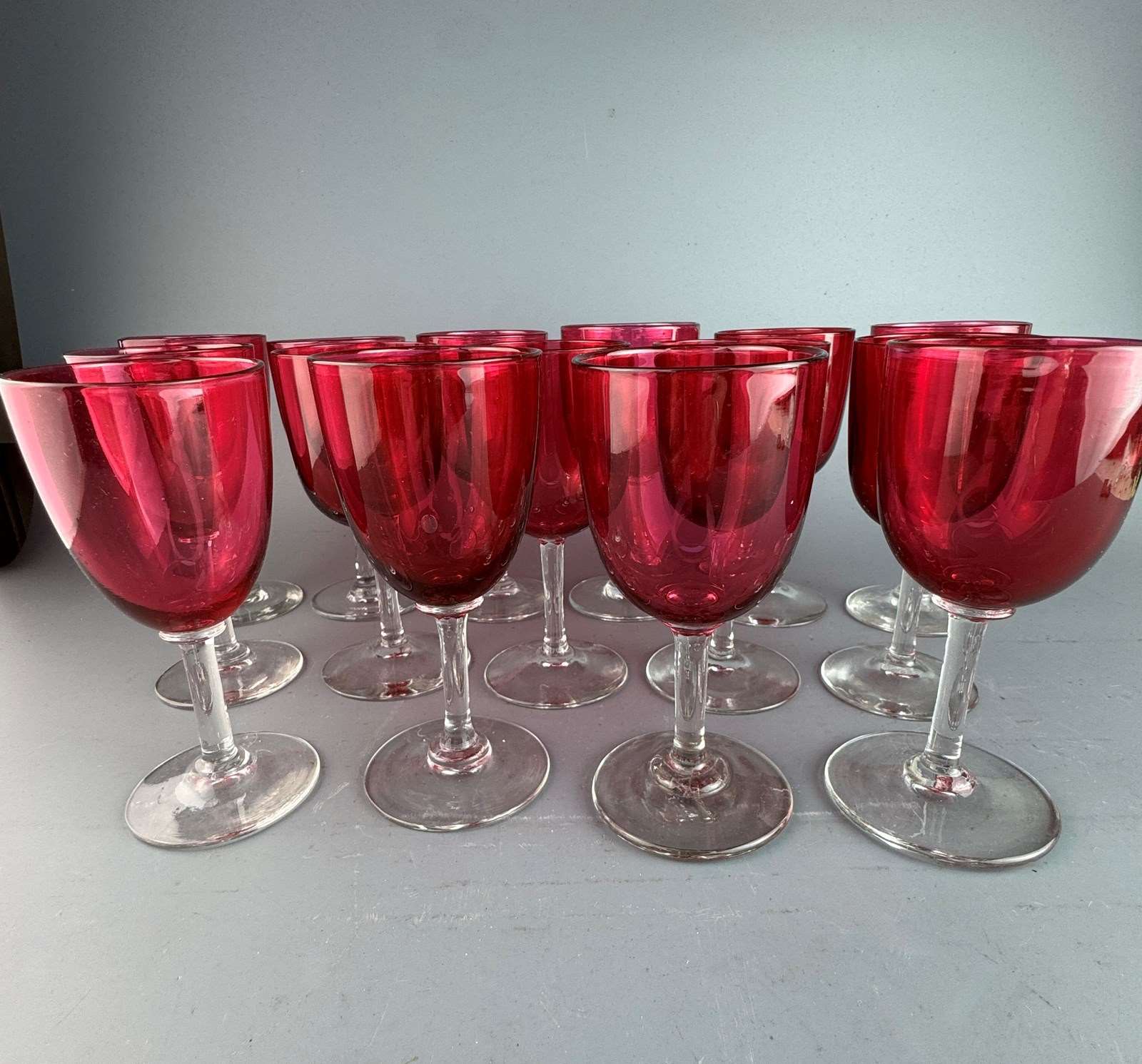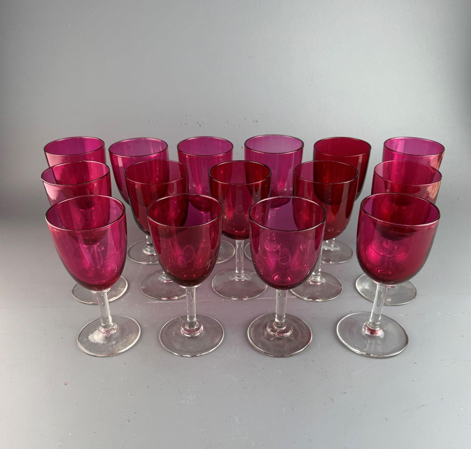 Set Of Fifteen Victorian Cranberry Glass Wine Glasses