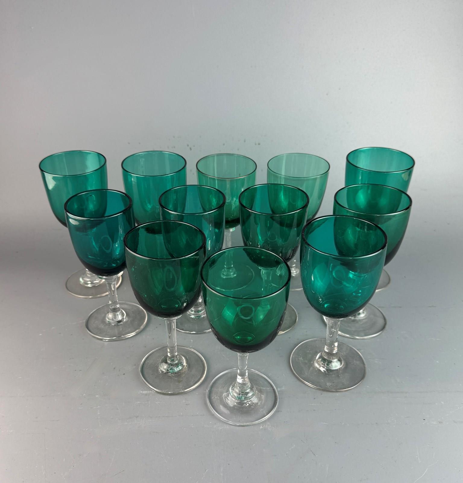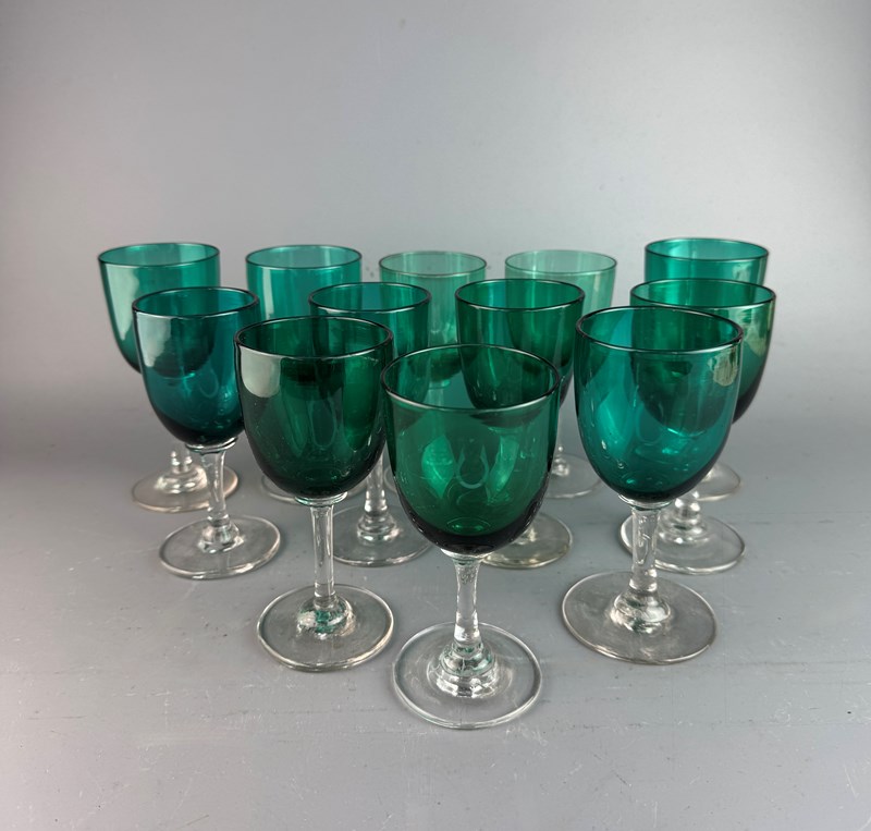 Set Of Twleve Victorian Green Glass Wine Glasses