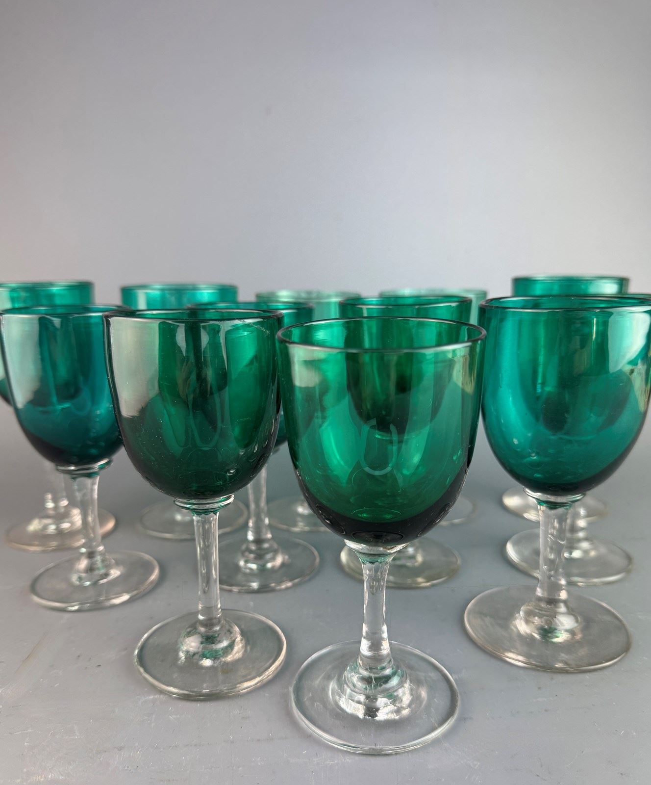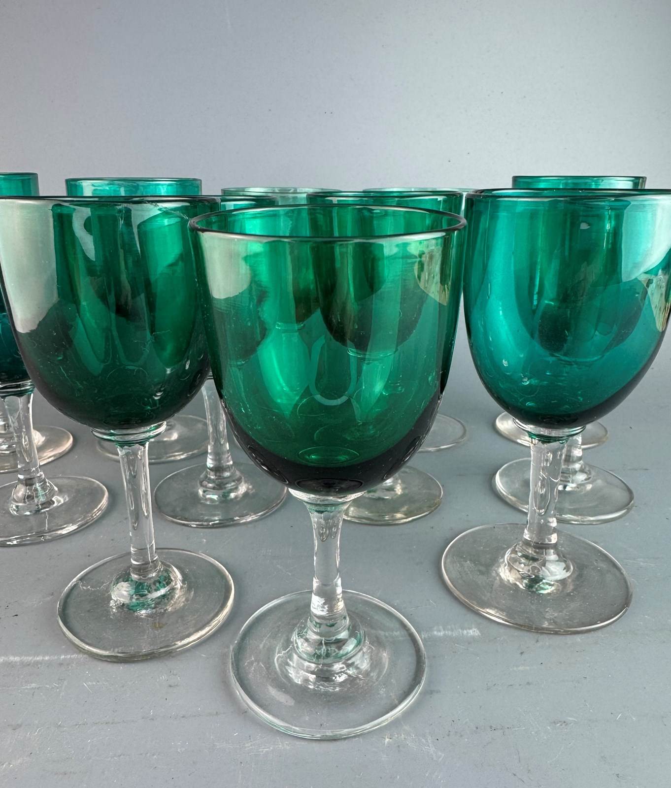 A set of twelve Victorian wine glasses with green bowls, and clear glass stem and circular foot, late 19th century. As these are handmade there are very slight variations in colour and size.