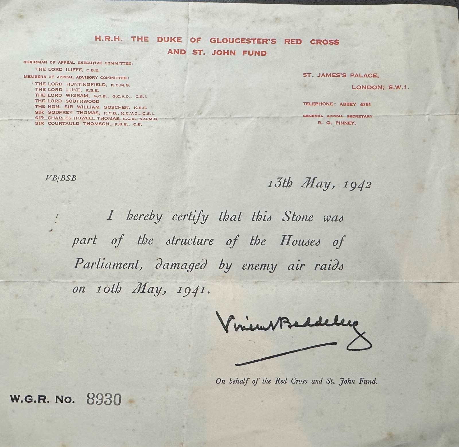 Stone retrieved from the bombings were subsequently used to make items for sale to raise funds on behalf of HRH The Duke of Gloucester's Red Cross and St. John Fund. Commonly these were bookends, ashtrays, inkwells and other small items It is, however, rare to find a large piece such as this planter and also an items that retains its original letter of authenticity.