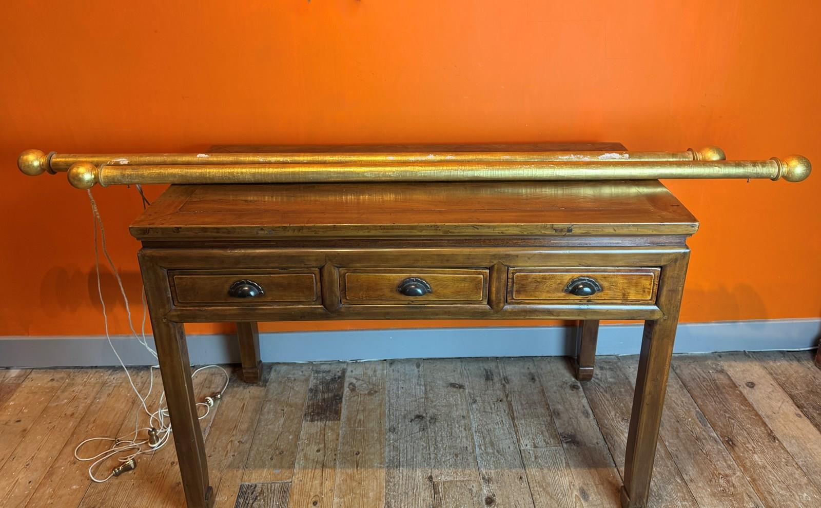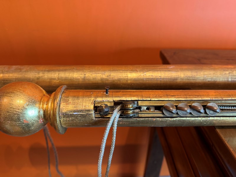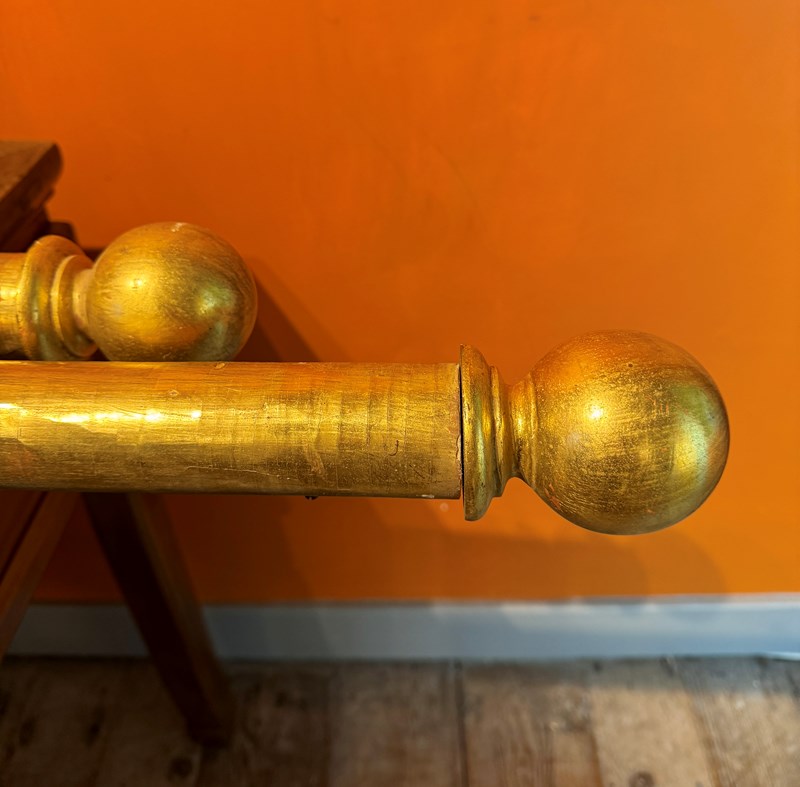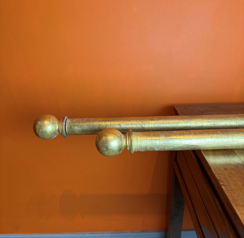 A really lovely quality pair of poles which are gilded rather than painted. They are dual use and can be used either as poles or as rails with the integral fittings which have string pulleys.
