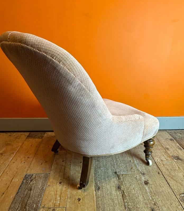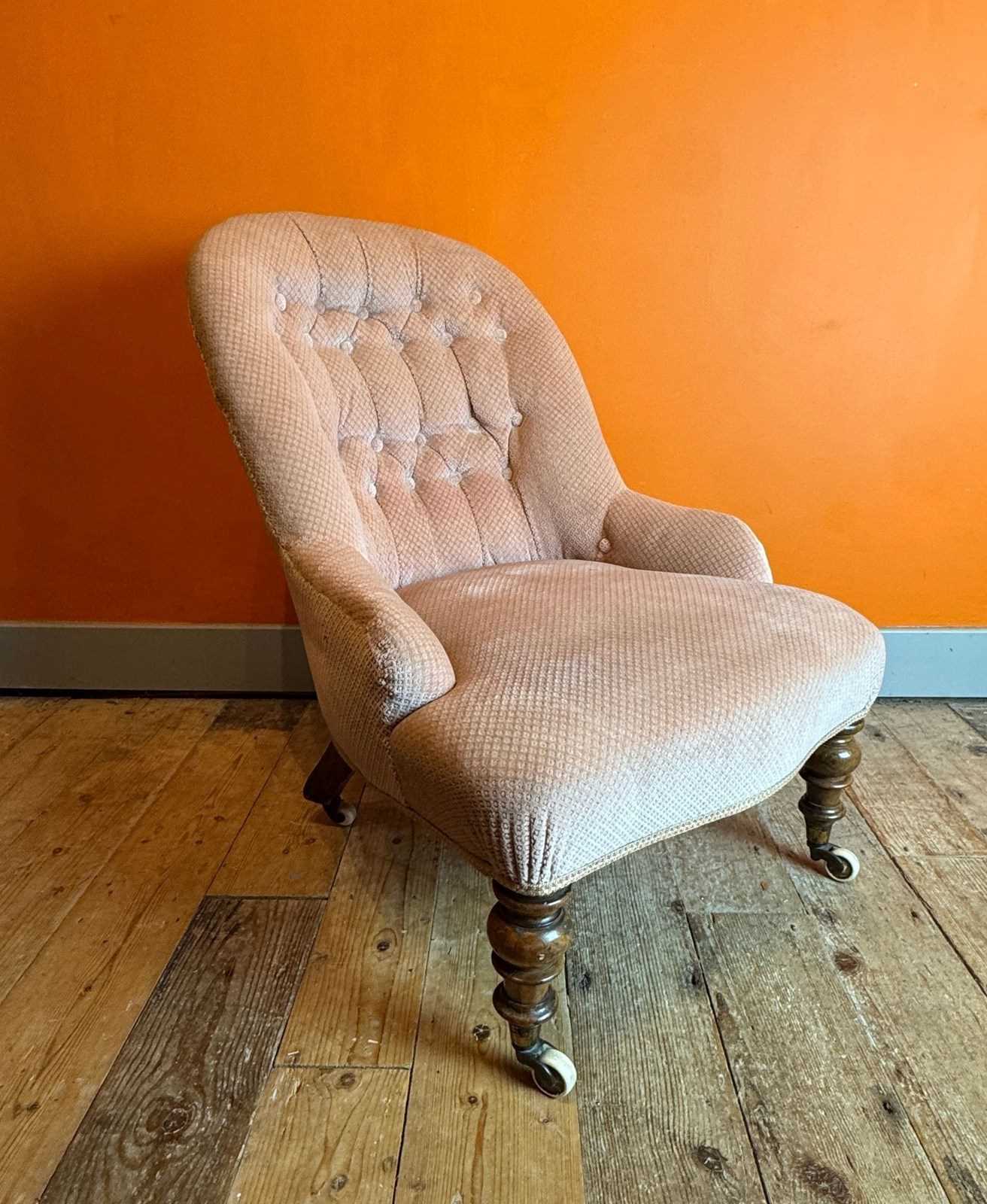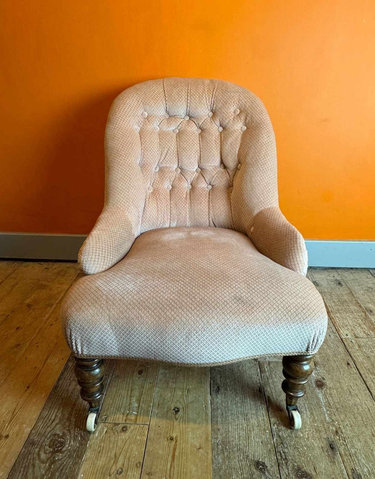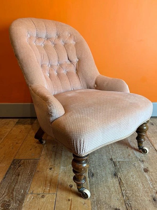 In good structural condition, the pale pink fabric upholstery is grubby but could be improved with steam cleaning.