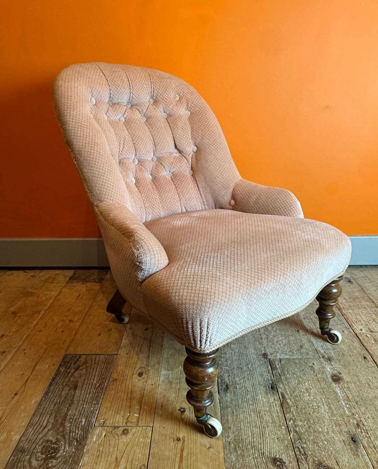 A Victorian button back occasional chair, circa 1880, with tub back and sprung seat, raised on ring turned mahogany front supports with original brass and porcelain castors.