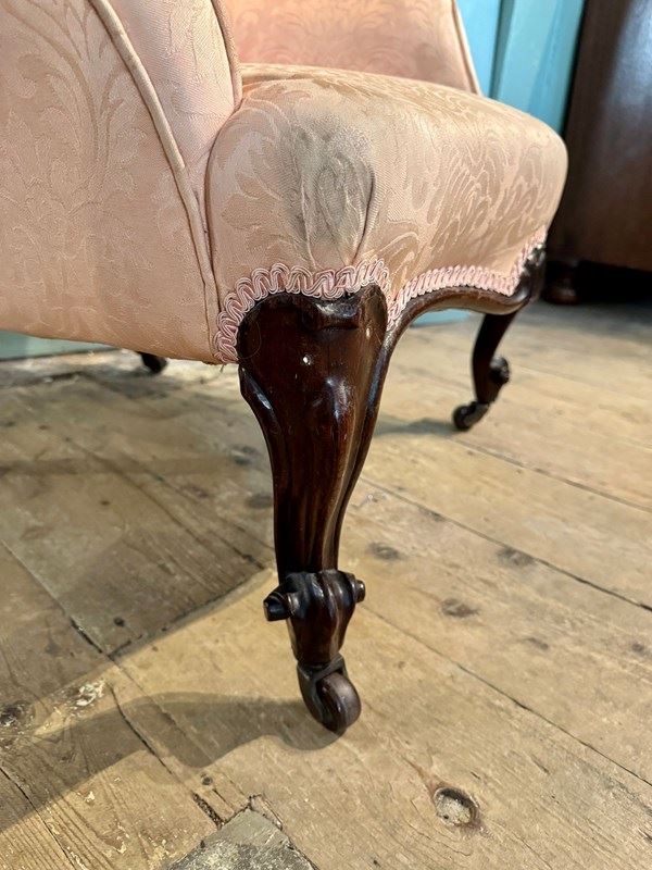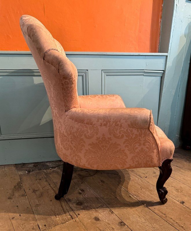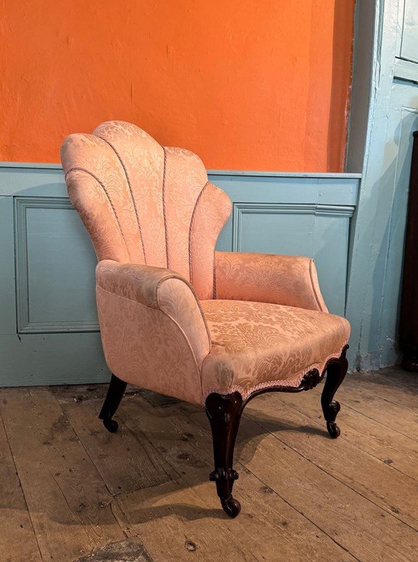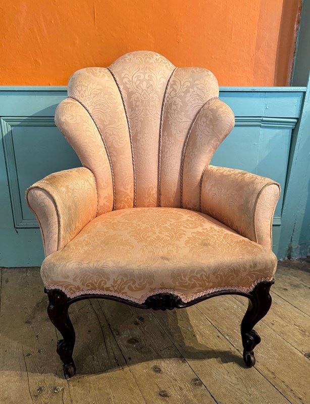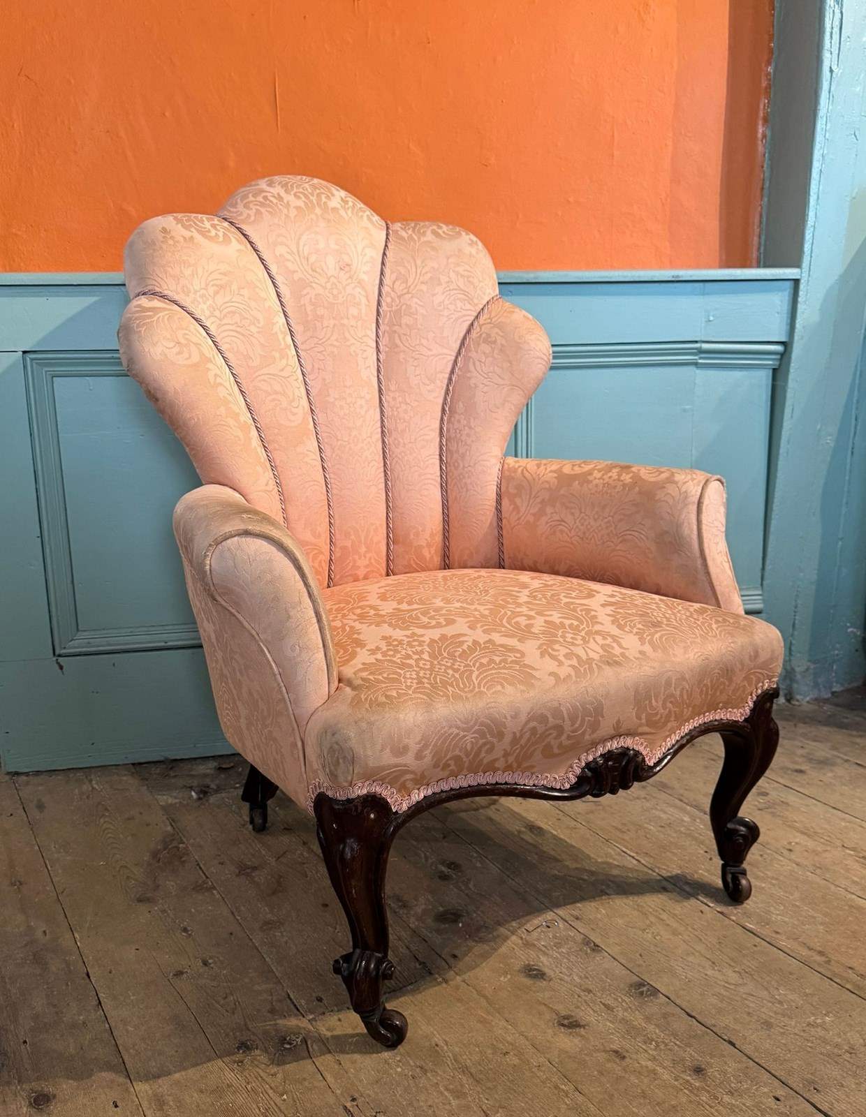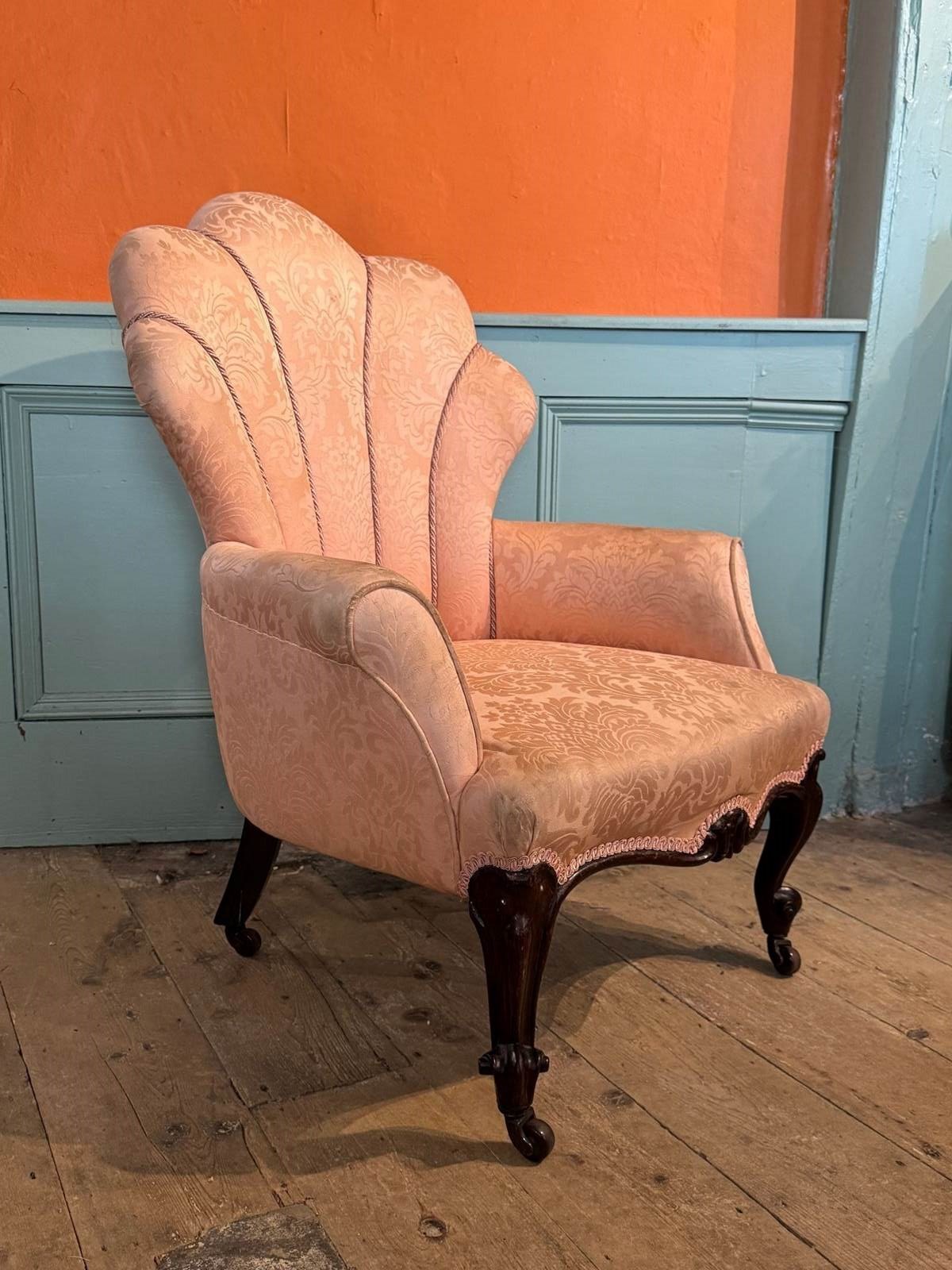 A very pretty antique Victorian shell back armchair, circa 1870, the serpentine shaped sprung seat with central carved detailing and raised on scroll supports raised on original brass and porcelain castors. Upholstered in a peach coloured damask fabric with rope detailing.