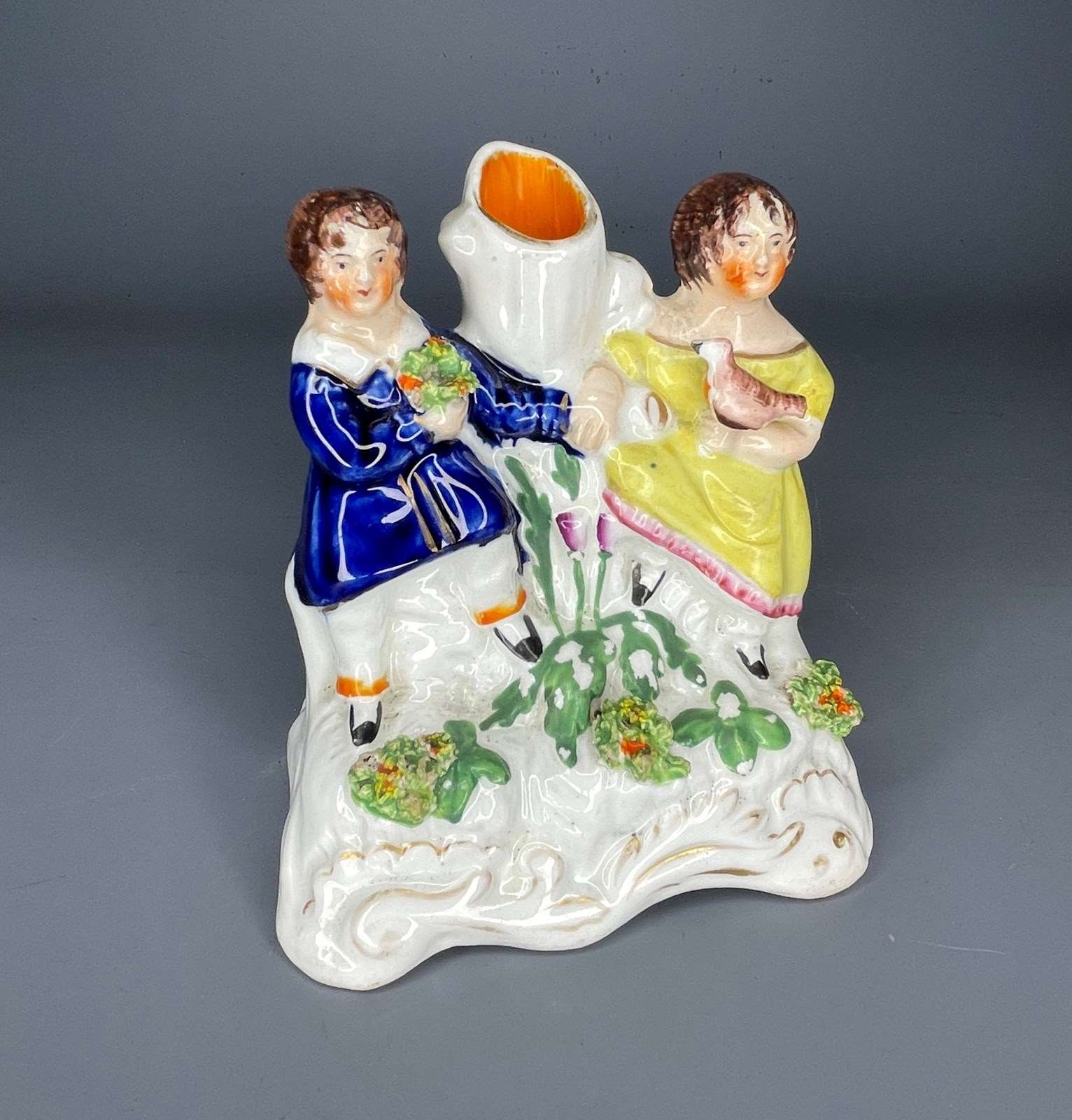 A Victorian Staffordshire spill vase, circa 1860, of two children beside a tree stump, one holding a posy of flowers, the other a bird, raised on a flower encrusted scroll base.