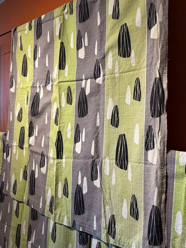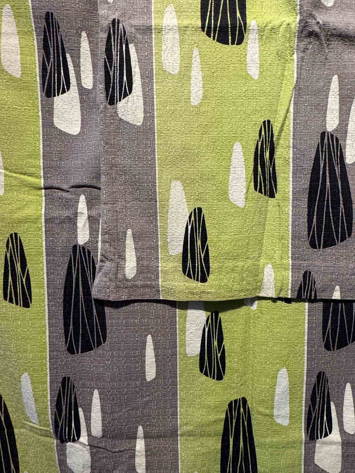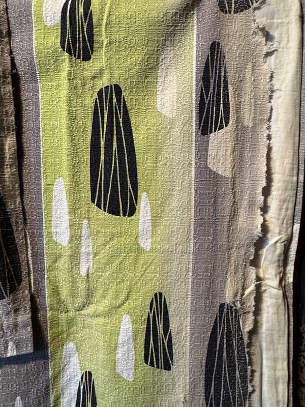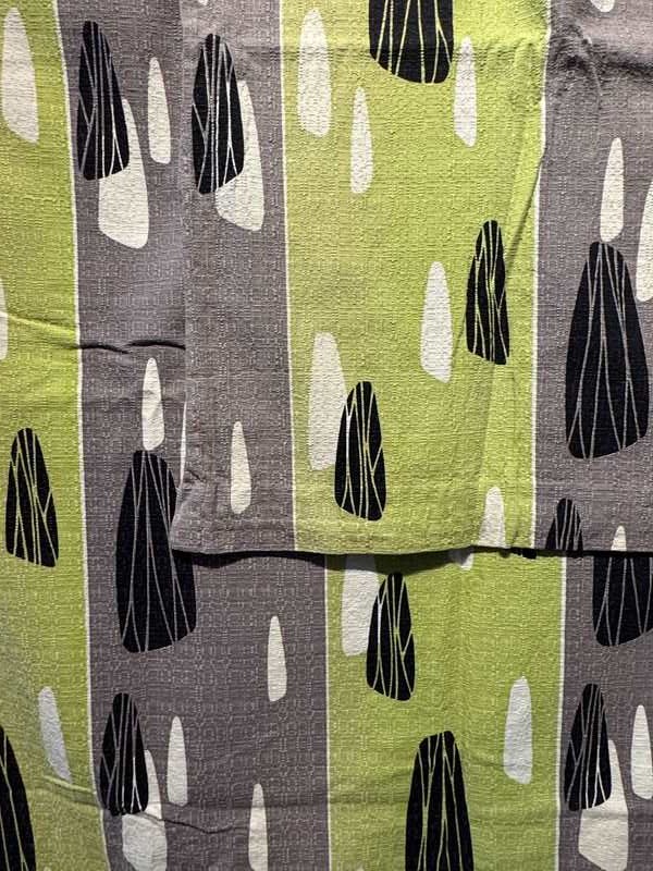 Three sections of 1950's barkcloth fabric, in lime green and grey stripes with black and white eliptical shapes.