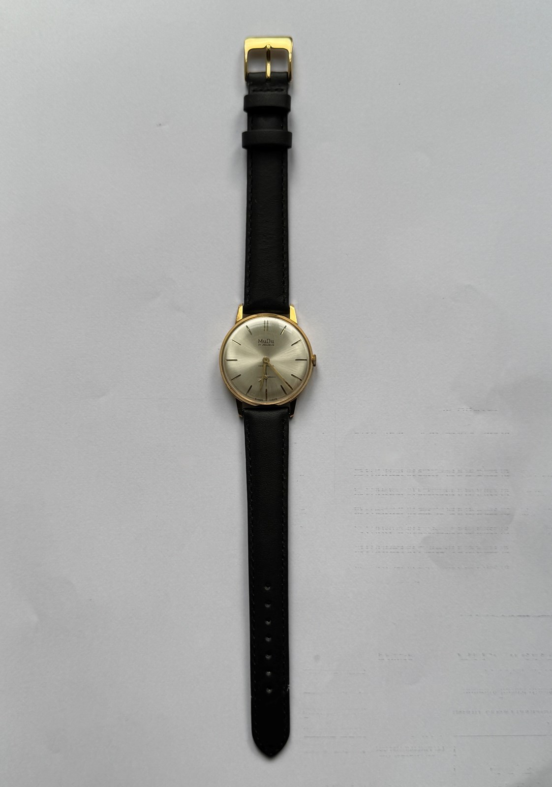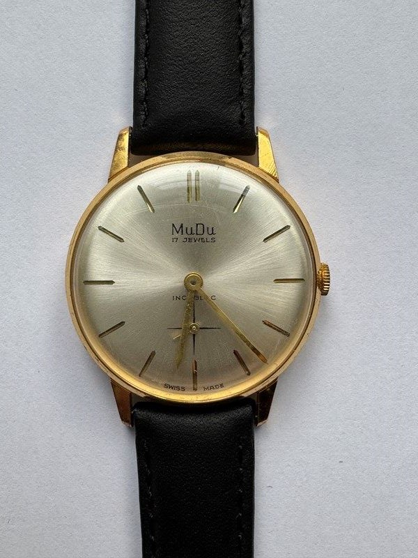 Vintage 1960's MuDu Gentleman's manual-wind incabloc wristwatch, the gold-plated case with brushed silver circular dial, baton numerals and seconds hand. New, unused, old shop stock, with new leather strap.