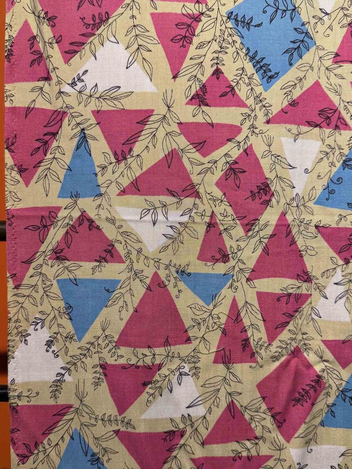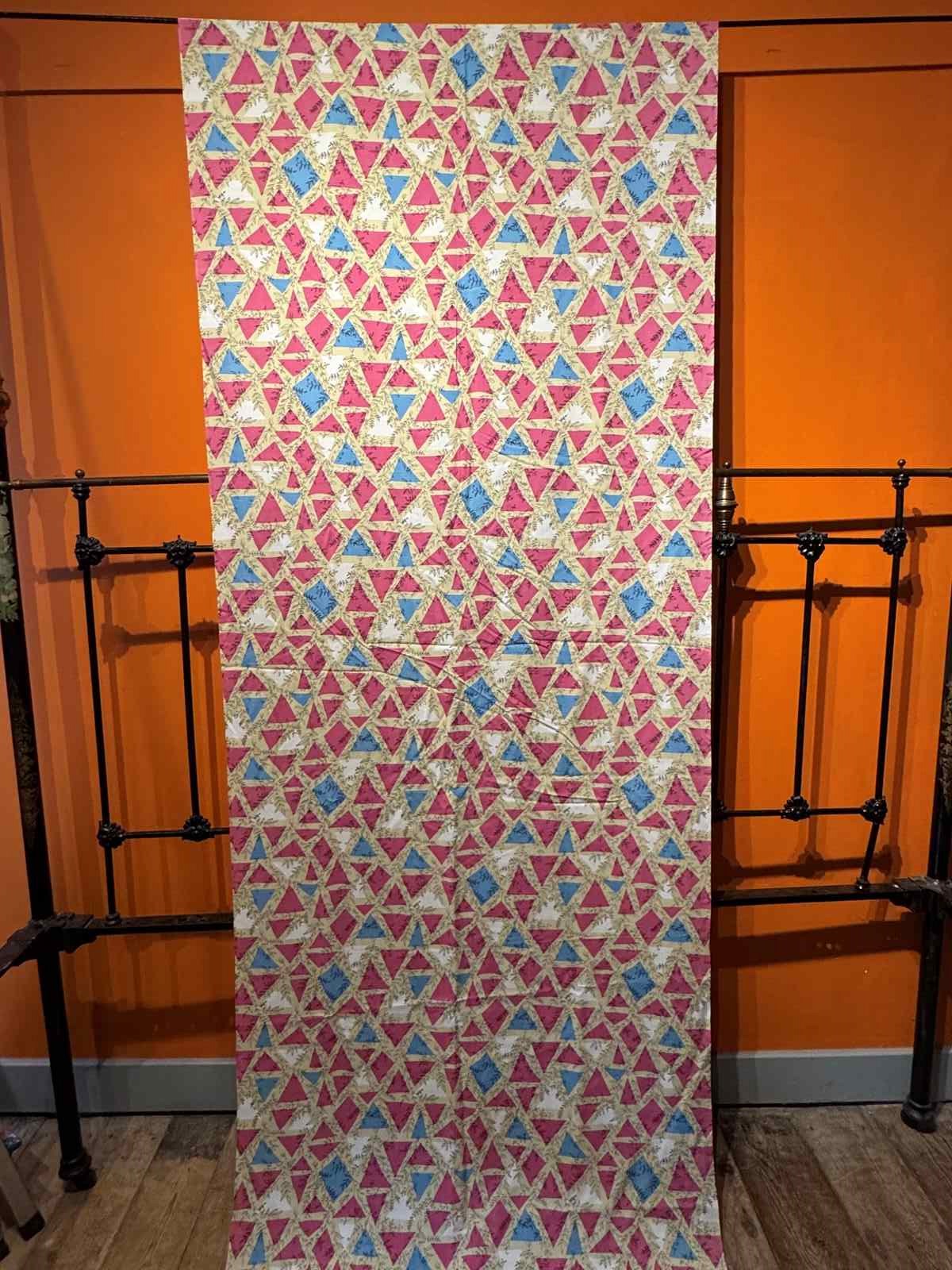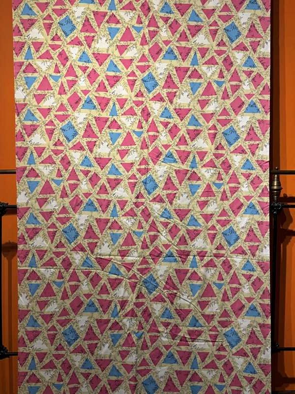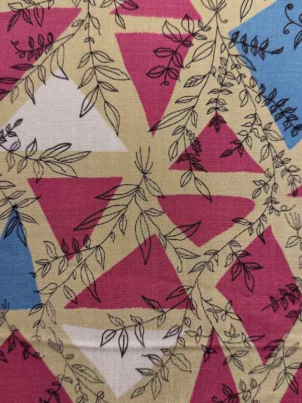 A 2.72 metre length of lightweight fabric (possibly a cotton blend) of printed fabric with a design pink, turquoise and white triangles on a buff colour ground with black sprigging.