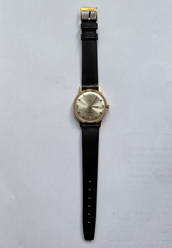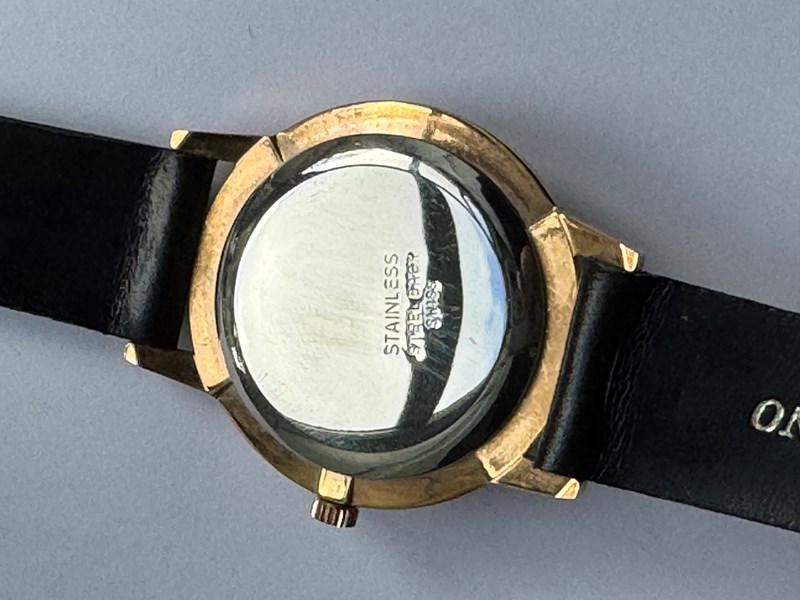A vintage 1960's Tunis 'Superflat' manual-wind wristwatch, the gold-plated case with a 370mm brushed champagne coloured dial with Arabic numerals at the quarters. unused, old jeweller's shop stock.