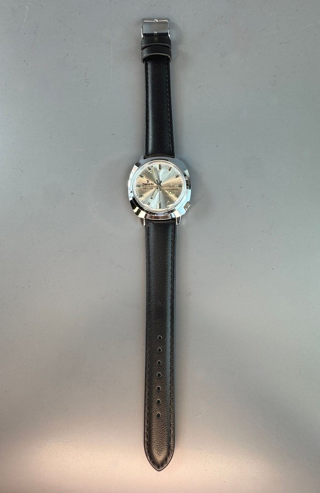 A Vintage Daichi Deluxe gentleman's automatic wristwatch, the brushed stainless steel dial with calendar aperture. In perfect, working condition, unused old shop stock, with modern leather strap.