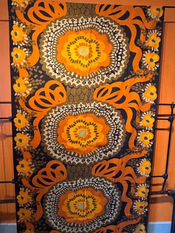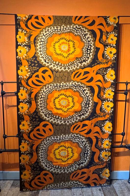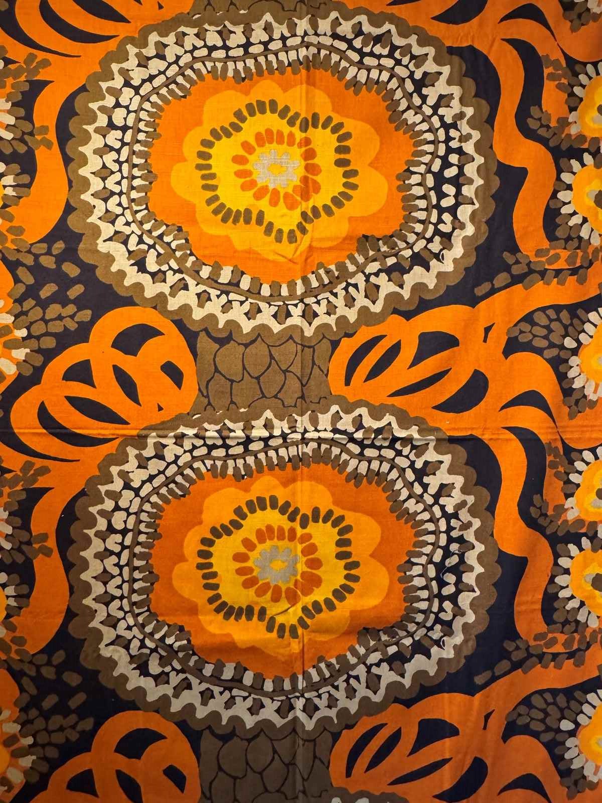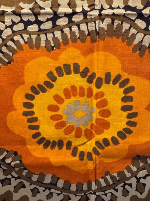 A fabulous 2.72 metre length of 1970's furnishing fabric in stylised flowerhead design browns and oranges. 120cm wide.