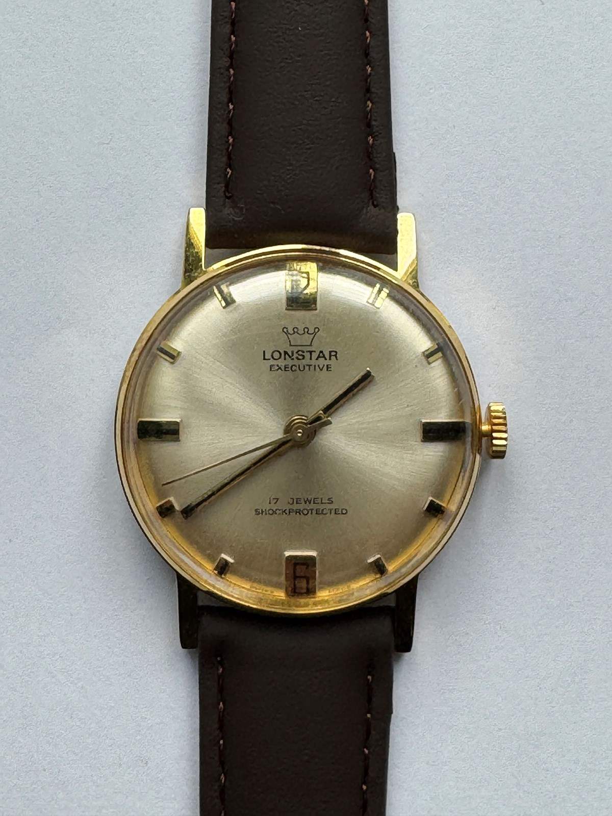 A vintage 1907's Lonstar 'Executive' gentleman's manual-wind wristwatch, the circular 350mm dial with brushed finish, date apertures and baton numerals. The dial marked