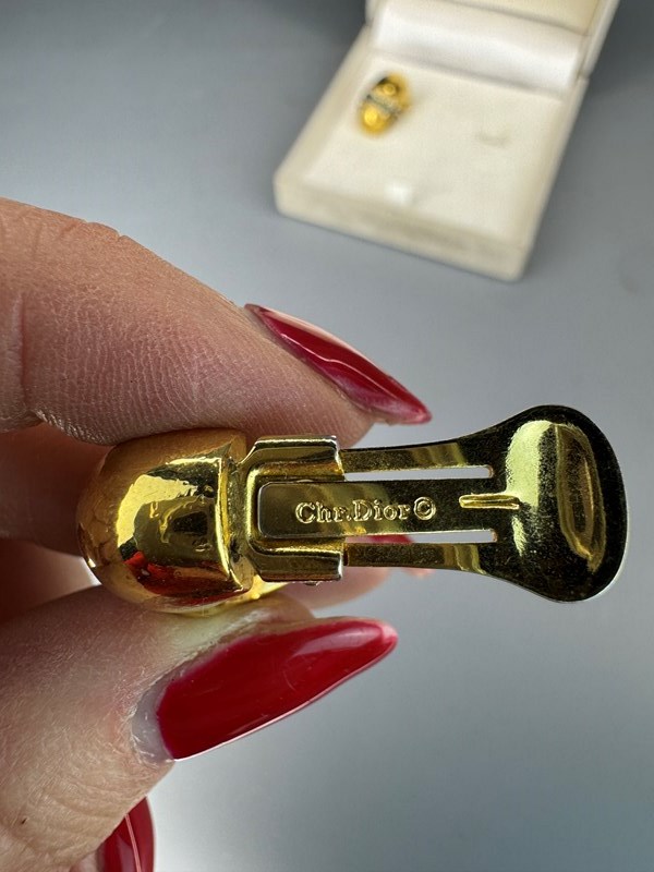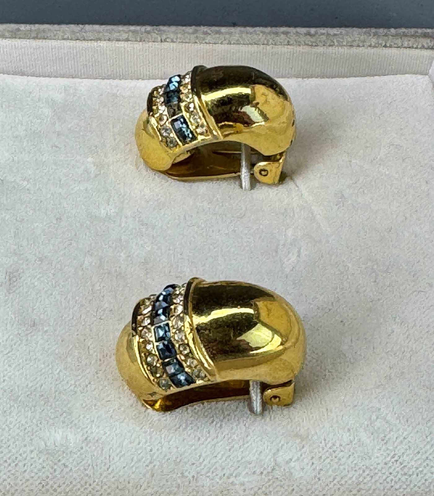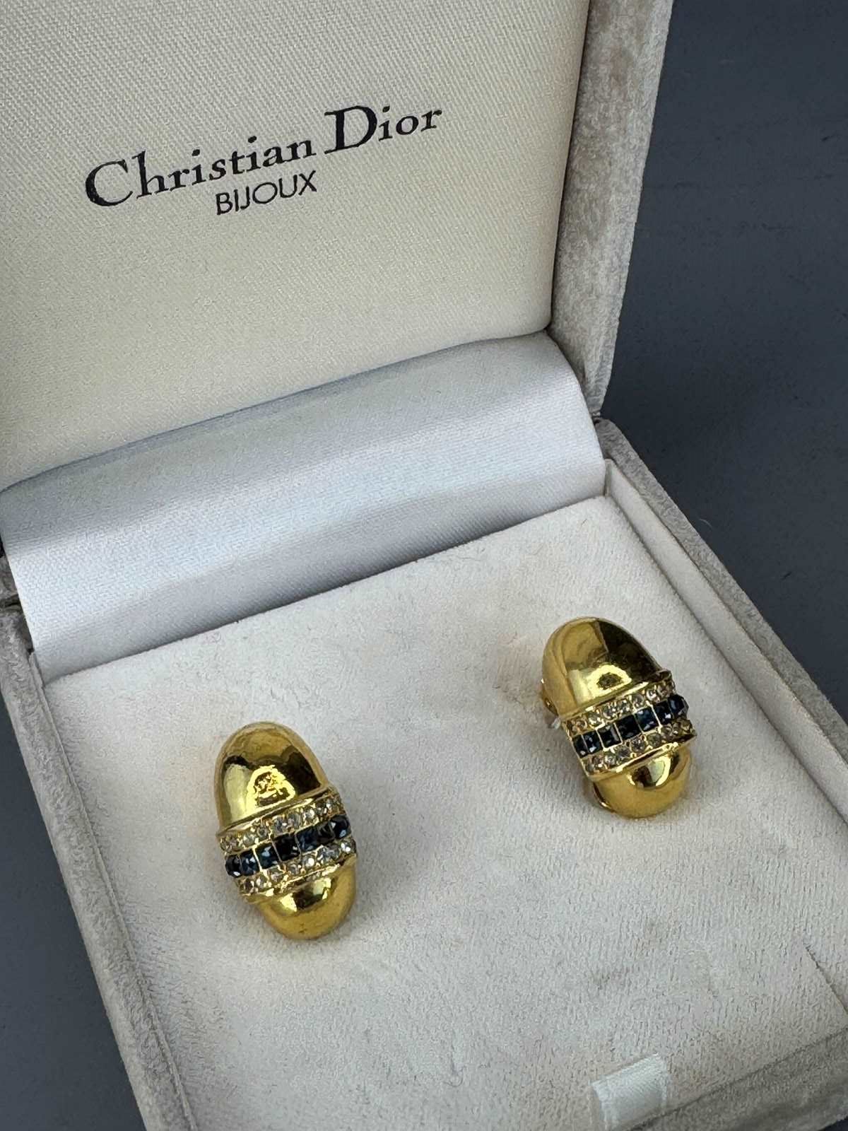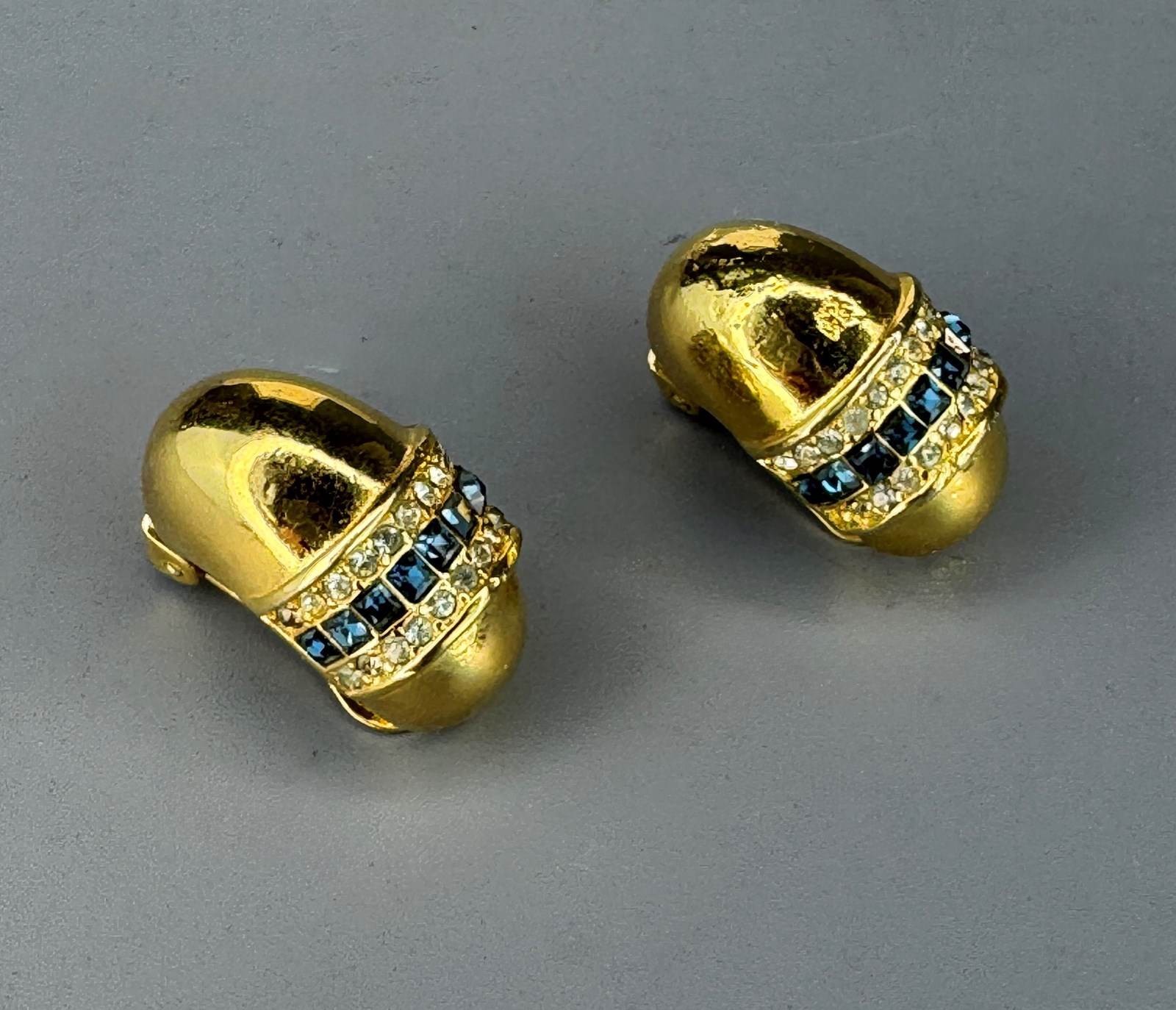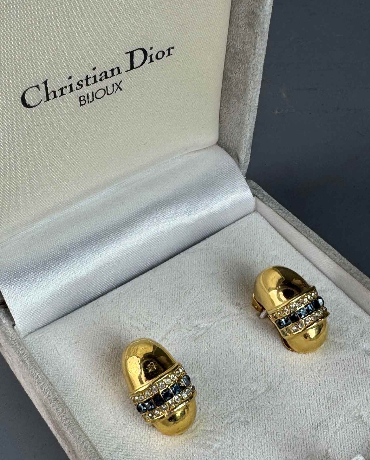 A pair of vintage Christian Dior gilt metal ear clips dating from the 1980's, of dome form inset with a row of sapphire coloured baguettes, with original box.