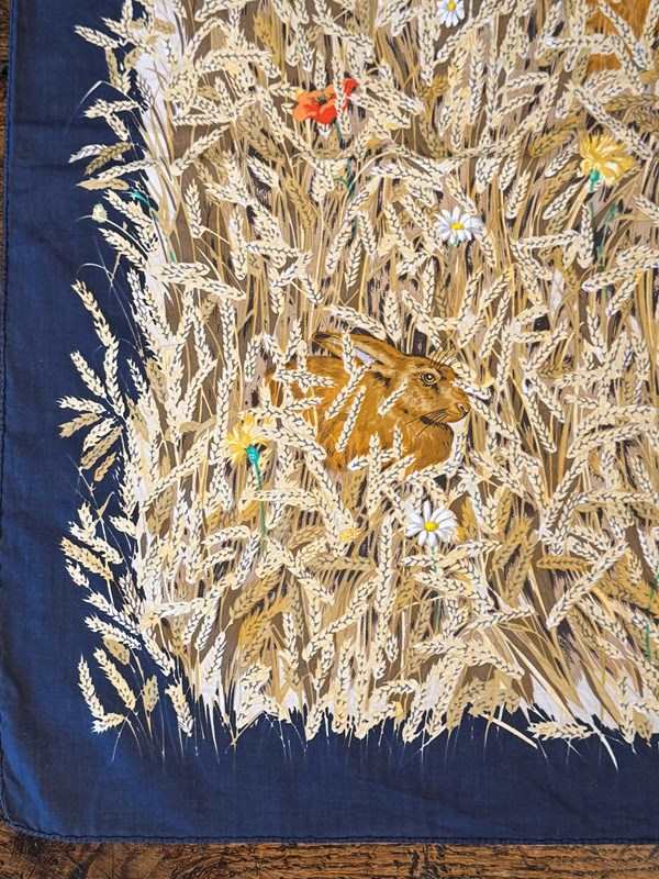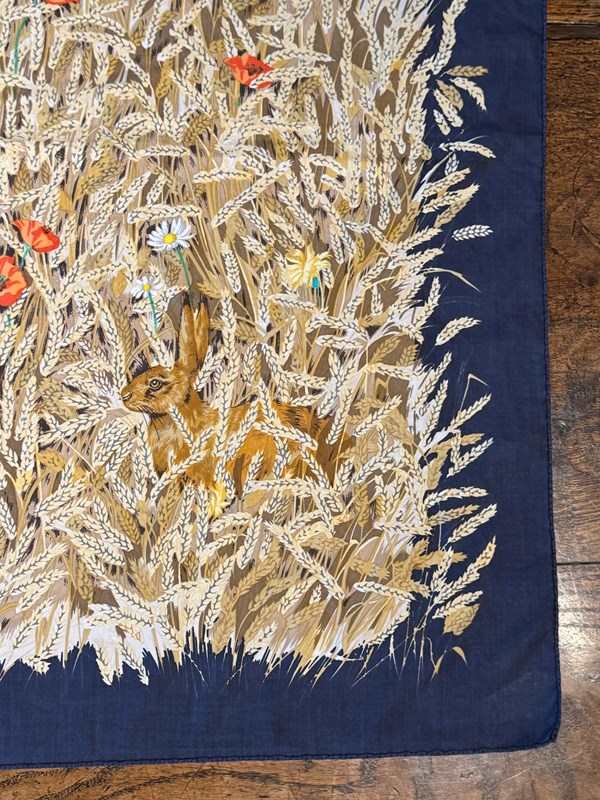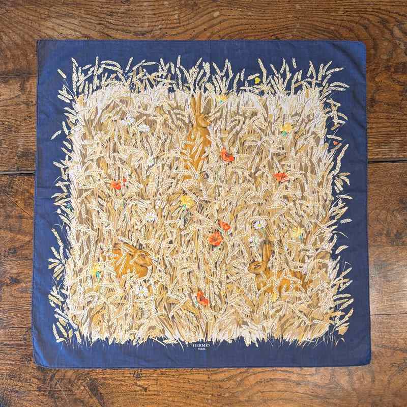 A rare vintage Hermes cotton twill scarf designed by Hugo Grygkar. First produced in 1955, and reissued in 1990, 1998, and 2006. The images shows three hares hiding among the wheat, poppies, and cornflowers. This scarf is available is several colours, this example with a dark blue border, with hand-rolled edges. Printed 'HERMES PARIS' to the bottom centre and C HERMES to the top left within the design.