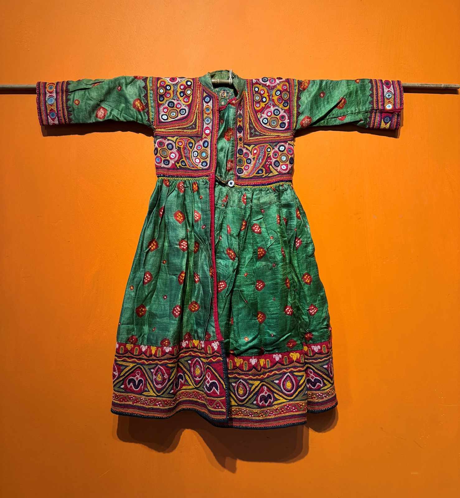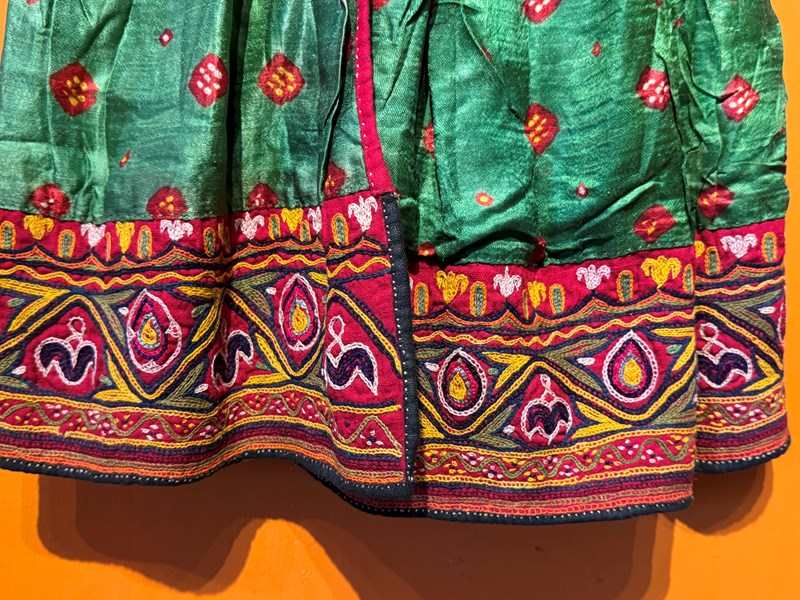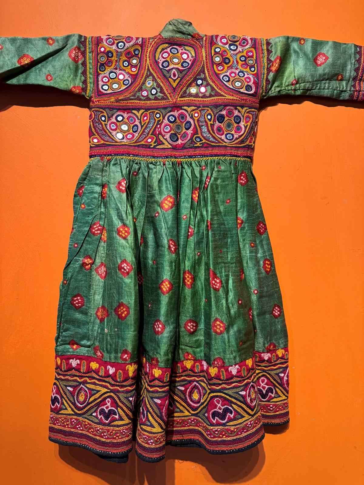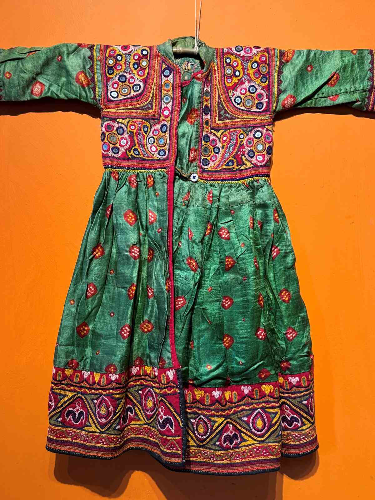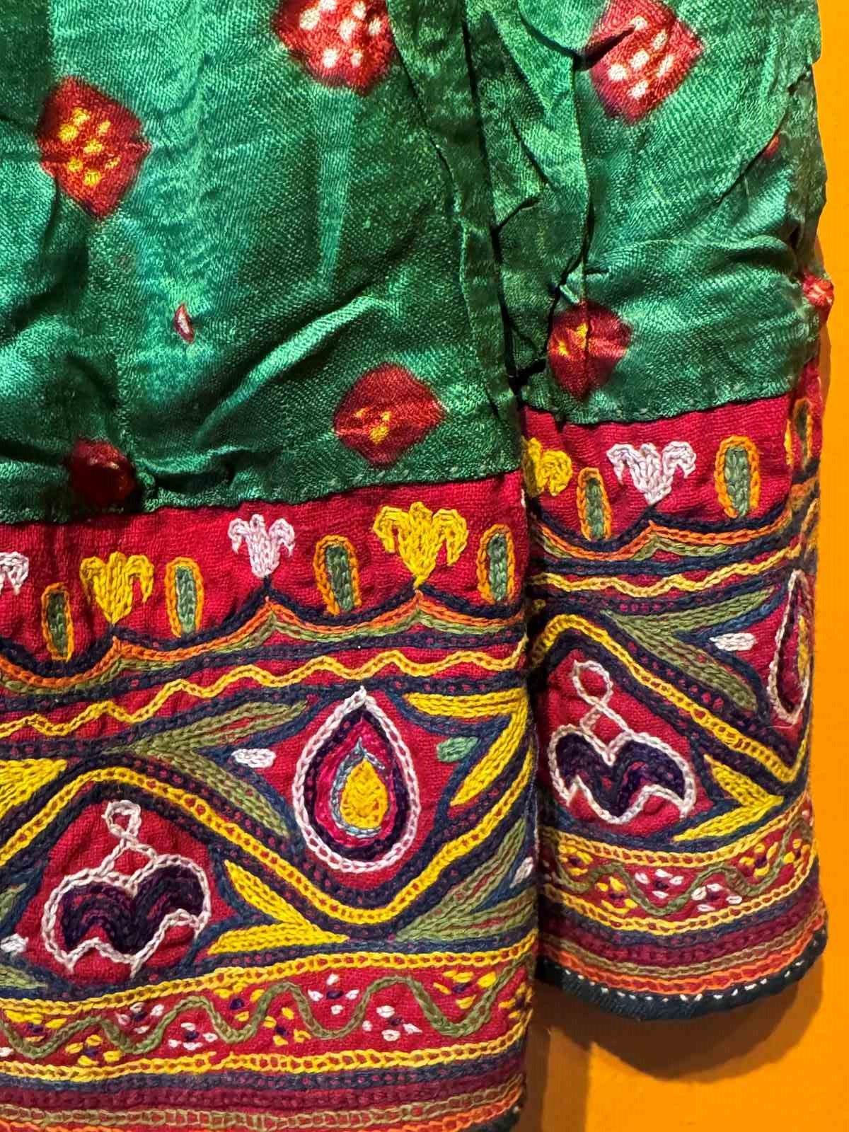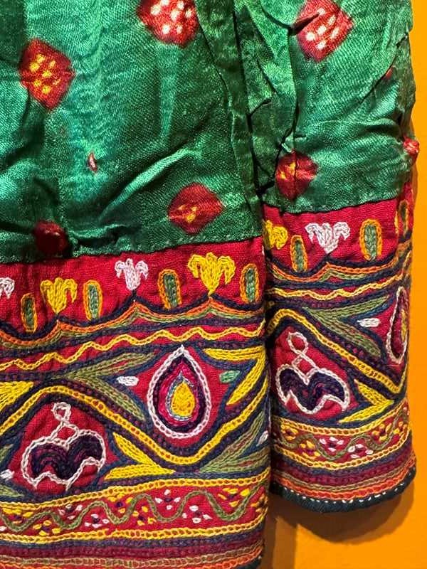 A Vintage Indian hand-embroidered child's dress from the Kutch region of Gujarat, probabaly from the nomadic Rabari tribe. The Bandhani (tie-dyed) green fabric with Shisha-work (mirror-work) embroidery to the bodice, cuffs and hem.