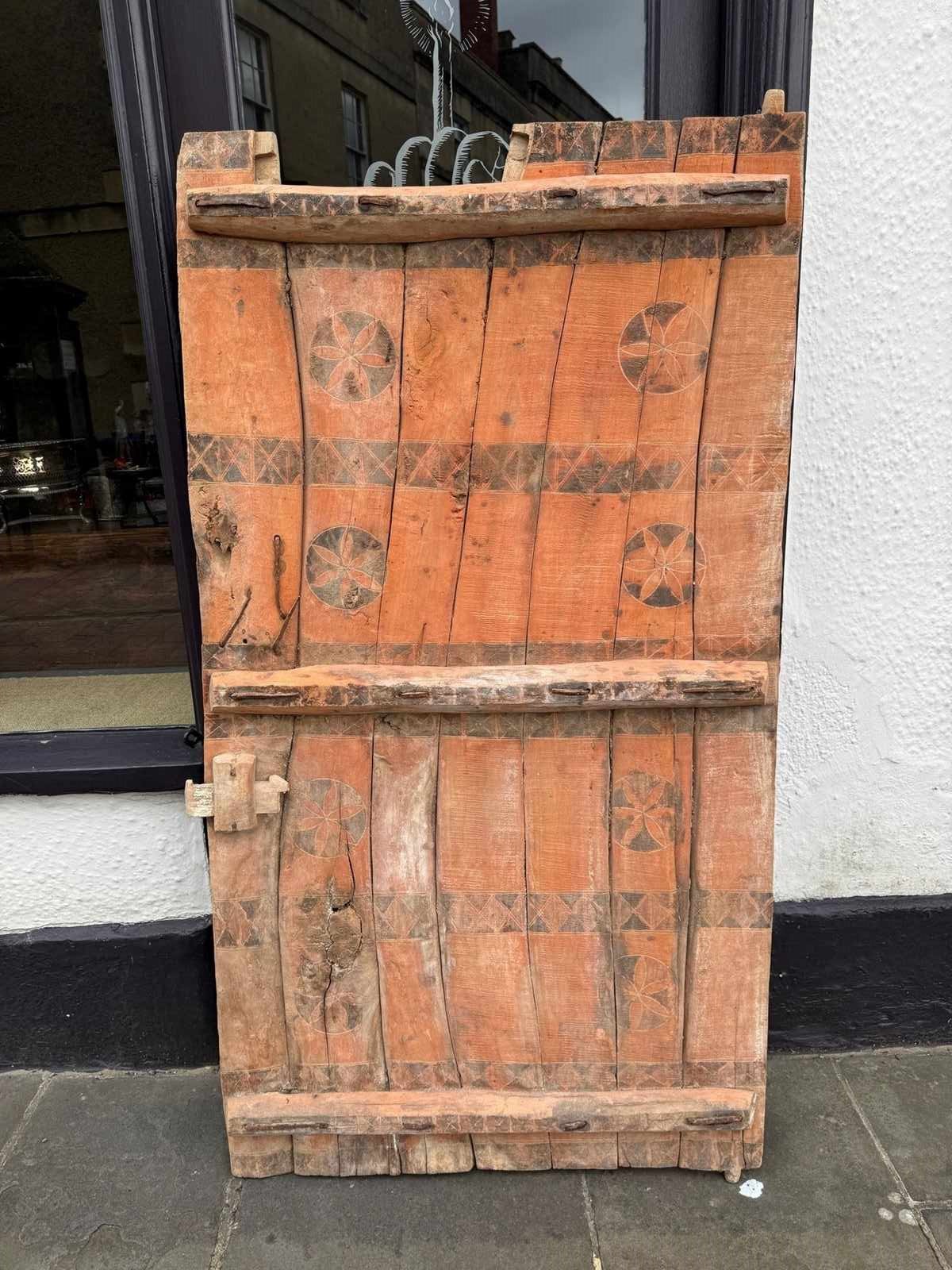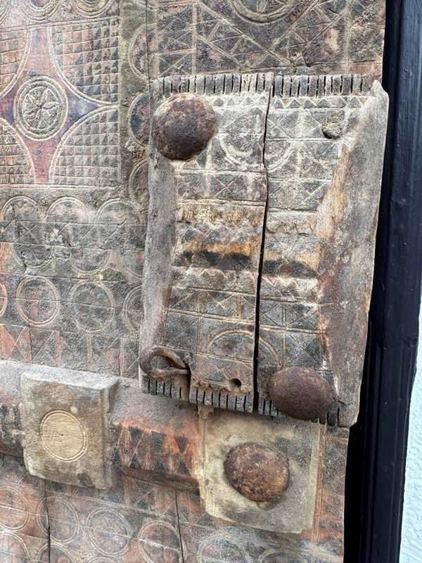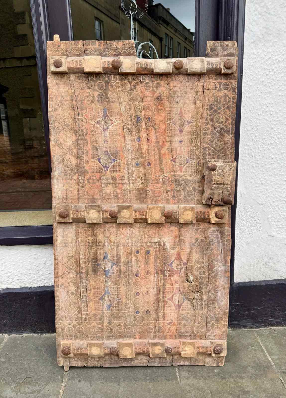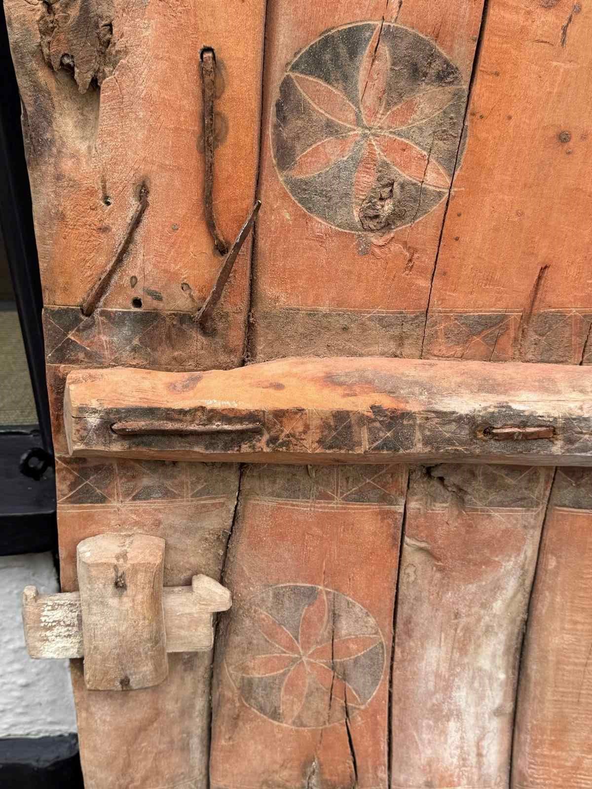 A Vintage Morrocan Berber door, with an overall intricate incised and stained design of 'daisy wheels', concentric circles and geometric motifs, the reverse incised with daisy wheels and cross-hatched banding on a red ochre stained ground, with wooden lockplate and dome head iron nails.