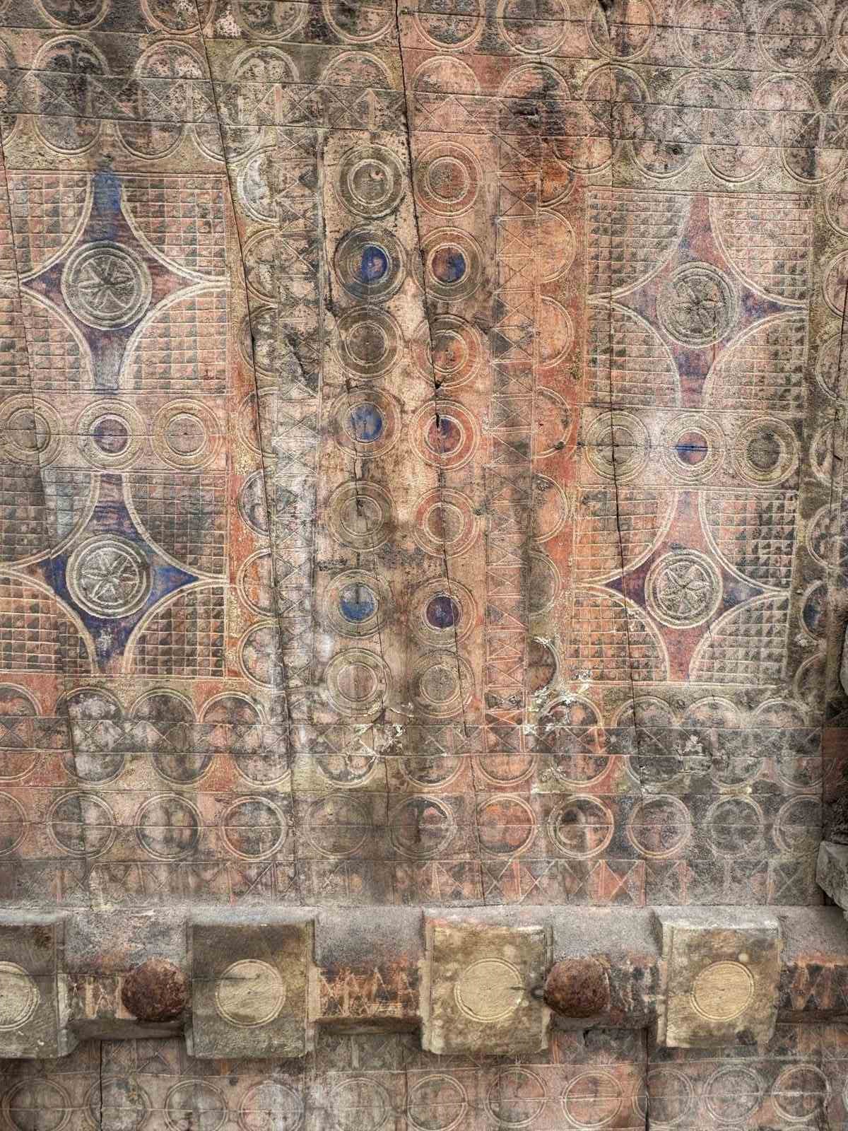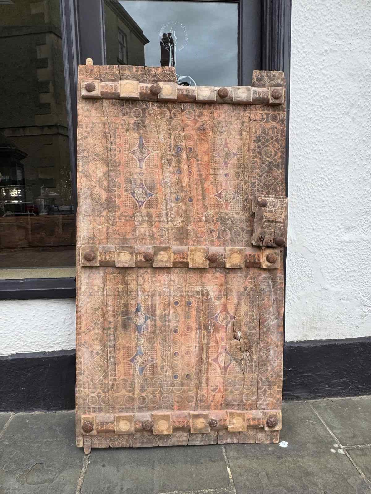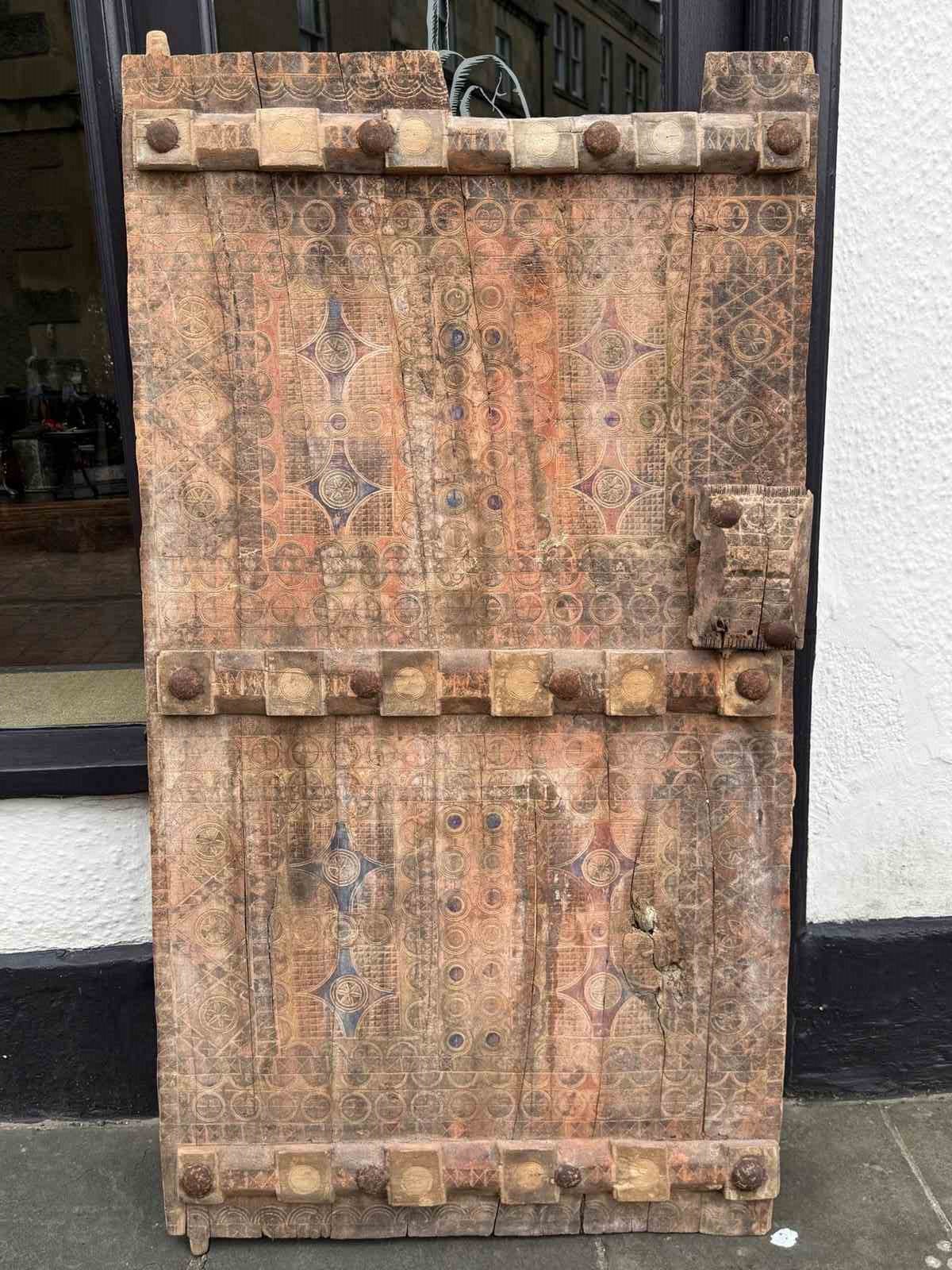 A Vintage Morrocan Berber door, with an overall intricate incised and stained design of 'daisy wheels', concentric circles and geometric motifs, the reverse incised with daisy wheels and cross-hatched banding on a red ochre stained ground, with wooden lockplate and dome head iron nails.