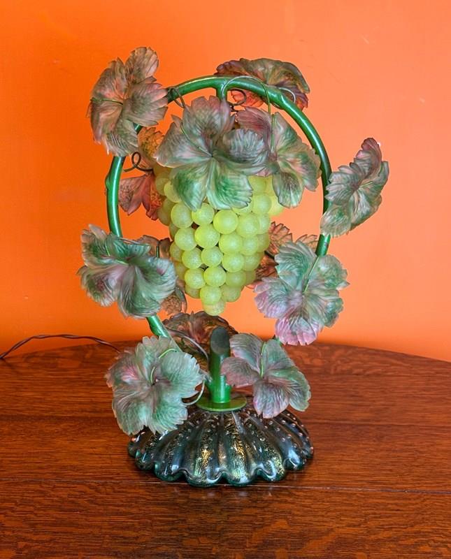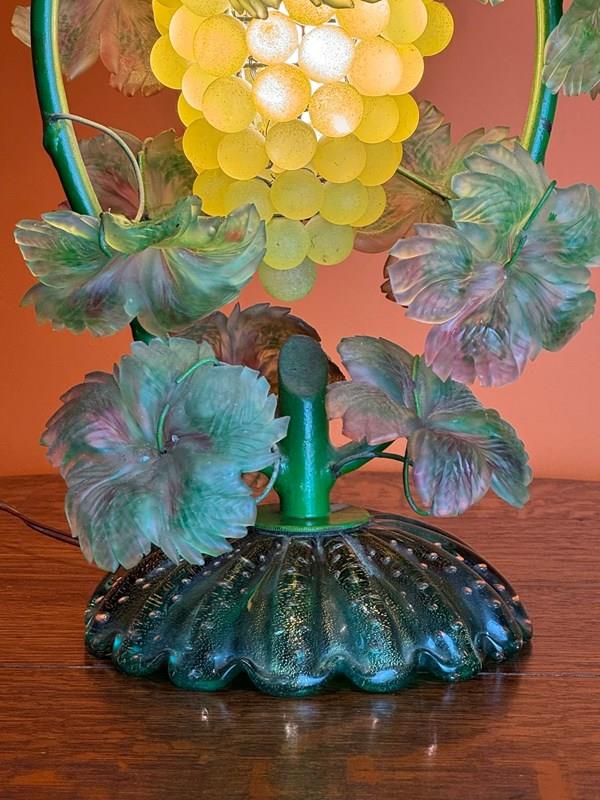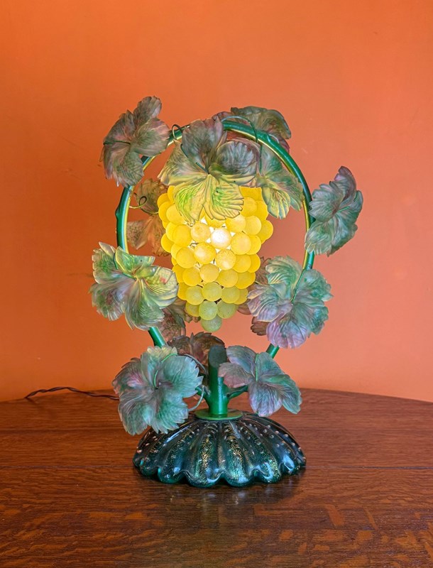 A vintage Murano glass fruit lamp, circa 1960, the green painted metal frame hung with a bunch of grapes and applied with frosted glass leaves, raised on a green aventurine domed and lobed base.
