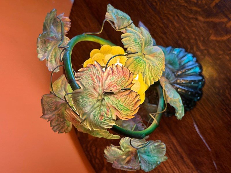 In good condition overall, a few of the leaves are chipped. The bulb contained within the bunch of grapes.