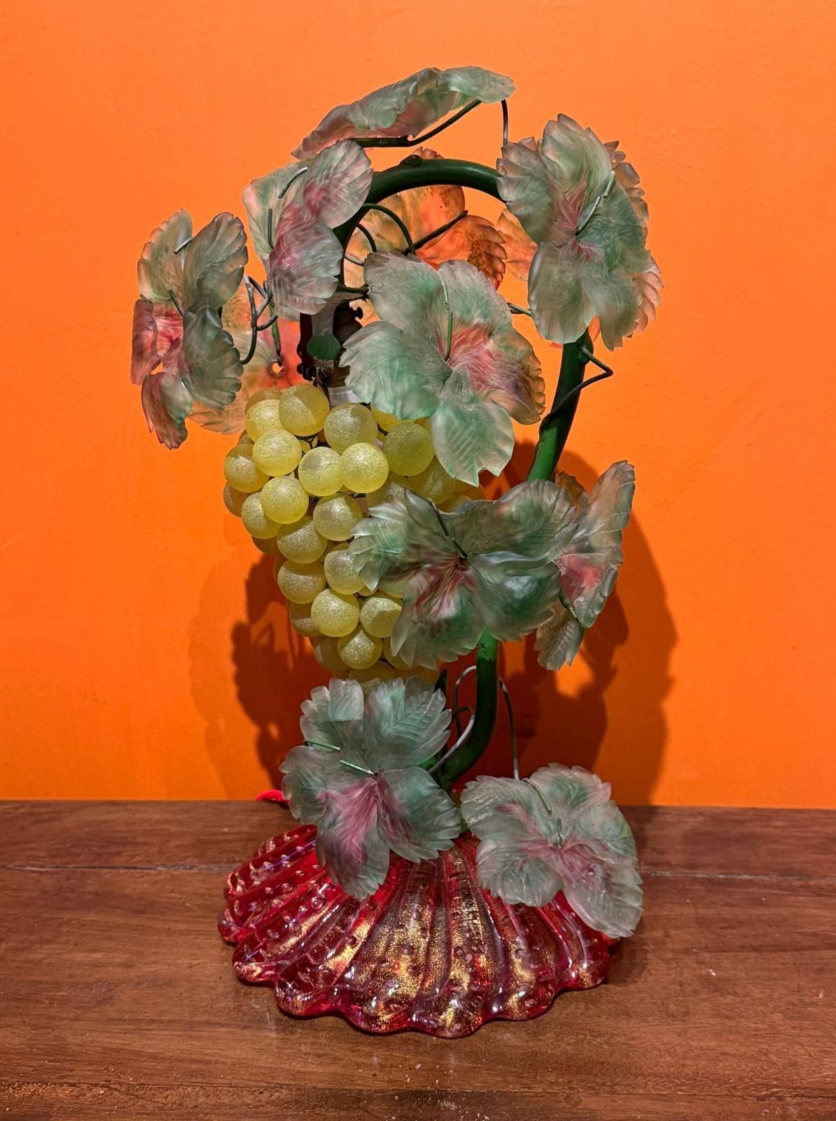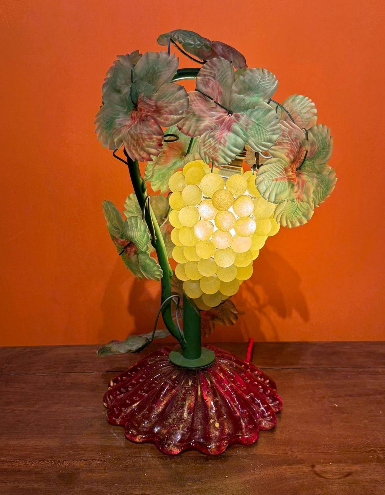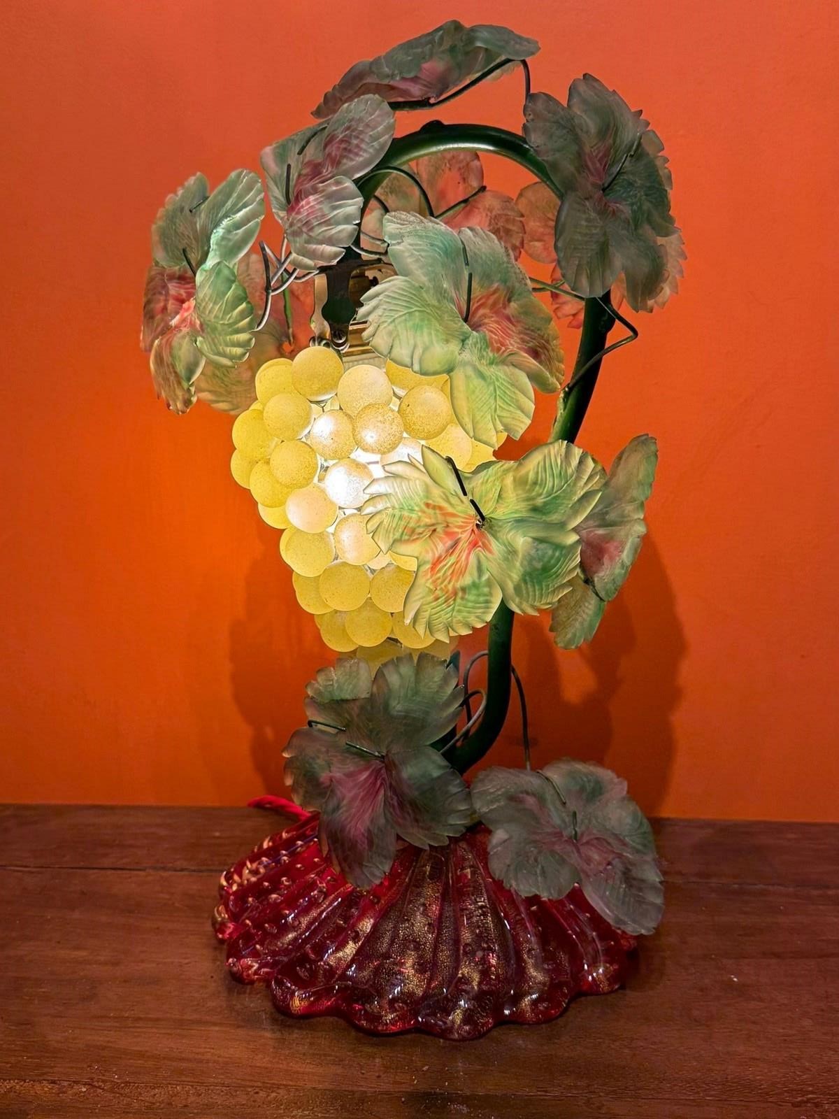 A vintage Murano glass fruit lamp, circa 1960, the green painted metal frame hung with a bunch of grapes and applied with frosted glass leaves, raised on a red aventurine domed and lobed base.