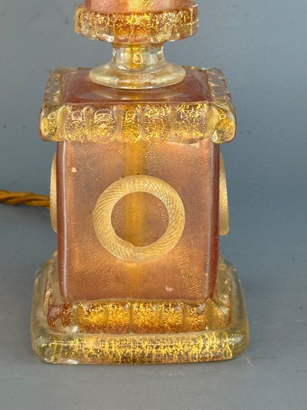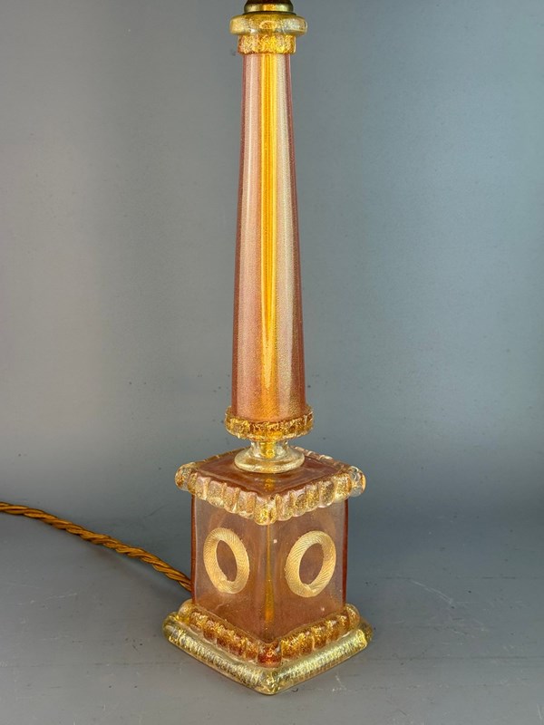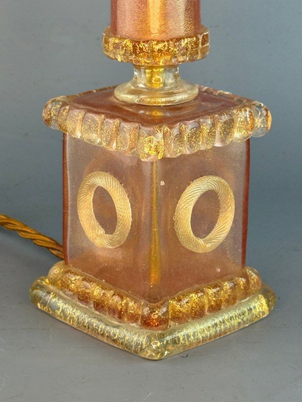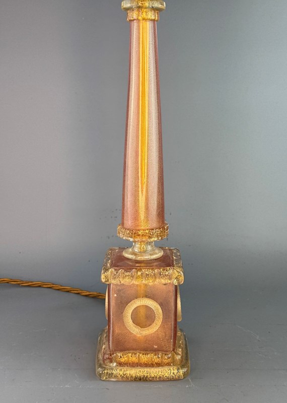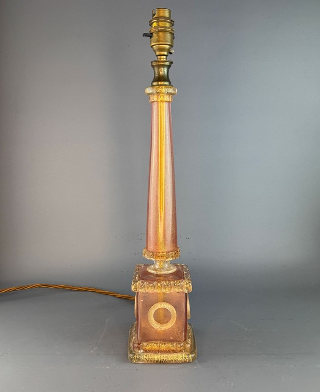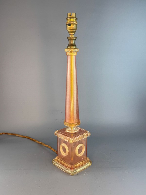 A Vintage Italian Murano glass column table lamp, in the manner of Barovier & Toso, the pink glass with gold flecks, of cylindrical tapering form upon a square pedestal base, re-wired with gold cloth covered flex.