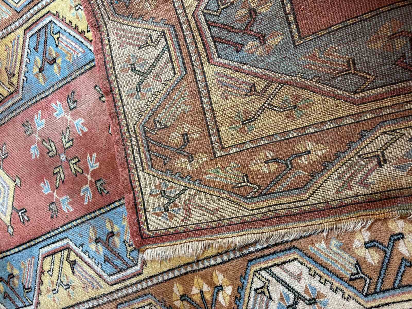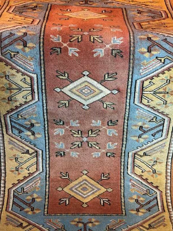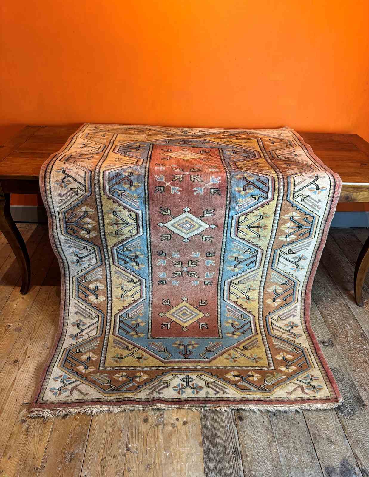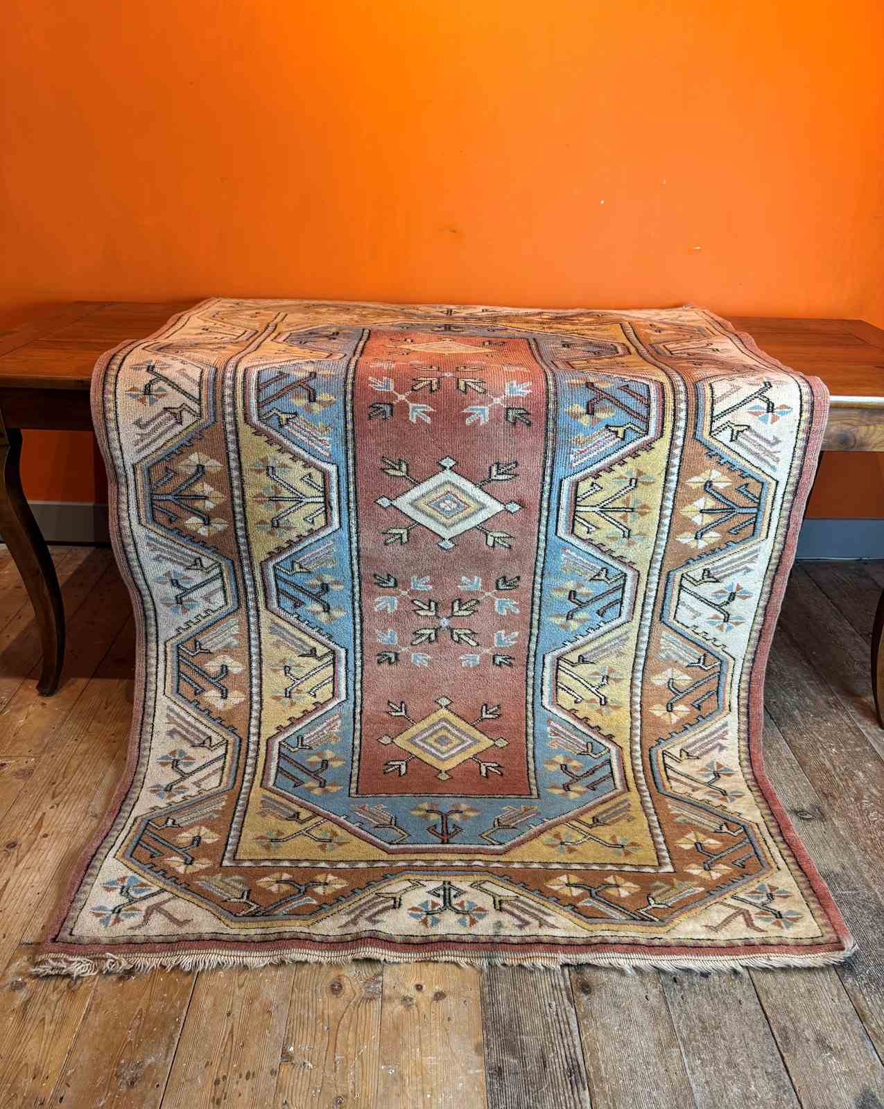 A Vintage Turkish hand-knotted wool rug, in soft shades of rose, turquoise and beige, the central field with three medalions.