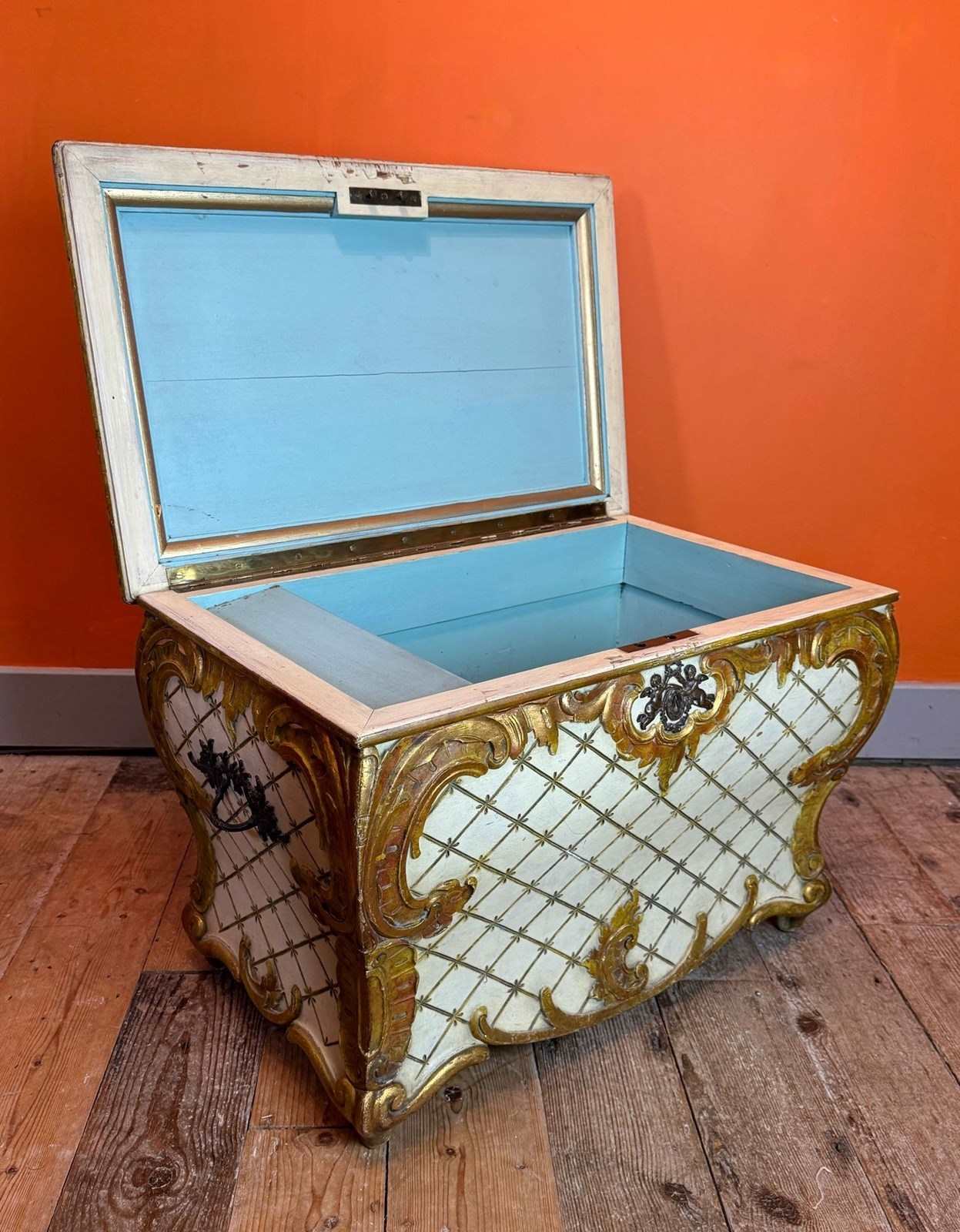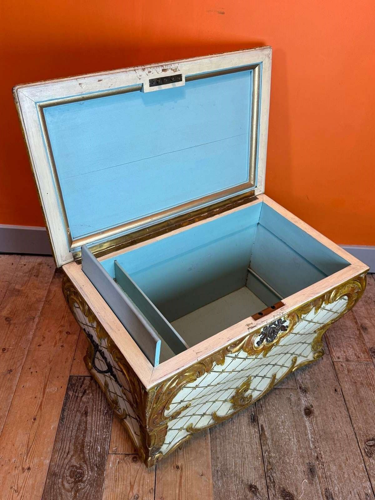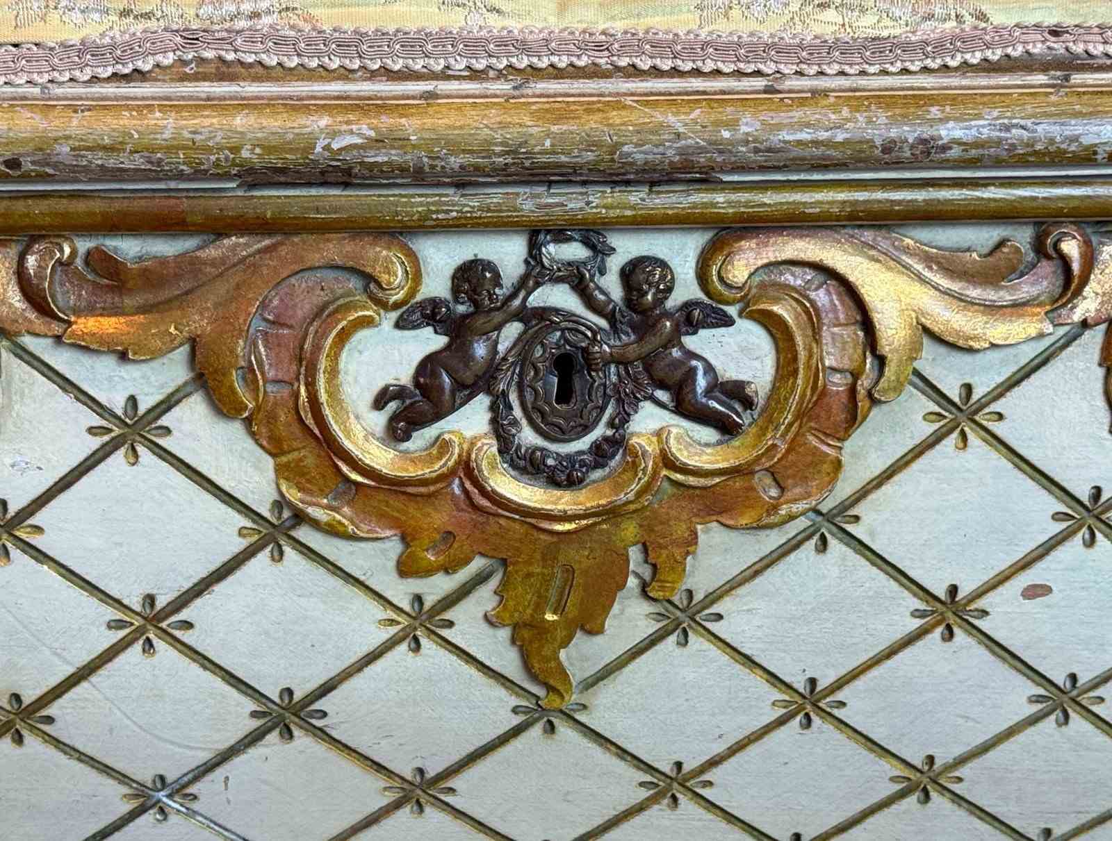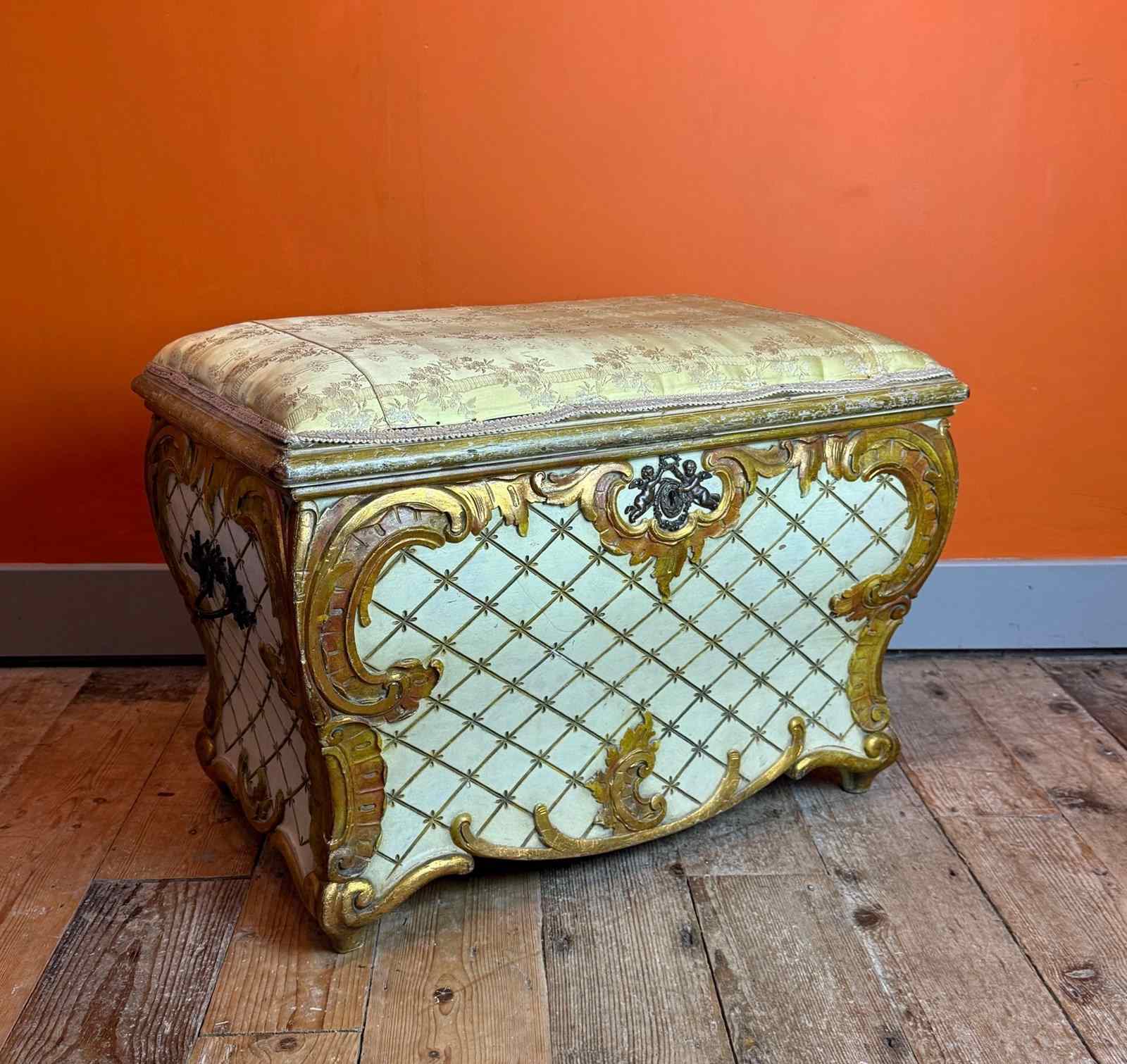 A very pretty Vintage Venetian painted & gilt bombe shaped ottoman in Rococo style, circa1950, with incised cross-hatched decoration centred with a star and with gilt gilt Rococo scroll mouldings, with upholstered seat, brass side handles and cherub lockplate.