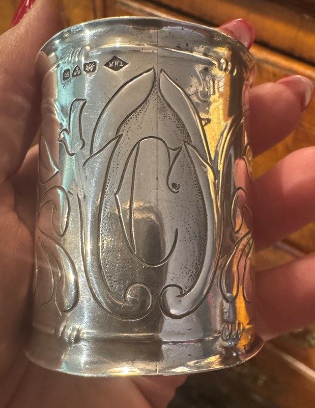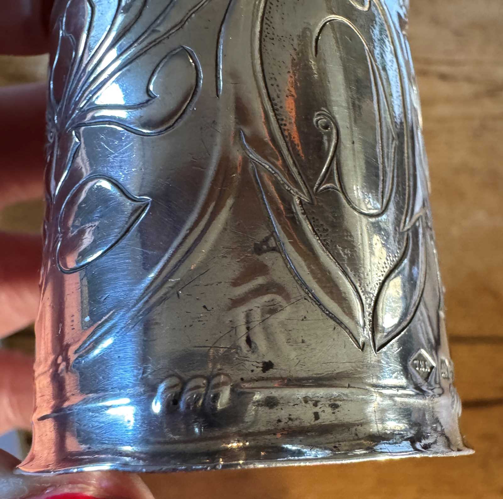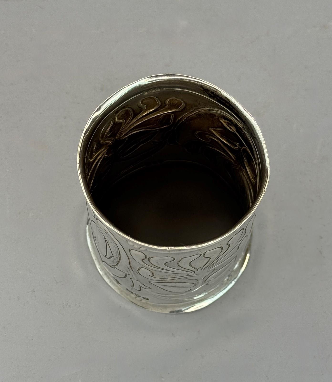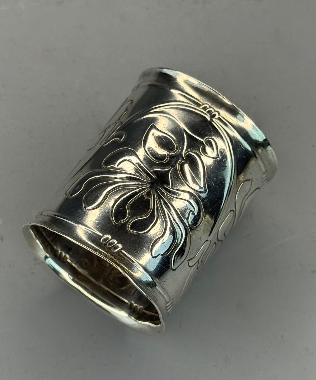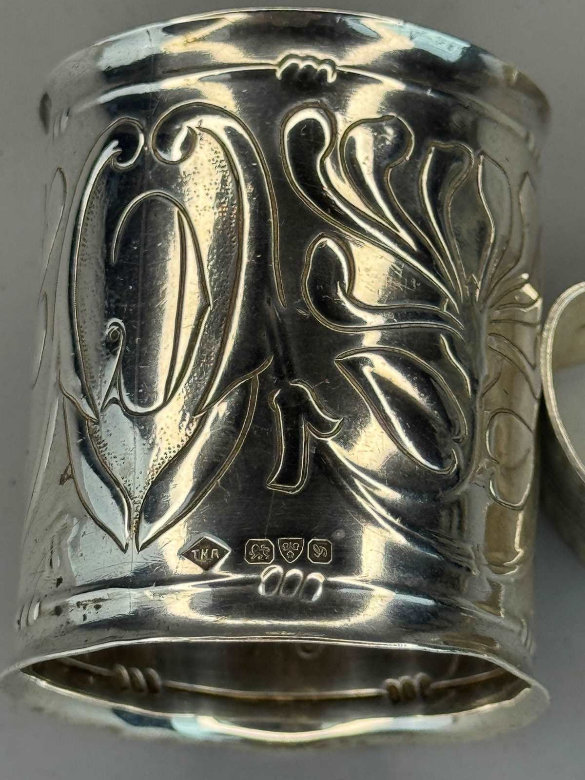 A rare Welsh Art Nouveau silver napkin ring by Thomas Henry Rothwell, with continuous repousse decoration of flowerheads in typical Art Nouveau style and engraved with the initial 'C' with everted rims. Bearing hallmarks for Chester 1907, markers mark and also stamped in reverse with the initials 'TR'.