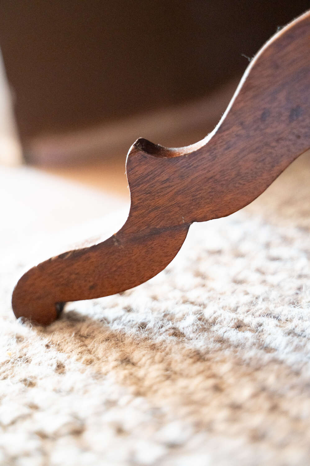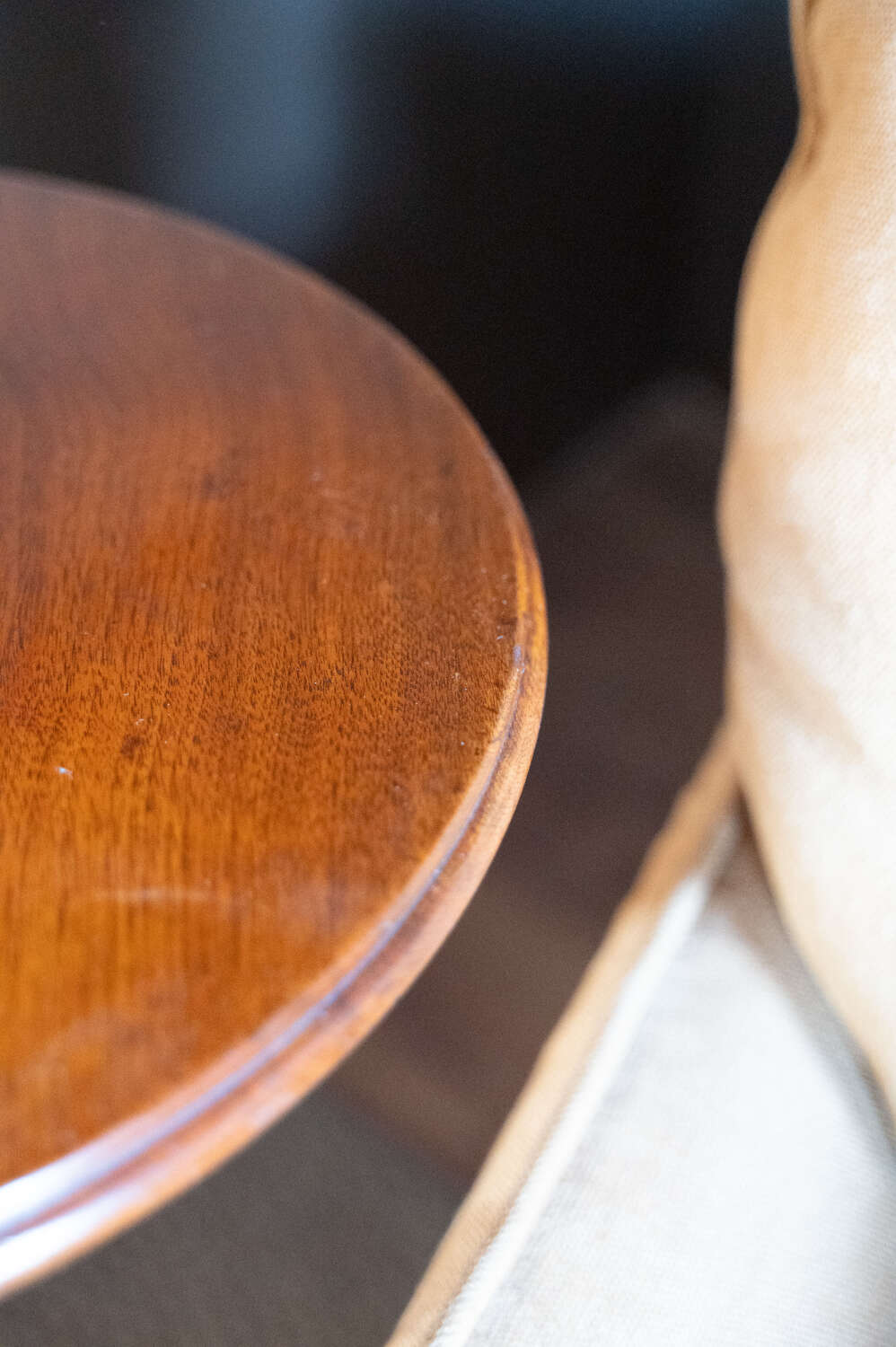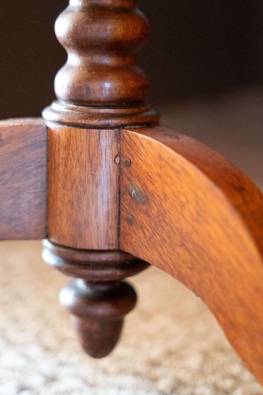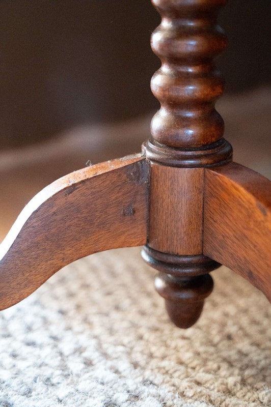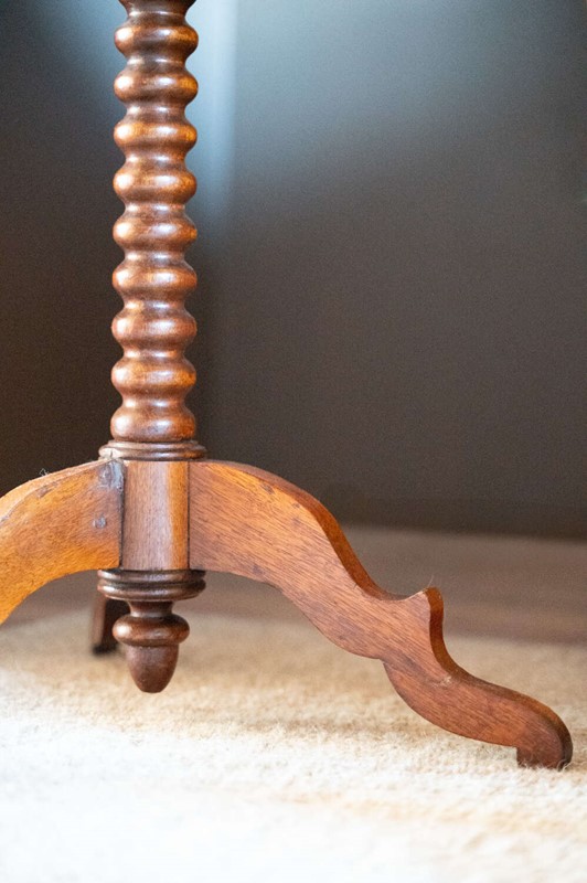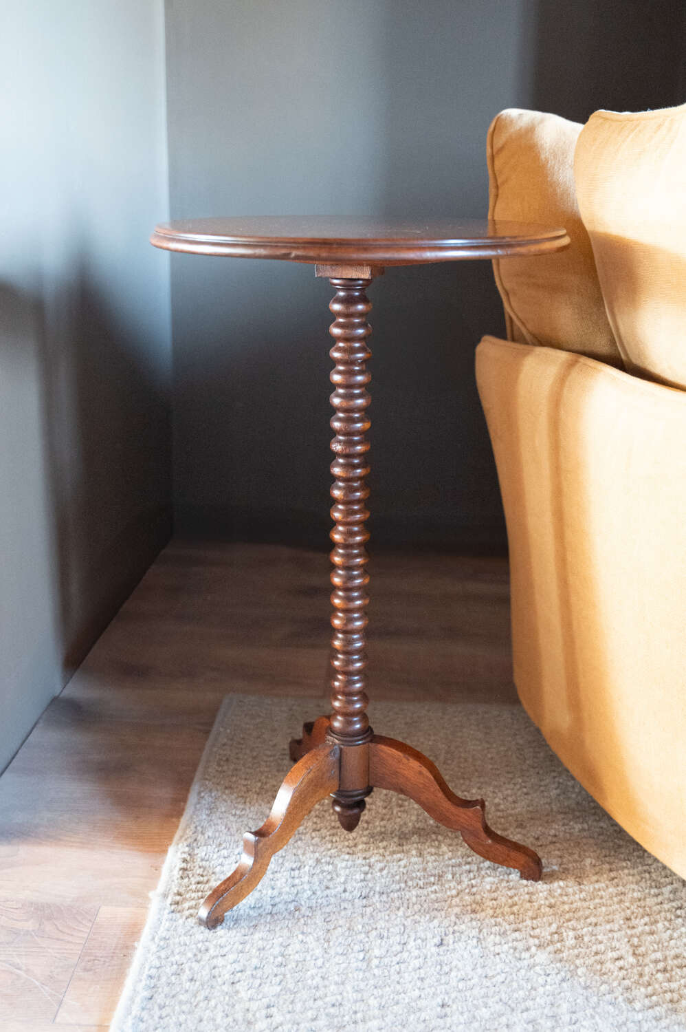 A charming antique side table with turned bobbin detailing and a classic tripod base. The rhythmic shaping of the legs gives it a decorative edge, while the overall form remains simple and well balanced. The timber carries a warm, time-softened tone with natural character throughout, making it an easy piece to place beside a chair, in a hallway, or layered into a country interior. There have been historic repairs to the legs, visible in the photographs, which have been carefully carried out and do not detract from the overall look or usability of the table. A piece with gentle age and a lovely sense of history.Measurements: 74cm Tall x 44cm Wide x 44cm Deep