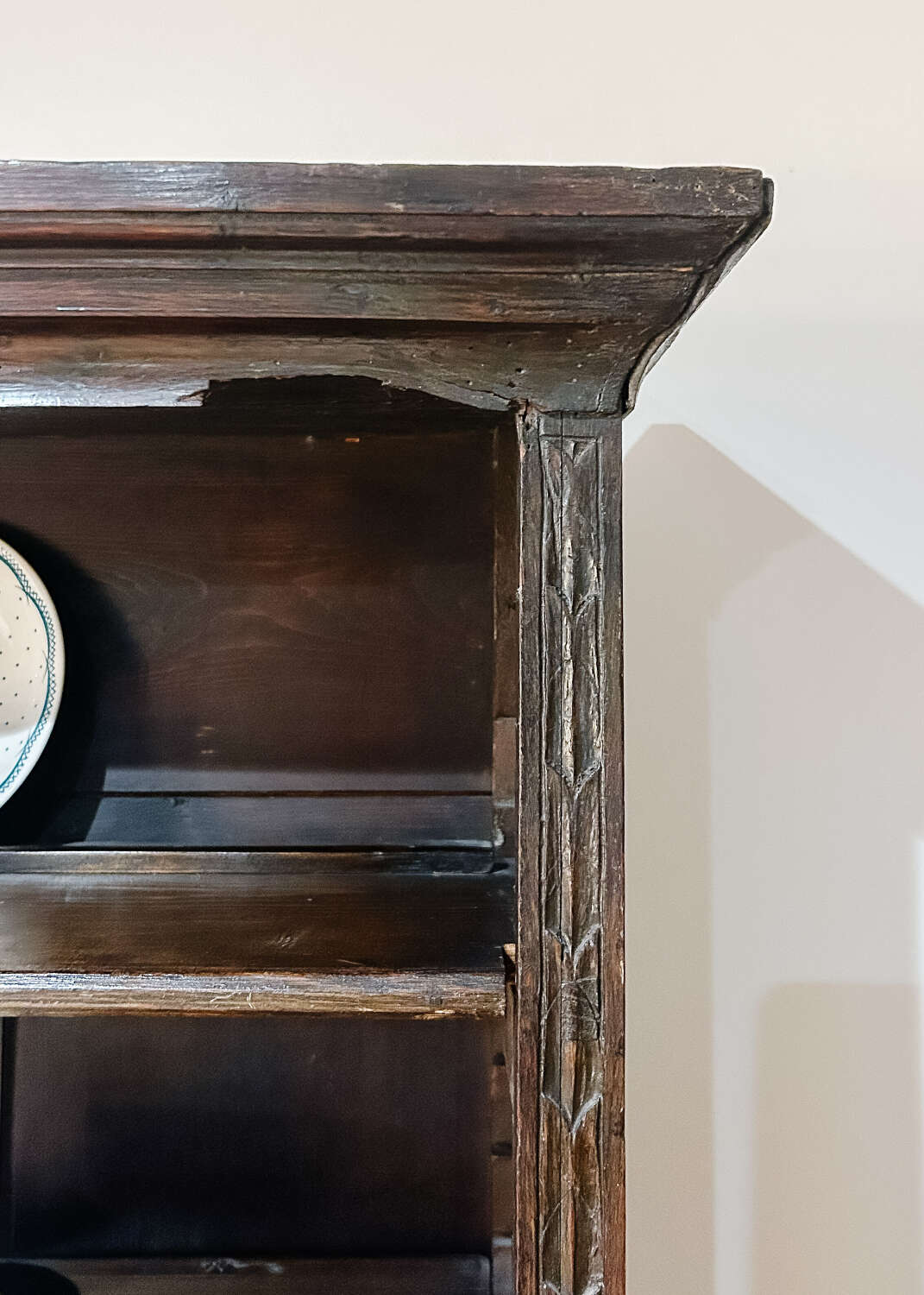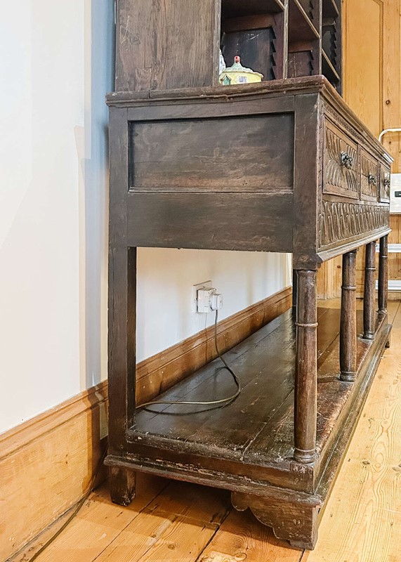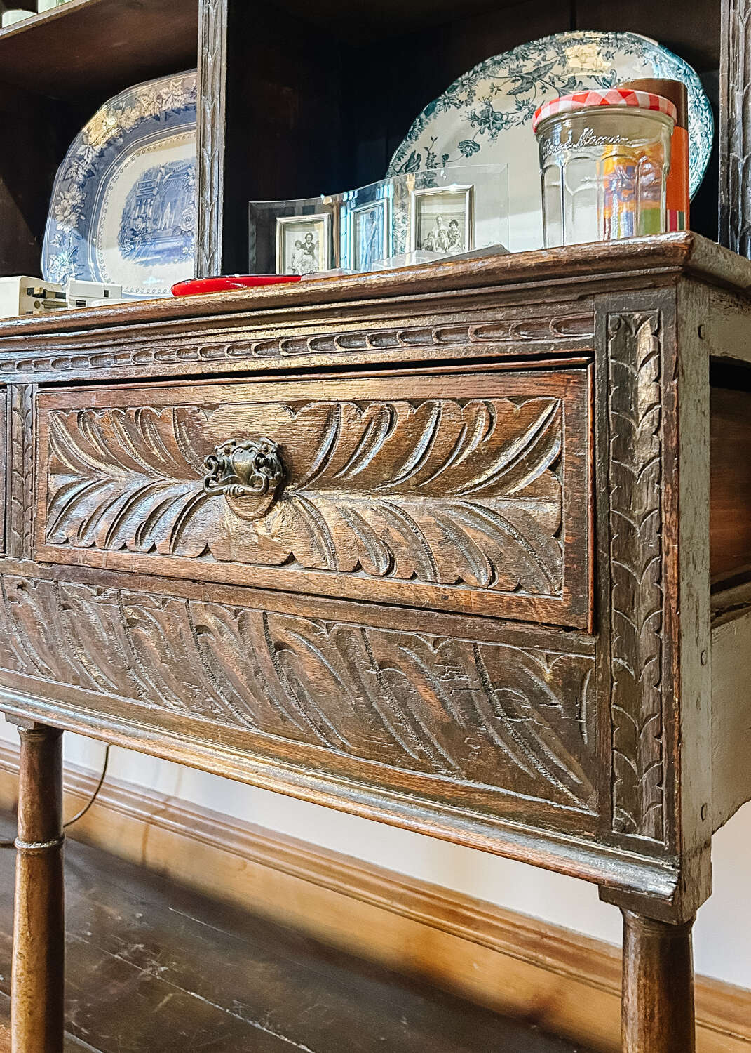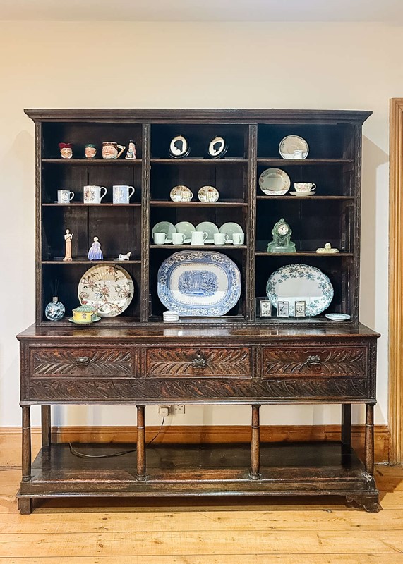 A handsome antique Welsh dresser in dark oak, rich in tone and full of quiet character. The carved drawer fronts add depth and decorative interest without overwhelming the piece, giving it a grounded, architectural feel. The upper section features adjustable shelving, making it both practical and adaptable — ideal for displaying pottery, books or everyday kitchenware. Below, the drawers and cupboard offer useful storage, balancing beauty with function. The oak has aged well, with surface character and gentle variations that speak to its history and bring warmth to the piece. A substantial, timeless dresser that sits comfortably in farmhouse, cottage or country interiors. This piece is currently located at a client’s home and will require a short period with us for final preparation before dispatch. Collection and the necessary work will be arranged promptly following purchase.Measurements: 193.5cm Tall (85cm counter height) x 173cm Wide x 44.5cm Deep (23cm Top section depth)