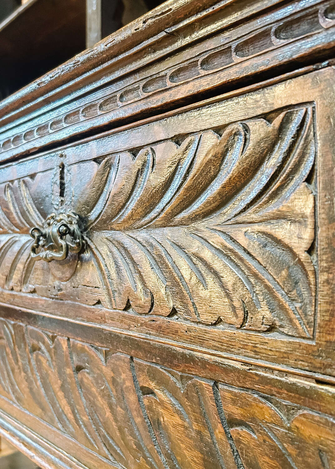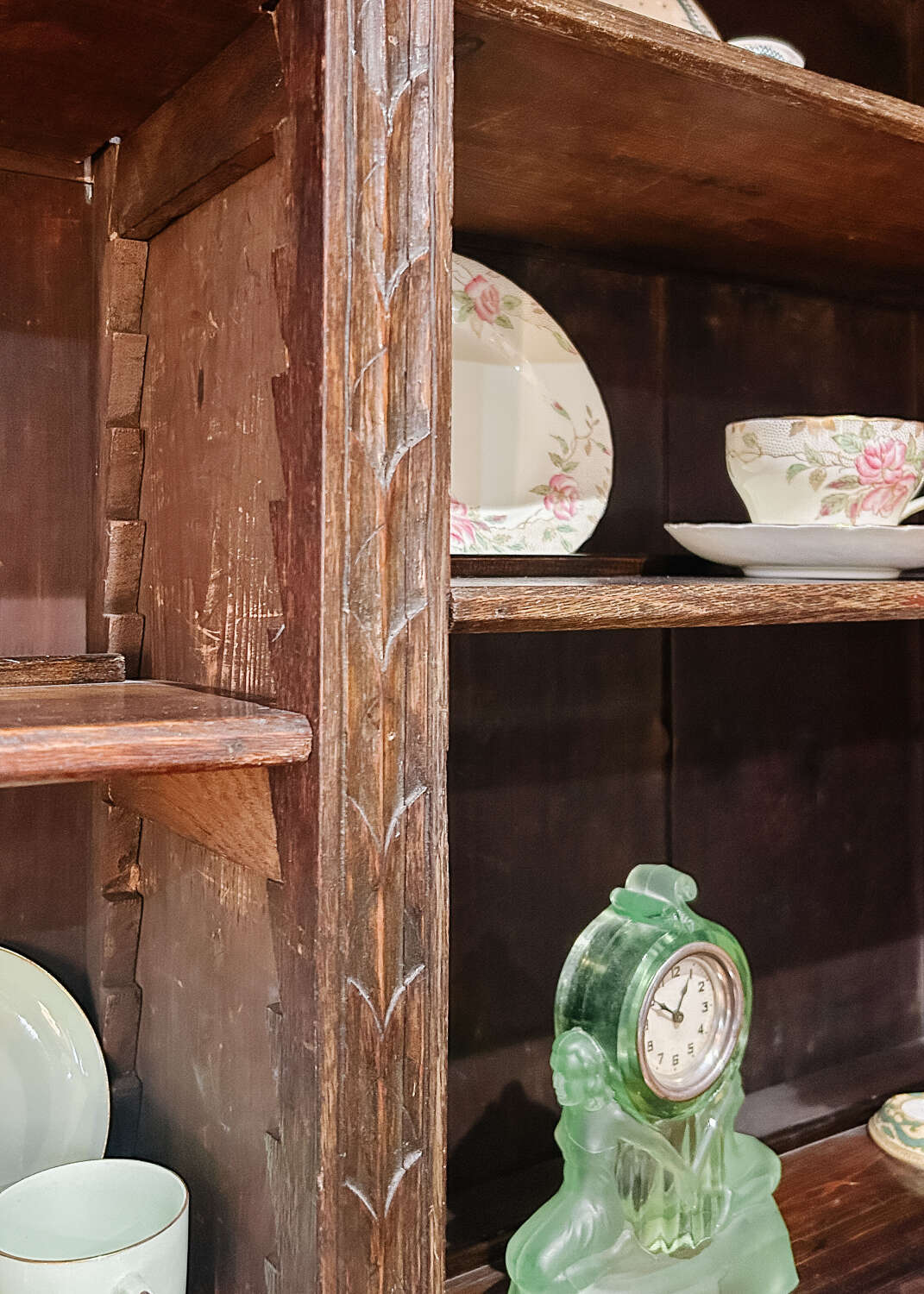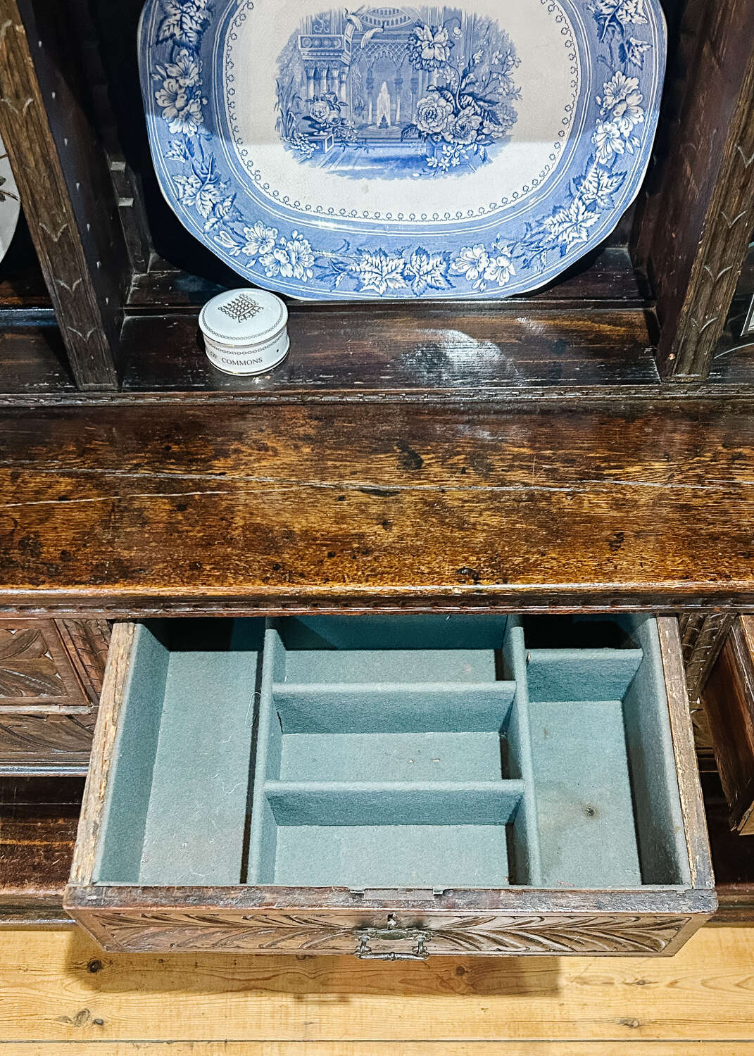 A handsome antique Welsh dresser in dark oak, rich in tone and full of quiet character. The carved drawer fronts add depth and decorative interest without overwhelming the piece, giving it a grounded, architectural feel. The upper section features adjustable shelving, making it both practical and adaptable — ideal for displaying pottery, books or everyday kitchenware. Below, the drawers and cupboard offer useful storage, balancing beauty with function. The oak has aged well, with surface character and gentle variations that speak to its history and bring warmth to the piece. A substantial, timeless dresser that sits comfortably in farmhouse, cottage or country interiors. This piece is currently located at a client’s home and will require a short period with us for final preparation before dispatch. Collection and the necessary work will be arranged promptly following purchase.Measurements: 193.5cm Tall (85cm counter height) x 173cm Wide x 44.5cm Deep (23cm Top section depth)