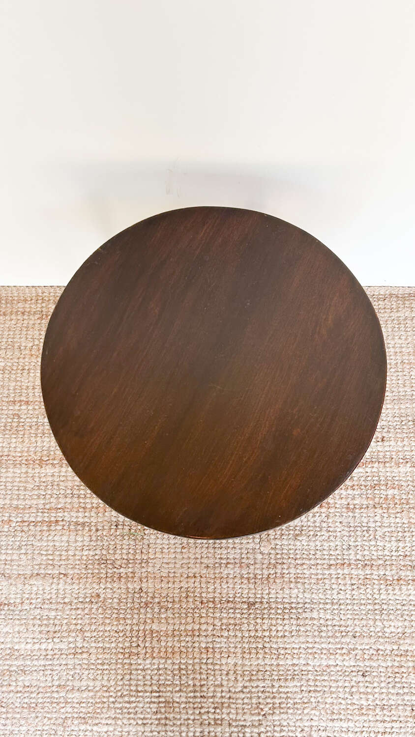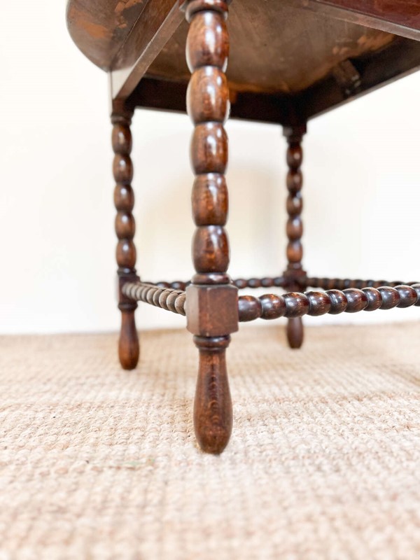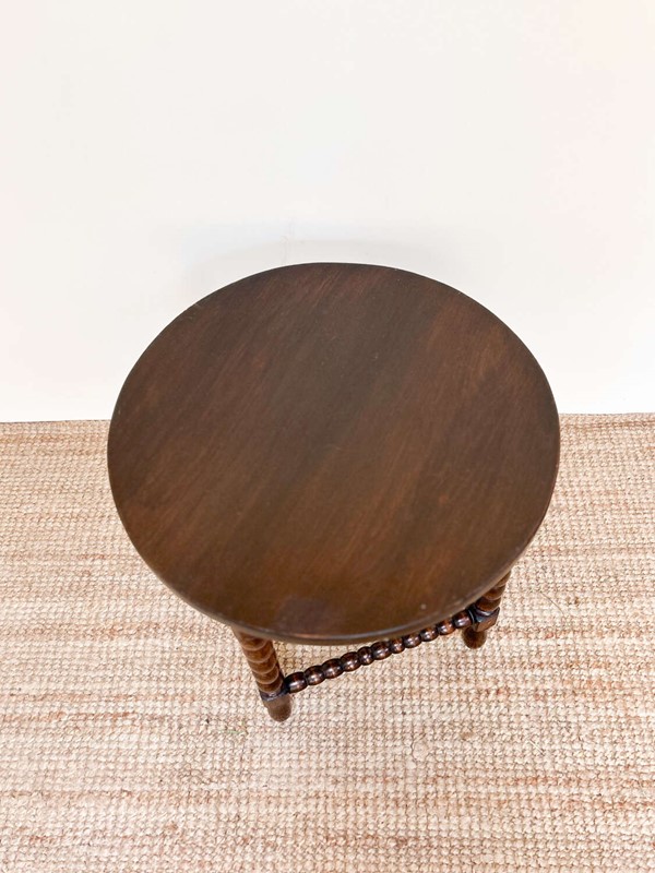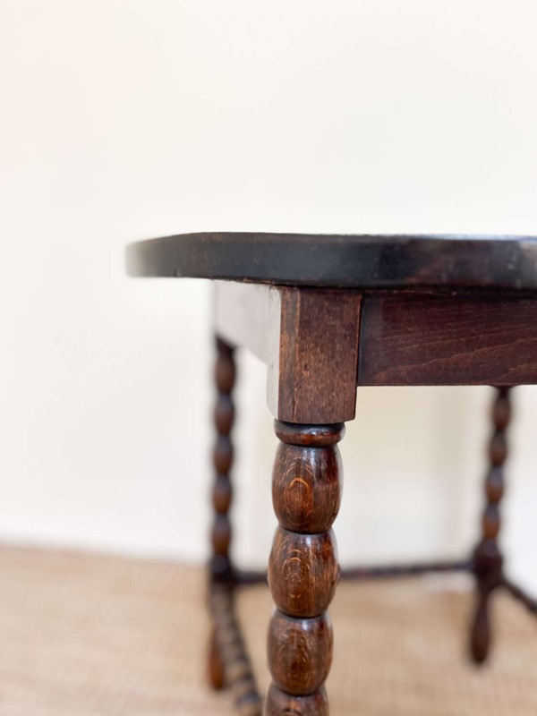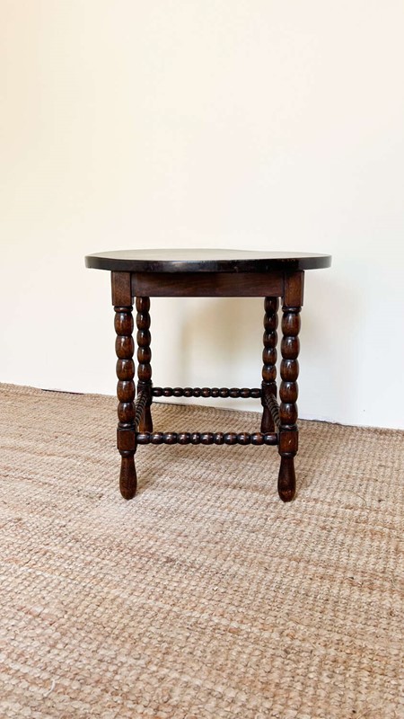 A characterful antique oak side table featuring beautifully turned bobbin legs and a round top with a rich, aged patina. Solid and well-balanced with four sturdy legs, this piece brings both style and substance to any interior.The top has a gentle, natural bow—a subtle sign of age that adds to its charm and authenticity. It’s the kind of imperfection that tells a story, reminding you this piece has been loved and lived with for generations.Perfect as a side table, lamp table, or even a plant stand, it’s a versatile piece that adds warmth and texture to period and modern homes alike. The bobbin detailing adds that unmistakable decorative flair typical of late 19th to early 20th-century design.A timeless accent that celebrates craftsmanship and character in equal measure.Measurements:45cm Tall x 46.5cm Wide x 47.5cm Deep