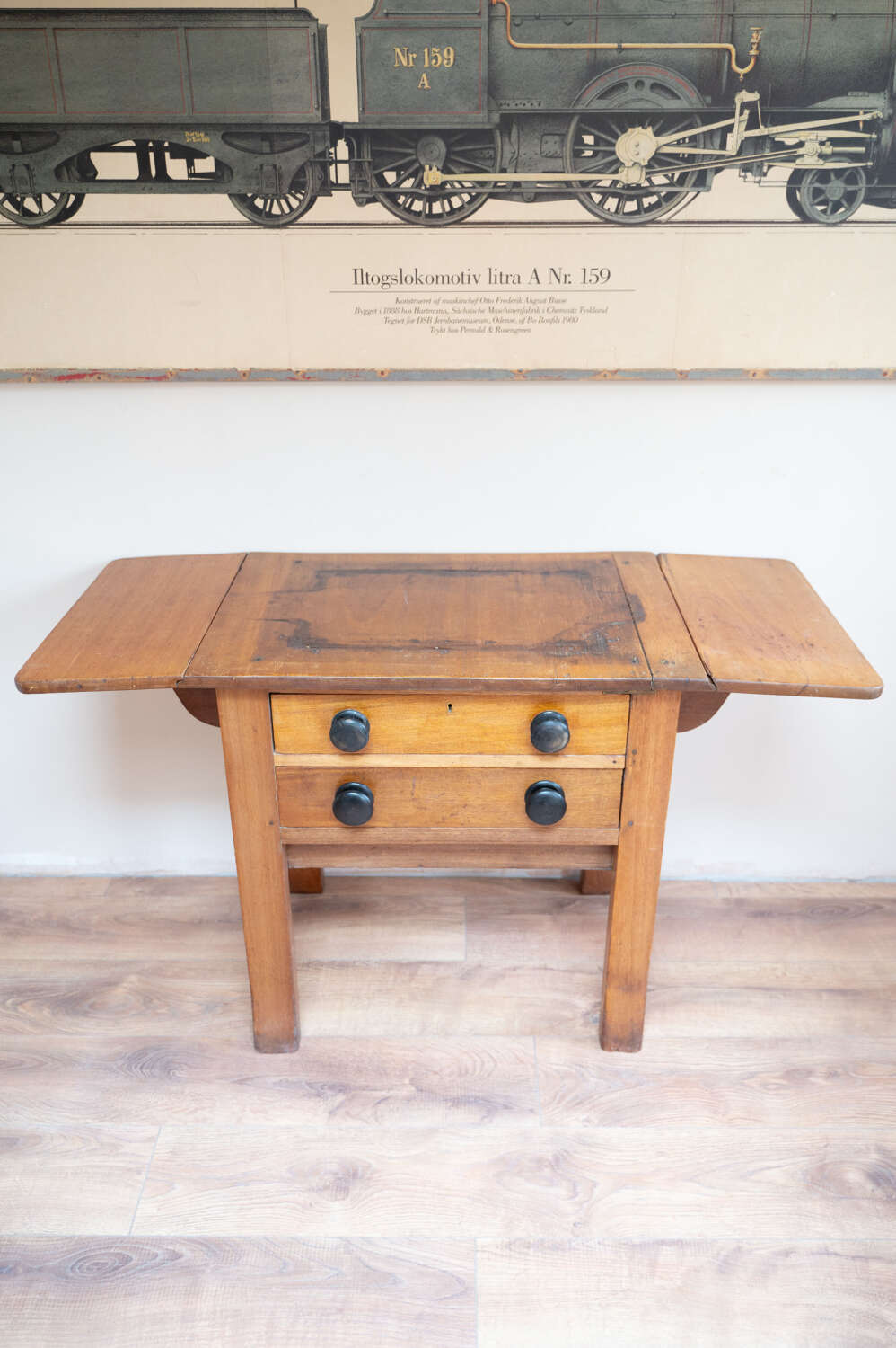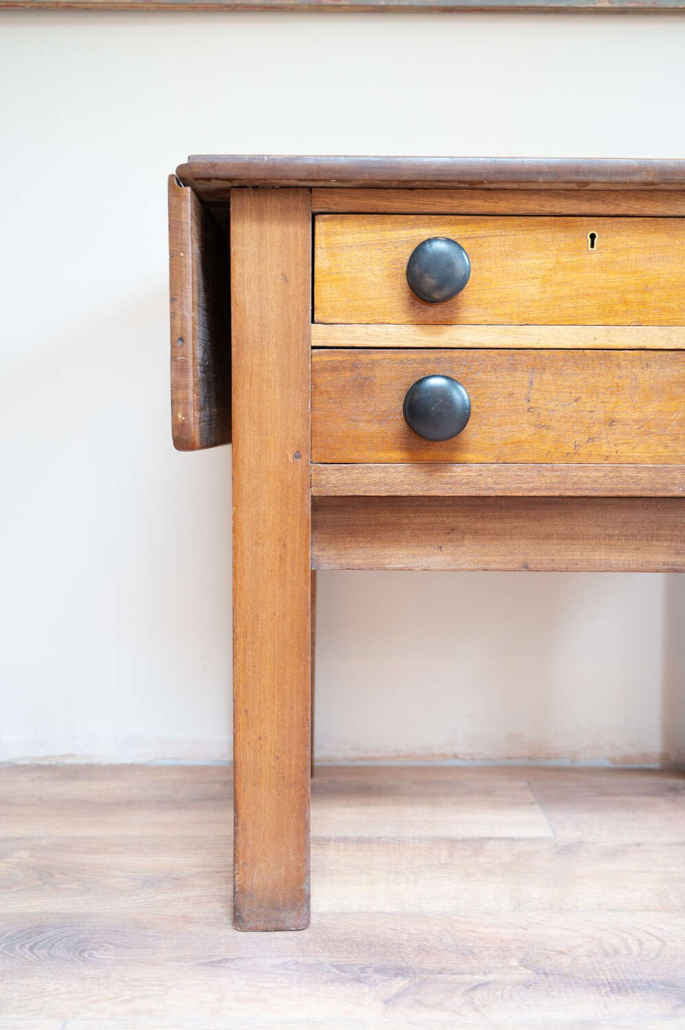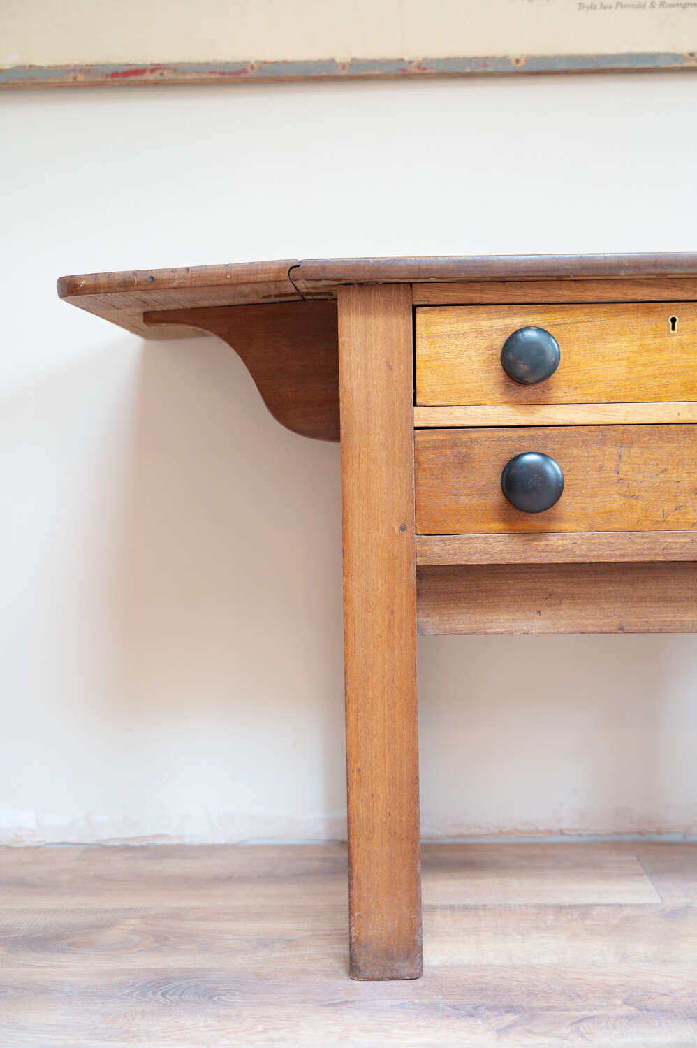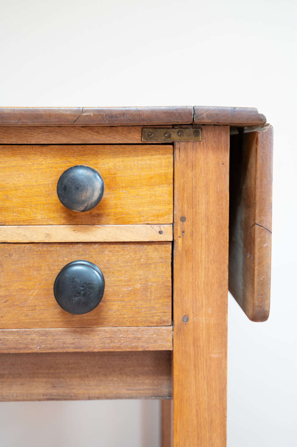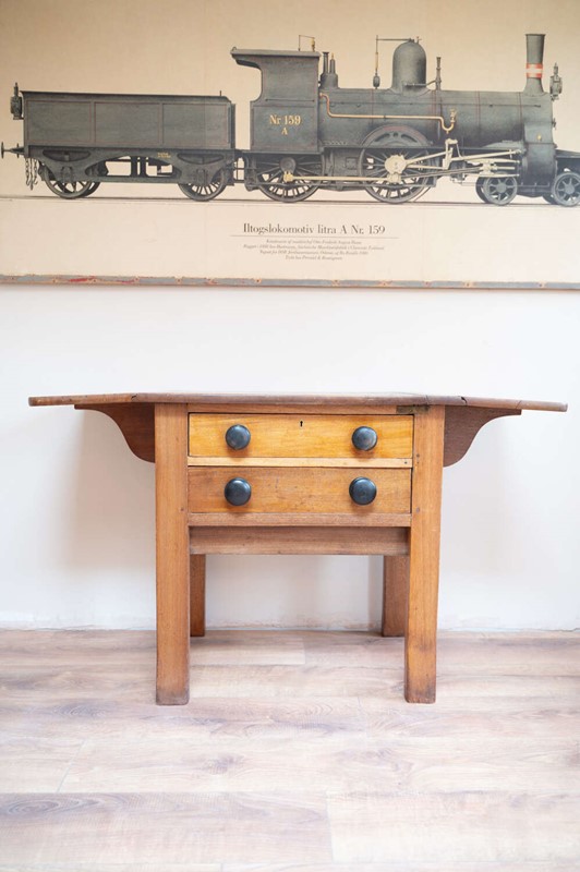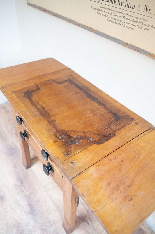 A beautifully characterful antique pine Side/prep table with drop leaf sides and a rich mix of tones across the surface. The variation in colour and wear gives it depth and a relaxed, timeworn feel. Fitted with darker knobs that contrast softly against the pine, and offering flexible use with the drop leaves, it works well as a kitchen prep table, console or occasional workspace. Full of patina and honest wear, this is a practical piece with real presence and versatility.Measurements: 73cm Tall x 77cm Wide (125cm with both leaves) x 50.6cm Deep