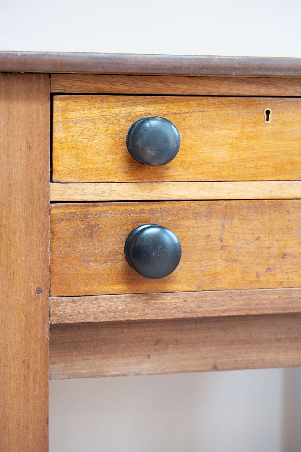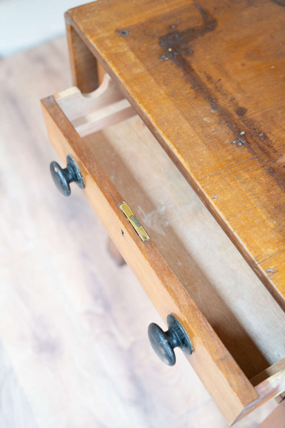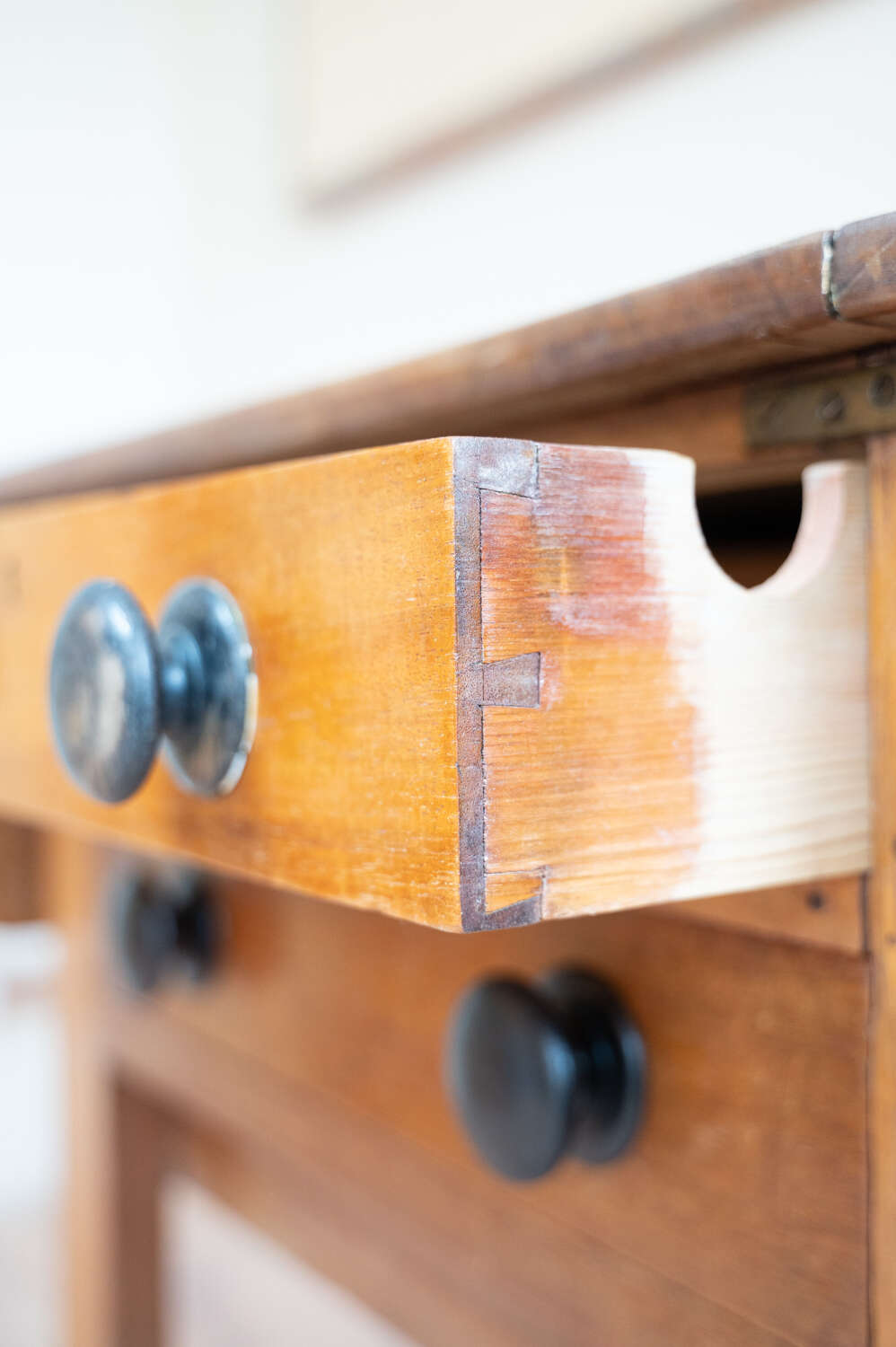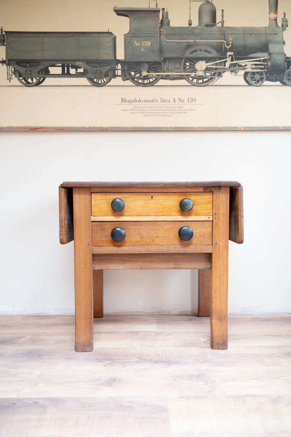 A beautifully characterful antique pine Side/prep table with drop leaf sides and a rich mix of tones across the surface. The variation in colour and wear gives it depth and a relaxed, timeworn feel. Fitted with darker knobs that contrast softly against the pine, and offering flexible use with the drop leaves, it works well as a kitchen prep table, console or occasional workspace. Full of patina and honest wear, this is a practical piece with real presence and versatility.Measurements: 73cm Tall x 77cm Wide (125cm with both leaves) x 50.6cm Deep