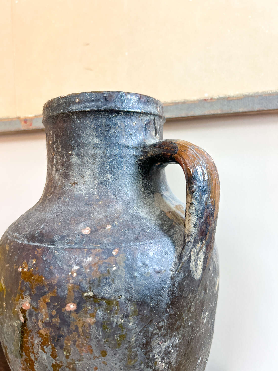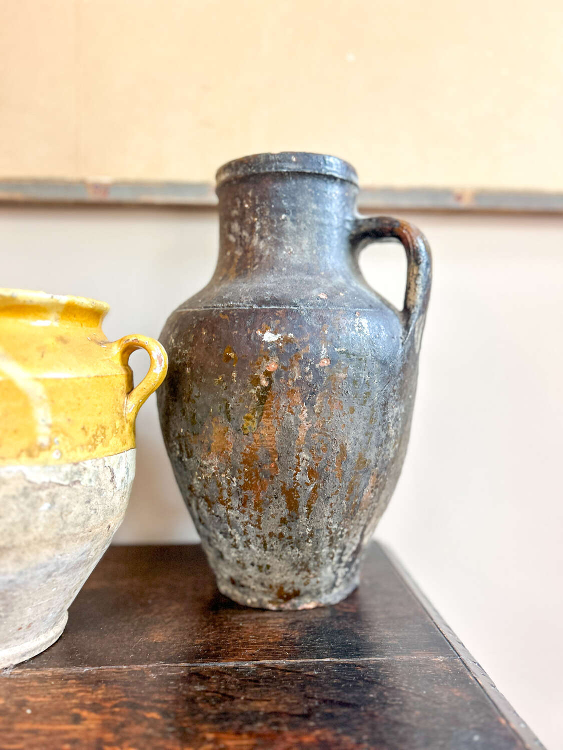 A beautiful antique terracotta vessel jug, full of rustic charm and timeworn character. Its warm earthy tones are enhanced by a unique patina, including a dried oil spill that has settled across the surface over time. Rather than detracting, this adds an authentic lived-in quality, speaking to the vessel’s history and past use. Perfect styled as a decorative piece on a console or shelf, or as part of a rustic farmhouse or Mediterranean-inspired interior. Its simplicity and imperfections give it a timeless appeal.Measurements: 31cm Tall x 21cm Wide x 19cm Deep (9cm opening)