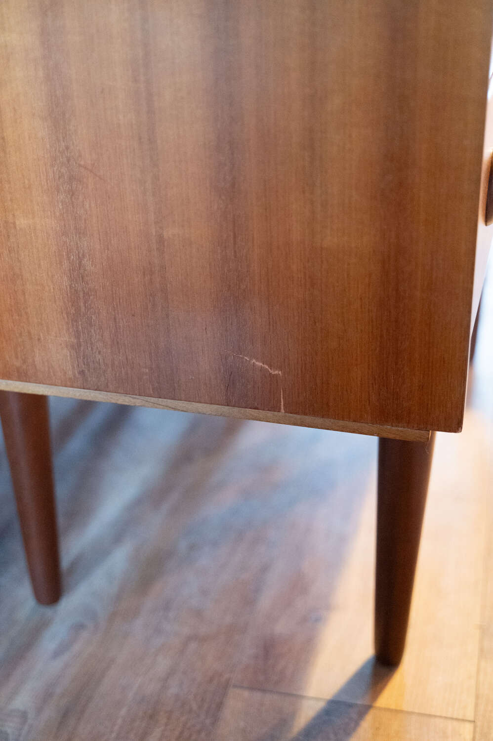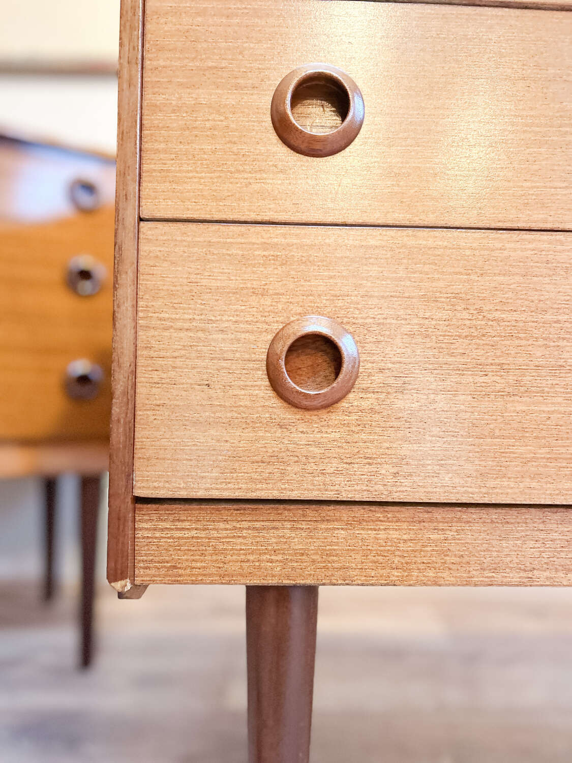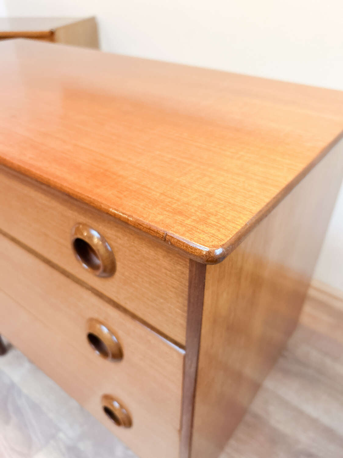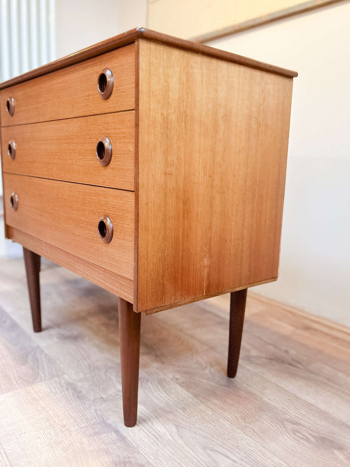 A well-proportioned vintage chest of drawers by Avalon, dating to the 1960s and crafted in beautifully figured teak. The design is confident and understated, with clean mid-century lines and a strong, balanced presence that suits both classic and contemporary interiors.The three generously sized drawers offer excellent storage within a solid, well-made frame. Removable legs add versatility, allowing the piece to adapt easily to different settings, whether in a bedroom, hallway or living space.Presented in good vintage condition, showing light, age-related wear that enhances the warmth and character of the teak while remaining fully practical for everyday use.A timeless piece of British mid-century furniture with enduring appeal.Measurements: 72cm Tall x 76.5cm Wide x 39cm Deep